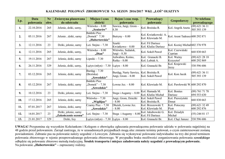KALENDARZ POLOWAŃ ZBIOROWYCH NA SEZON 2016/2017 WKŁ „ŁOŚ” OLSZTYN Lp. Data polowania Nr Zwierzyna planowana obw. do odstrzału 1. 22.10.2016 265 Jelenie, dziki, sarny, 2. 05.11.2016 267 Jelenie , dziki, sarny 3. 12.11.2016 23 Dziki, jelenie, sarny 4. 12.11.2016 265 Jelenie, dziki, sarny, 5. 19.11.2016 267 Jelenie, dziki, sarny 6. 26.11.2016 329 Jelenie, dziki, sarny, 7. 03.12.2016 265 Jelenie, dziki, sarny 8. 03.12.2016 267 Jelenie, dziki, sarny 9. 10.12.2016 23 10. 17.12.2016 265 11. 07.01.2017 267 12. 14.01.2017 23 13. 21.01.2017 329 Miejsce i czas zbiórki Rejon i czas rozp. polowania Witówko – 8.00 Sawica, Jurgi, Grom – 8.30 „Seniorów” Bałdzki Piec „Domek” 7.30 Butryny – 8.00 „Hubertowskie” Szarki Leś. Stejno – 7.30 Kwiatkowo – 8.00 Witówko – 8.00 Witówko, Sedańsk, Jurgi – 8.30 „Dian” Jedwabno, Kośno, Lipniki – 7.30 Rutka – 8.00 Łążyn (młyn) – 7.30 Łążyn – 8.00 Burdąg – 7.30 (Brzóska) „Szwedzkie” Bałdzki Piec „Domek” – 7.30 „Szwedzkie” Prowadzący polowanie Kol. Brzóska R. Leś. Stejno – 7.30 Kol. Angrik Aneta Nr telefonu prowadzącego (89) 621 36 11 505 393 139 Kol. Kwiatkowski A. Kol. Arent Tadeusz 600 292 871 Kol. Klewiado M. Kol. Fil Dariusz Kol. Klufas Dariusz Kol. Sokół Paweł Kol. Granacki B. Kol. Lubiak A. Kol. Granacki Br. Kol. Koziej Michał 602 376 978 Kol. Czerwiński Cyprian Kol. Ważny Krzysztof Kol. Krajewski Jerzy 668 830 663 (89) 621 28 18 600 292 869 530 596 606 Burdąg, Narty Sawica, Kol. Brzóska R. Jurgi, Grom – 8.00 Kol. Sokół Paweł Kol. Kon Jacek Łowne Jez. – 8.00 Kol. Pawłowski W. 600 292 870 Kol. Klewiado M. Kol. Hamada M. Kol. Klufas Michał Witówko – 7.30 Jurgi, Grom, Dzieżki Kol. Sokół Paweł Jelenie, dziki, sarny – 8.00 Kol. Brzóska R. „Wigilijne” Czarny Piec – 7.30 Dłużek, Łowne Jez. Kol. Brzozowski T. Jelenie, dziki, sarny – 8.00 Kol. Klewiado M. „Szwedzkie” Dziki, jelenie, sarny Kol. Jakubowski G. Leś. Stejno – 7.30 Stega i Augamy – 8.00 Kol. Fil Dariusz „Zakończenie sezonu” Dziki, lisy Łążyn (młyn) – 7.30 Łążyn – 8.00 Kol. Granacki Br. Dziki, jelenie, sarny Gospodarczy Stega i Augamy – 8.00 Kol. Bonius Dariusz Kol. Pierożyński Donat Kol. Potoczny Piotr Kol. Dziadyk Michał Kol. Chęć Janusz (89) 621 36 11 505 393 139 (89) 761 71 78 694 553 630 668 830 663 (89) 621 32 49 600 292 876 (55) 244 81 17 530 596 606 UWAGA! Przypomina się wszystkim Koleżankom i Kolegom o obowiązku zgłaszania prowadzącemu polowanie udziału w polowaniu najpóźniej na 48 godzin przed polowaniem. Zarząd zastrzega, że w uzasadnionych przypadkach mogą ulec zmianie terminy polowań, o czym zainteresowani zostaną powiadomieni. Zabranie psa na polowanie należy uzgodnić z Łowczym. Zabrania się wykonywać polowanie indywidualne na trzy dni przed terminem polowania zbiorowego w rejonie przeprowadzanego polowania zbiorowego. W przypadku braku możliwości zorganizowania polowania szwedzkiego odbędzie się polowanie zbiorowe metodą tradycyjną. Środek transportu i miejsce załadowania należy uzgodnić z prowadzącym polowanie. Na polowanie „Hubertowskie” – zapraszamy rodziny. KALENDARZ POLOWAŃ ZBIOROWYCH NA SEZON 2016/2017 POLOWANIE NA KACZKI Miejsce i czas zbiórki Miejsce i czas rozpoczęcia polowania Prowadzący polowanie Lp. Data polowania Nr obwodu Zwierzyna planowana do odstrzału Nr telefonu prowadzącego 1. 13.08.2016 23 kaczki Jarzeń – 8.00 Jarzeń – 8.30 Kol. Kosut E. 511 097 769 2. 13.08.2016 267 i 265 kaczki Butryny – 8.00 Butryny – 8.30 Kol. Potoczny P. 697 501 330 KALENDARZ POLOWAŃ ZBIOROWYCH NA SEZON 2016/2017 POLOWANIE NA LISY Nr Zwierzyna planowana do obwodu odstrzału Miejsce i czas zbiórki Miejsce i czas rozpoczęcia polowania Prowadzący polowanie Lp. Data polowania Nr telefonu prowadzącego 1. 28.01.2017 23 lisy Jarzeń – 8.00 Jarzeń – 8.30 Kol. Fil Dariusz (89) 761 71 78 694 553 630 2. 04.02.2017 265 lisy Burdąg – 8.00 (Brzóska) Burdąg – 8.00 Kol. Brzóska R. (89) 621 36 11 505 393 139 3. 11.02.2017 267 lisy Lipniki – 8.00 Lipniki – 8.30 Kol. Granacki B. (89) 621 28 18 600 292 869 4 18.02.2017 329 lisy Łążyn (młyn) – 8.00 Łążyn – 8.30 Kol. Chęć Janusz 660 110 195 UWAGA! Przypomina się wszystkim Koleżankom i Kolegom o obowiązku zgłaszania prowadzącemu polowanie udziału w polowaniu na 48 godzin przed polowaniem. Zarząd zastrzega, że w uzasadnionych przypadkach mogą ulec zmianie terminy polowań, o czym zainteresowani zostaną powiadomieni. Zabranie psa na polowanie należy uzgodnić z Łowczym. Środek transportu i miejsce załadowania należy uzgodnić z prowadzącym polowanie.