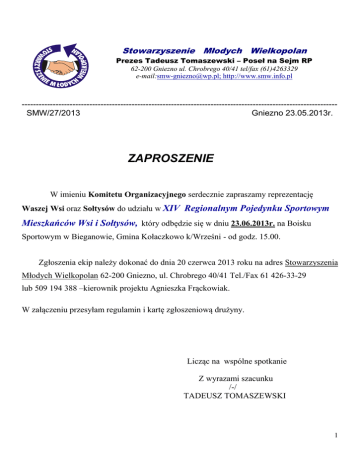 Stowarzyszenie Młodych Wielkopolan Prezes Tadeusz Tomaszewski – Poseł na Sejm RP 62-200 Gniezno ul. Chrobrego 40/41 tel/fax (61)4263329 e-mail:[email protected]; http://www.smw.info.pl ---------------------------------------------------------------------------------------------------------------SMW/27/2013 Gniezno 23.05.2013r. ZAPROSZENIE W imieniu Komitetu Organizacyjnego serdecznie zapraszamy reprezentację Waszej Wsi oraz Sołtysów do udziału w XIV Regionalnym Pojedynku Sportowym Mieszkańców Wsi i Sołtysów, który odbędzie się w dniu 23.06.2013r. na Boisku Sportowym w Bieganowie, Gmina Kołaczkowo k/Wrześni - od godz. 15.00. Zgłoszenia ekip należy dokonać do dnia 20 czerwca 2013 roku na adres Stowarzyszenia Młodych Wielkopolan 62-200 Gniezno, ul. Chrobrego 40/41 Tel./Fax 61 426-33-29 lub 509 194 388 –kierownik projektu Agnieszka Frąckowiak. W załączeniu przesyłam regulamin i kartę zgłoszeniową drużyny. Licząc na wspólne spotkanie Z wyrazami szacunku /-/ TADEUSZ TOMASZEWSKI 1 REGULAMIN XIV REGIONALNY POJEDYNEK SPORTOWY MIESZKAŃCÓW WSI I SOŁTYSÓW BIEGANOWO 23.06.2013r. 2 I. CEL: - popularyzacja kultury fizycznej i rekreacji wśród środowisk wiejskich, „osób w każdym wieku”, - promocja prozdrowotnych i społecznych wartości sportu, - wyrabianie nawyku aktywnego udziału mieszkańców wsi w różnych formach rekreacji i aktywnego wypoczynku, - aktywizacja środowisk wiejskich (sołectw i sołtysów) oraz grup odnowy wsi do systematycznego uprawiania sportu i rekreacji. II. ORGANIZATORZY: Stowarzyszenie Młodych Wielkopolan w Gnieźnie - Współorganizatorzy/Partnerzy: - Ministerstwo Pracy i Polityki Społecznej w Warszawie (projekt: Centra Integracji Międzypokoleniowej „CIM-III”/Program Operacyjny Fundusz Inicjatyw Obywatelskich), - Ministerstwo Sportu i Turystyki w Warszawie, - Stowarzyszenie „Wielkopolscy Bieganie” w Bieganowie, - Urząd Gminy Kołaczkowo, - Rada Sołecka, Grupa Odnowy Wsi, Szkoła Podstawowa, LZS w Bieganowie, - Gminny Ośrodek Kultury w Kołaczkowie, - Związek Gminny OSP Kołaczkowo, - OSP Kołaczkowo, OSP Zieliniec, OSP Wszembórz, - Grupy Odnowy Wsi: Wszembórz, Budziłowo, - Rady Sołeckie w obszarze Gminy Kołaczkowo. III. TERMIN I MIEJSCE: XIV Regionalny Pojedynek Sportowy Mieszkańców Wsi i Sołtysów odbędzie się 23 czerwca 2013r. na Boisku Sportowym (nt. Boisko Piłki Nożnej)w Bieganowie, Gmina Kołaczkowo k/Wrześni. Początek imprezy godz. 15.00. IV. UCZESTNICTWO: W Pojedynku uczestniczą: - drużyny reprezentujące wsie, - Sołtysi – członkowie Rad Sołeckich, - osoby towarzyszące, kibice, - „osoby w każdym wieku”- dzieci, młodzież, dorośli, osoby starsze. 3 V. KONKURENCJE I SPOSÓB ICH PRZEPROWADZENIA: 1. Rzut beretem: - zawodnik/czka (reprezentujący/a drużynę wsi)wykonuje dwa rzuty- liczy się najdłuższy rzut, - startuje 1 zawodnik/czka z drużyny; 2. Sztafeta „z miotłą - w konkurencji startują trzy osoby, określony odcinek systemem sztafetowym należy pokonać w jak najkrótszym czasie, osoba dorosła biegnie z taczką, na której siedzi kobieta, ta trzyma w ręku miotłę, którą kieruje piłkę pomiędzy 3-ma palikami. Następnie do taczki wsiada dziecko w wieku do 10 lat, które w ręku trzyma na łyżce jajko. Para dobiega do mety nie strącając jajka z łyżki. zwycięzcą zostaje drużyna, która dotrze do mety w jak najszybszym czasie. startują 3 osoby z drużyny, 3. Wbijanie gwoździ w pal: -startuje jeden zawodnik/czka z drużyny, -wbija 5 gwoździ w pal, liczy się wykonanie zadania w jak najkrótszym czasie(konkurencja na czas), 4. Rzut kaloszem pań: -startuje jedna zawodniczka, -2 rzuty kaloszem, liczy się dłuższy rzut; 5. Rzut kaloszem panów: -startuje jeden zawodnik, -2 rzuty kaloszem, liczy się dłuższy rzut; 6. Gra w kości - konkurencja „dla seniorów” -startuje 3 zawodników z każdej drużyny, -3 rzuty, liczy się największa ilość punktów; 7. Bieg w workach: - startuje reprezentacja 3 osobowa - w tym jedna kobieta, - określony odcinek systemem sztafetowym należy pokonać w jak najkrótszym czasie (konkurencja na czas); 8. Przeciąganie liny: - startuje zespół 4 - osobowy w tym jedna kobieta, - system pucharowy poprzedzony losowaniem, 9. Toczenie beczki – konkurencja drużynowa: - startuje zespół 4 – osobowy w tym 1 kobieta - długość toru 15m ( czyli 4 osoby x 15m). 4 KONKURENCJE DLA SOŁTYSÓW: VI. 1. Jazda żółwia na rowerze: - określony odcinek należy bez podpórki przejechać w jak najdłuższym czasie (konkurencja na czas); 2. Rzut lotką do tarczy: - zawodnik wykonuje serię 3 rzutów do tarczy, liczy się najlepszy wynik – suma zdobytych punktów; 3. Gra w kości - konkurencja : -startuje sołtys, -3 rzuty, liczy się największa ilość punktów; 4. - Rzut kaloszem do celu: 3 rzuty kaloszem, liczy się suma zdobytych trafień; 5. Quiz wiedzy o samorządzie, sporcie, Unii Europejskiej - VII. Liczy się największa ilość punktów zdobytych w teście. PUNKTACJA: 1m- 20pkt, 2m - 17pkt, 3m - 15pkt, 4m - 14pkt, 5m - 13pkt, 6m - 12pkt, 7m - 11pkt, 8m - 10pkt, 9m - 9pkt, 10m 5pkt, 11m - 7pkt, 12m - 6pkt VIII. NAGRODY: - za zajęcie od I do III miejsca zwycięzcy poszczególnych konkurencji indywidualnych otrzymują pamiątkowe medale, - za zajęcie od I do VI miejsca drużyny reprezentujące swoje wsie otrzymują puchary i dyplomy natomiast pozostałe reprezentacje statuetki uczestnictwa. - przeprowadzona będzie także klasyfikacja Gmin wyłoniona z wyników poszczególnych zawodników w Turnieju Sołtysów. - zwycięskie 3 Gminy otrzymają pamiątkowe puchary. - POSTANOWIENIA KOŃCOWE: zawodników obowiązuje obuwie sportowe – miękkie, - drużyny zobowiązane są do przygotowania tablic informacyjnych zawierających nazwę swojej wsi, - wszyscy zawodnicy wraz z osobami towarzyszącymi otrzymają posiłek regeneracyjny, - organizatorzy zapewniają obsługę medyczną, sędziowską i techniczną, IX. 5 - drużyny doko