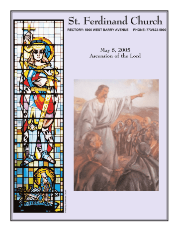 St. Ferdinand Church RECTORY: 5900 WEST BARRY AVENUE PHONE: 773/622-5900 Photo by Romuald Gluch May 8, 2005 Ascension of the Lord Page Two Ascension of the Lord May 8, 2005 The sanctuary lamps this week are lit for: ^Joseph & Bernice Lewandowski ^Mullins Fmily MONDAY, Easter Weekday 7:00 AM—People of St. Ferdinand 8:00 AM—^Alex Ladisa (5th Anniv.) rq. Wife & Family TUESDAY, Easter Weekday / Bl. Damian de Veuster of Moloka’i, priest 7:00 AM—^Alex Ladisa rq. Wife & Family 8:00 AM—^Stella Costanza rq. Family 7:00 PM—Marian Mass in Polish WEDNESDAY, Easter Weekday 7:00 AM—^Mullins Family rq. Daughter 8:00 AM—^Joseph C. Rozkuszka rq. Goddaughter THURSDAY, Easter Weekday / Nereus and Achilleus, martyrs / Pancras, martyr 7:00 AM—Special Intention 8:00 AM—^Rose E. Coco rq. Children 7:00 PM—Marian Mass in Polish FRIDAY, Matthias, apostle 7:00 AM—^Edward Powers rq. Family 8:00 AM—^Gerald Mosinski rq. Wife, Marie Mosinski SATURDAY, Easter Weekday 7:00 AM—^W³adys³aw Pilny; -Panie Jezu spraw przez wstawiennictwo Matki Najœwiêtszej aby proœby i postanowienia Mateusza i Patryka w dniu ich I Komuni Œw. zosta³y wys³uchane. 8:00 AM—^Bilinski Family rq. Arlene Bilinski Vigil: Pentecost 5:00 PM—^Carmen Cesario rq. Wife, Caroline SUNDAY, Pentecost 7:00 AM—^Andrzej Œrodoñ; ^Leokadia, Kazimierz Paradowski 8:30 AM—^Feliks, Zofia Kawecki rq. Stella Boron 10:30 AM—(Chapel)^Rose Frost rq. Ralph Frost 10:45 AM—^Kazimierz Szef; ^Zofia Mielnik, Boles³aw Skrêtowicz w 14 rocznicê œmierci 12:15 PM—(Chapel)Mass in Italian 12:30 PM—^Roger Thibodeau rq. Family 3:00 PM—dziêkczynna z proœb¹ o uwolnienie z alkoholizmu i na³ogu palenia dla S³awka 5:00 PM—^Frank & Helen Szczech rq. Szerszen & Piecuch Families 6:30 PM—^Janian i Boles³aw Staniow; ^Maria i August Juszczyk HANDMAIDS S. Buzinski 3rd publication None 2nd publication Donovan Cochon and Sheryl A. Melo Piotr M. Pekala and Marcela U. Krysa Brian G. Murphy and Jaclyn S. O’Shaughnessy 1st publication Dariusz Kasprzycki and Ma³gorzata Figiel Edward M. Clemente and Racquel Musni Congratulations and best wishes to the couples who were married here last week: Anna Serus and Tomasz Kot We pray for God’s blessings on them as they begin their new life together. WE WELCOME IN BAPTISM Claudia, daughter of Filippo and Irene (Cangemi) Rubino; Jakub, son of Dariusz and Marzena (Marzec) Cabaj; Katarzyna Anna, daughter of Miros³aw and Agnieszka (Gruszka) Drozd; Nicole, daughter of Grzegorz and Anna (Dymek) Kaczmarczyk; Gabriela Karolina, daughter of Andrzej and El¿bieta (Bia³ecka) Pacer; Jakub Robert, son of Andrzej and Iwona (Wojewódzka) Wysocki Pentecost Vigil Saturday May 14 7:00 PM “St. Ferdinand Chapel” Come to pray as we wait for the Holy Spirit !! We will have a multilingual Liturgy of the Word with prayers and songs to worship God. Our Blessed Lord has called Remember home our parishioners Annette Ciancio, these Helen Kosirog and Filippo Partipilo for loved ones whom we promise our prayers. May they and all our other deceased parishioners enjoy peace and happiness in God’s Sacred Presence. All are welcome! Bulletin reminder: All notices for the May 15th bulletin need to be in the rectory no later than 9 AM on Monday, May 9th. You may bring your bulletin notices to the rectory in an envelope labeled “bulletin”; you may fax them to 622-5903; or you may email them to [email protected]. May 8, 2005 Ascension of the Lord Remember You’re invited to our Spring Open House We are having two Spring Open Houses on Tuesday, May 10th from 8:00 AM until 11:30 AM, and then again on Wednesday, May 11th from 6:00 PM until 8:00 PM for all those who are new to the area, missed our January open house, are considering a change from their current school, and/or looking to enroll their children into school for the first time. Please let your friends and neighbors know. We’re proud of our reputation; we know we are a good school. Now it is time to tell others about us—so spread the word. Mother’s Day Flower Sale “The mother is appointed quardian of life...it is here that the history of every life begins.” John Paul II Show how much you appreciate your Mom by giving her a beautiful bouquet of roses, carnations or mixed flowers. The Legion of Mary of St. Ferdinand Parish will sell Mother’s Day flowers after all Masses on Saturday, May 7 and Sunday, May 8. Proceeds from the sale will help support the life-saving work of The Women’s Centers of Greater Chicagoland. The money raised by this sale will be used to help teens and women facing crisis pregnancies. Each year, The Women’s Centers of Greater Chicagoland provide compassionate counseling, social services referrals and material goods assistance to over 6000 women who are facing crisis pregnancies. Since its founding in 1987, The Women’s Centers have helped save more than 28,000 babies from the threat of abortion. Please support this worthy cause. Alumni News Honor Roll It is with great pride that we share with you the names of the St. Ferdinand parishioners who earned a place on the Resurrection High School honor roll for the third quarter. We join their parents and teachers in congratulating them. Meggan Kupinski, ‘07 First Honors Emily Muszczynski, 07 Second Honors Juliana Pike, ‘05 First Honors Tania Saavedra, ‘05 Second Honors Amanda Sammarco, ‘06 First Honors Samantha Studzinski, ‘07 First Honors Barbara Bitner, ‘08 First Honors Paulina Pietras, ‘08 First Honors Congratulations, ladies. Your parish family is very proud of you. Page Three As members of the parish faith in community, it is our responsibility to remember both in concrete and spiritual Prayer ways those who cannot celebrate with us each week because they are ill. Those who are sick in turn, remember all of us daily in their prayers and in their sufferings. We experience many blessings because of their remembering us. And so ... please remember in your prayers: Thom