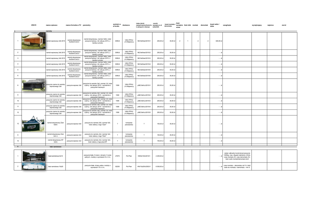 zdjecie nazwa opisowa nazwa formalna z FV parametry wartość w zł brutto dostawca index (skrót cennik nazwy/rozmiar/kolor/ro wynajmu w zł k zakupu/nr własny) netto/24h ilość koszt montażu / wynajmo ilość dób demontażu montaż demontaż wana koszt netto / doba uwagi/opis namioty A 1 namiot expresowy 3x6 2015 namiot ekspresowy AluStal 6,0x3,0 2 namiot expresowy 3x6 2015 namiot ekspresowy AluStal 6,0x3,0 3 namiot expresowy 3x6 2015 namiot ekspresowy AluStal 6,0x3,0 namiot expresowy 3x6 2015 namiot ekspresowy AluStal 6,0x3,0 namiot expresowy 3x6 2015 namiot ekspresowy AluStal 6,0x3,0 6 namiot expresowy 3x6 2015 namiot ekspresowy AluStal 6,0x3,0 8 poszycie czarne do namiotu expresowego 3x6 poszycie express 3x6 9 poszycie czarne do namiotu expresowego 3x6 poszycie express 3x6 10 poszycie czarne do namiotu expresowego 3x6 11 poszycie czarne do namiotu expresowego 3x6 12 poszycie czarne do namiotu expresowego 3x6 poszycie express 3x6 12 namiot ekspresowy Żubr 5x5m poszycie exprezz 5x5 9 namiot ekspresowy Żubr 4x4 m 10 namiot ekspresowy KP 3x3m B hale namiotowe 1 2 4 5 namiot ekspresowy, rozmiar 3x6m, kolor poszycie beżowy, rok zakupu 2015, z bandą z przodu 3099,6 VIKA PPHU J.K.Majewscy NE/3x6/beż/2015/1 250,00 zł 35,00 zł 3099,6 VIKA PPHU J.K.Majewscy NE/3x6/beż/2015/2 250,00 zł 35,00 zł - zł 3099,6 VIKA PPHU J.K.Majewscy NE/3x6/beż/2015/3 250,00 zł 35,00 zł - zł 3099,6 VIKA PPHU J.K.Majewscy NE/3x6/beż/2015/4 250,00 zł 35,00 zł - zł 3099,6 VIKA PPHU J.K.Majewscy NE/3x6/beż/2015/5 250,00 zł 35,00 zł - zł 3099,6 VIKA PPHU J.K.Majewscy NE/3x6/beż/2015/6 250,00 zł 35,00 zł - zł 1599 VIKA PPHU J.K.Majewscy pNE/3x6/cz/2015/1 250,00 zł 35,00 zł - zł 1599 VIKA PPHU J.K.Majewscy pNE/3x6/cz/2015/2 250,00 zł 35,00 zł - zł 1599 VIKA PPHU J.K.Majewscy pNE/3x6/cz/2015/3 250,00 zł 35,00 zł - zł 1599 VIKA PPHU J.K.Majewscy pNE/3x6/cz/2015/4 250,00 zł 35,00 zł - zł 1599 VIKA PPHU J.K.Majewscy pNE/3x6/cz/2015/5 250,00 zł 35,00 zł - zł poszycie do namiotu 5x5, rozmiar 5x5, kolor zielony z logo "Żubr" ? kompania piwowarska ? 150,00 zł 35,00 zł - zł poszycie exprezz 4x4 poszycie do namiotu 4x4, rozmiar 4x4, kolor zielony z logo "Żubr" ? kompania piwowarska ? 150,00 zł 35,00 zł - zł poszycie exprezz 3x3 poszycie do namiotu 3x3, rozmiar 3x3, kolor zielony z logo piwa KP ? kompania piwowarska ? 150,00 zł 35,00 zł - zł hala bankietowa 8x15 poszycie białe, 5 ścian z oknami, 5 scian pełnych, moduły o wymiarach 8 x 3 m; 27675 Pol Plan HN/8x15/b/2015/1 2 200,00 zł - zł cieżar całkowity konstrukcja+poszycie 1200kg, max. długość elementu 4,5mb, czas montażu-3h, czas demontażu 3h, ilość osób montaż/demontaż-min4 hala namiotowa 15x20 poszycie białe, ściany pełne, moduły o wymiarach 15 x 5 m; 92250 Pol Plan HN/15x20/b/2003/1 6 000,00 zł - zł czas montażu - demontażu ok 5 h, ilość osób do montażu / demontażu - min 6. poszycie express 3x6 poszycie express 3x6 namiot ekspresowy, rozmiar 3x6m, kolor poszycie beżowy, rok zakupu 2015, z bandą z przodu namiot ekspresowy, rozmiar 3x6m, kolor poszycie beżowy, rok zakupu 2015, z bandą z przodu namiot ekspresowy, rozmiar 3x6m, kolor poszycie beżowy, rok zakupu 2015, z bandą z przodu namiot ekspresowy, rozmiar 3x6m, kolor poszycie beżowy, rok zakupu 2015, z bandą z przodu namiot ekspresowy, rozmiar 3x6m, kolor poszycie beżowy, rok zakupu 2015, z bandą z przodu poszycie do namiotu 3x6, rozmiar 3,6, kolor czarny, rok zakupu 2015 - wymiennie z poszyciem bezowym poszycie do namiotu 3x6, rozmiar 3,6, kolor czarny, rok zakupu 2015 - wymiennie z poszyciem bezowym poszycie do namiotu 3x6, rozmiar 3,6, kolor czarny, rok zakupu 2015 - wymiennie z poszyciem bezowym poszycie do namiotu 3x6, rozmiar 3,6, kolor czarny, rok zakupu 2015 - wymiennie z poszyciem bezowym poszycie do namiotu 3x6, rozmiar 3,6, kolor czarny, rok zakupu 2015 - wymiennie z poszyciem bezowym 2 1 2 2 640,00 zł wynajmujący najemca zwrot C grille 1 grill gazowy Buffalo 2015 grill gazowy wozek Bufallo+pokrowiec 2 grill gazowy Buffalo 2015 grill gazowy wozek Bufallo+pokrowiec 3 grill gazowy Buffalo 2015 grill gazowy wozek Bufallo+pokrowiec grill gazowy Buffalo 2015 grill gazowy wozek Bufallo+pokrowiec grill gazowy Buffalo 2015 grill gazowy wozek Bufallo+pokrowiec grill gazowy Buffalo 2015 grill gazowy wozek Bufallo+pokrowiec 4 5 6 grill gazowy, 3 palniki x3kW, powierzchnia grillowania 40x80, +palnik boczny1x3kW, z pokrywą roll top, grill gazowy, 3 palniki x3kW, powierzchnia grillowania 40x80, +palnik boczny1x3kW, z pokrywą roll top, grill gazowy, 3 palniki x3kW, powierzchnia grillowania 40x80, +palnik boczny1x3kW, z pokrywą roll top, grill gazowy, 3 palniki x3kW, powierzchnia grillowania 40x80, +palnik boczny1x3kW, z pokrywą roll top, grill gazowy, 3 palniki x3kW, powierzchnia grillowania 40x80, +palnik boczny1x3kW, z pokrywą roll top, grill gazowy, 3 palniki x3kW, powierzchnia grillowania 40x80, +palnik boczny1x3kW, z pokrywą roll top, 1250,0121 ACTIVA Polska sp. z o.o. GGB/40x80/czarny/201 5/1 250,00 zł - zł 1250,0121 ACTIVA Polska sp. z o.o. GGB/40x80/czarny/201 5/2 250,00 zł - zł 1250,0121 ACTIVA Polska sp. z o.o. GGB/40x80/czarny/201 5/3 250,00 zł - zł 1250,0121 ACTIVA Polska sp. z o.o. GGB/40x80/czarny/201 5/4 250,00 zł - zł 1250,0121 ACTIVA Polska sp. z o.o. GGB/40x80/czarny/201 5/5 250,00 zł - zł 1250,0121 ACTIVA Polska sp. z o.o. GGB/40x80/czarny/201 5/6 250,00 zł - zł meble 1 ławostół Bawaria Standard kpl. stół + 2 ławki stół i ławki z nogami składanymi, stół o wymiarach 200 x 50 cm, ławka o wymiarach 200 x 25 cm, składane na europalecie max. 20 kpl (20 stołów + 40 ławek ? Kompania Piwowarska 2015 15,00 zł 8,00 zł 2 ławostół Bawaria Standard kpl. stół + 2 ławki stół i ławki z nogami składanymi, stół o wymiarach 220 x 50 cm, ławka o wymiarach 220 x 25 cm, składane na europalecie max. 20 kpl (20 stołów + 40 ławek ? Kompania Piwowarska 2015 15,00 zł 8,00 zł 3 parasol 