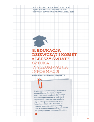 „EDUKACJA GLOBALNA NA ZAJĘCIACH JĘZYKA POLSKIEGO W GIMNAZJUM”, CENTRUM EDUKACJI OBYWATELSKIEJ 2015 8. EDUKACJA DZIEWCZĄT I KOBIET = LEPSZY ŚWIAT? SZTUKA WYSZUKIWANIA INFORMACJI AUTORKA: MONIKA KOMISARCZYK Ćwiczenie zwraca uwagę młodzieży na problematykę równości płci oraz znaczenie edukacji dziewcząt i kobiet w perspektywie globalnej. Uczniowie i uczennice dowiadują się, w jaki sposób wykształcenie kobiet przekłada się nie tylko na kwestie społeczne, związane np. z funkcjonowaniem rodziny, ale także na życie gospodarcze czy polityczne. Õ 59 8. EDUKACJA DZIEWCZĄT I KOBIET = LEPSZY ŚWIAT? SZTUKA WYSZUKIWANIA INFORMACJI Zagadnienia: Władza polityczna, demokracja i prawa człowieka Ubóstwo Zdrowie Czas trwania: 30 minut Cele ćwiczenia: Dowiesz się, jaka jest sytuacja edukacyjna dziewcząt i kobiet na świecie. Rozwiniesz umiejętność myślenia przyczynowo-skutkowego, zastanawiając się nad znaczeniem edukacji w perspektywie globalnej. Związek z podstawą programową: I: 1.2, 1.4, II: 4.3, III: 1.5, 2.3, 2.11 Środki dydaktyczne i materiały: Załączniki Szary papier Flamastry min PRZEBIEG ĆWICZENIA: 0 2 1. 2 Zapytaj uczennice i uczniów, czy… wolno im chodzić do szkoły? Następnie wprowadź klasę w tematykę ćwiczenia, wyjaśniając, że zajmiecie się zagadnieniem edukacji dziewcząt i kobiet. W tym celu młodzież przeczyta za chwilę fragmenty artykułu Małgorzaty Juchniewicz pt. „Stan edukacji dziewcząt i kobiet na świecie”. 2. Wyłoń grupę ekspercką. Wyjaśnij, że potrzebujesz trzech osób, które będą pełniły rolę eksper4 tów/ekspertek dla grup. Z racji omawianego zagadnienia możesz zaproponować, żeby tę rolę pełniły dziewczęta (to działanie wzmacniające, mające również na celu przełamanie stereotypu mężczyzny-kierownika, tu: chłopca jako lidera zarządzającego zespołem dziewczynek). 2 3. Rozdaj każdej osobie z grupy eksperckiej po dwa materiały pomocnicze: materiał pomocniczy 6 dla grup uczniowskich (załącznik nr 1) oraz po jednym fragmencie materiału pomocniczego dla grup eksperckich (załącznik nr 2), tak aby każdy ekspert/ekspertka miał inny obszar ekspertyzy (gospodarka, partycypacja polityczna, zdrowie). Zadaniem ekspertów/ekspertek jest szybkie zapoznanie się z obydwoma materiałami, a następnie wspieranie pracy koleżanek i kolegów poprzez chodzenie między grupami i uzupełnianie ich odpowiedzi o dodatkowe informacje. Uwaga! Nie wolno jednak podawać gotowych rozwiązań. Ekspertki/Eksperci odpowiadają również za podsumowanie pracy grup oraz uzupełnienie ich wypowiedzi. 2 4. Podziel klasę na trzy zespoły. Każdy zespół otrzymuje materiał pomocniczy dla grup uczniow21 skich (załącznik nr 1) oraz szary papier i flamastry. Zadaniem grup jest przeprowadzenie burzy pomysłów i spisanie na arkuszach papieru odpowiedzi na pytanie: jakie korzyści płyną z edukacji dziewcząt i kobiet na świecie? W celu usprawnienia pracy młodzieży napisz na tablicy trzy obszary wyeksponowane w artykule: gospodarkę, zdrowie oraz partycypację polityczną. Gdy wszyscy przeczytają otrzymane materiały, rozpoczyna się praca grup uczniowskich oraz wsparcie ze strony grupy eksperckiej. 15 5. Poproś, aby przedstawiciele/przedstawicielki poszczególnych grup zaprezentowali efekty burzy 29 8 30 1 pomysłów. W tym czasie ekspertki/eksperci sprawdzają, czy informacje są kompletne i ewentualnie dodają swoje komentarze. Mogą je także dopisać na arkuszach poszczególnych grup. 6. Podsumuj ćwiczenie i podziękuj wszystkim za zaangażowanie. PRACA DOMOWA: 1. Poproś, aby młodzież poszukała w Internecie informacji na temat kampanii „Dziewczynka z książką” i zanotowała najciekawsze z nich w zeszycie. Zachęć do zastanowienia się, w jaki sposób każdy/każda z nas może włączyć się w działania. Źródła: Małgorzata Juchniewicz, „Stan edukacji dziewcząt i kobiet na świecie”, http://dziewczynkazksiazka.natemat. pl/70691,stan-edukacji-dziewczat-i-kobiet-na-swiecie. Załączniki: Załącznik nr 1 – Materiał pomocniczy dla grup uczniowskich: „Stan edukacji dziewcząt i kobiet na świecie” Załącznik nr 2 – Materiał pomocniczy dla grupy eksperckiej: Jakie są korzyści z edukacji dziewcząt? 60 8. EDUKACJA DZIEWCZĄT I KOBIET = LEPSZY ŚWIAT? SZTUKA WYSZUKIWANIA INFORMACJI ZAŁĄCZNIK NR 1 – MATERIAŁ POMOCNICZY DLA GRUP UCZNIOWSKICH „STAN EDUKACJI DZIEWCZĄT I KOBIET NA ŚWIECIE” Niektórzy ludzie lubią liczby, procenty, ułamki itp. Osobiście nie jestem wielką fanką matematyki i statystyki, ale muszę przyznać, że to właśnie liczby mogą lepiej przedstawić problem. Postanowiłam więc opracować dane dotyczące stanu edukacji dziewcząt i kobiet na świecie dla wszystkich tych, którzy chcieliby zapoznać się z kilkoma faktami. Zacznijmy od podstawowych danych na temat stanu edukacji dziewcząt i kobiet na całym świecie, a następnie przejdźmy do pewnych wyraźnych korzyści płynących z ich edukacji. Stan edukacji dziewcząt Każdego roku 57 milionów dzieci w wieku 6-11 lat nie chodzi do szkoły – ponad 30 milionów z nich to dziewczynki. Badania wykazują, że 150 milionów dzieci uczęszczających do szkół zrezygnuje z nauki przed ukończeniem szkoły podstawowej – co najmniej 100 milionów z nich to dziewczynki. Tylko w 36 z 155 krajów rozwijających się wskaźnik kończenia szkoły podstawowej wynosi 100 procent. W krajach rozwijających się różnica między liczbą chłopców a liczbą dziewczynek kończących szkołę podstawową jest większa niż 10 procent. UNICEF podkreśla, że „ta duża różnica pomiędzy płciami oznacza, że każdego roku miliony dziewcząt więcej porzuca szkołę”. W Afryce Subsaharyjskiej, ponad połowa dziewcząt – 54 procent – nie ukończy nauki w szkole podstawowej. W Czadzie, 90 procent wszystkich dziewcząt w wieku 15-19 lat nie ukończyło szkoły podstawowej. W Burkina Faso nie zrobi