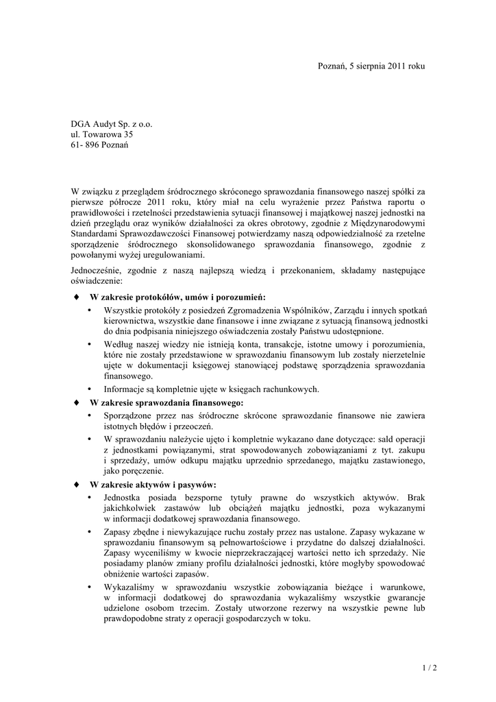 Poznań, 5 sierpnia 2011 roku DGA Audyt Sp. z o.o. ul. Towarowa 35 61- 896 Poznań W związku z przeglądem śródrocznego skróconego sprawozdania finansowego naszej spółki za pierwsze półrocze 2011 roku, który miał na celu wyrażenie przez Państwa raportu o prawidłowości i rzetelności przedstawienia sytuacji finansowej i majątkowej naszej jednostki na dzień przeglądu oraz wyników działalności za okres obrotowy, zgodnie z Międzynarodowymi Standardami Sprawozdawczości Finansowej potwierdzamy naszą odpowiedzialność za rzetelne sporządzenie śródrocznego skonsolidowanego sprawozdania finansowego, zgodnie z powołanymi wyżej uregulowaniami. Jednocześnie, zgodnie z naszą najlepszą wiedzą i przekonaniem, składamy następujące oświadczenie: ♦ W zakresie protokółów, umów i porozumień: Wszystkie protokóły z posiedzeń Zgromadzenia Wspólników, Zarządu i innych spotkań kierownictwa, wszystkie dane finansowe i inne związane z sytuacją finansową jednostki do dnia podpisania niniejszego oświadczenia zostały Państwu udostępnione. Według naszej wiedzy nie istnieją konta, transakcje, istotne umowy i porozumienia, które nie zostały przedstawione w sprawozdaniu finansowym lub zostały nierzetelnie ujęte w dokumentacji księgowej stanowiącej podstawę sporządzenia sprawozdania finansowego. Informacje są kompletnie ujęte w księgach rachunkowych. ♦ W zakresie sprawozdania finansowego: Sporządzone przez nas śródroczne skrócone sprawozdanie finansowe nie zawiera istotnych błędów i przeoczeń. W sprawozdaniu należycie ujęto i kompletnie wykazano dane dotyczące: sald operacji z jednostkami powiązanymi, strat spowodowanych zobowiązaniami z tyt. zakupu i sprzedaży, umów odkupu majątku uprzednio sprzedanego, majątku zastawionego, jako poręczenie. ♦ W zakresie aktywów i pasywów: Jednostka posiada bezsporne tytuły prawne do wszystkich aktywów. Brak jakichkolwiek zastawów lub obciążeń majątku jednostki, poza wykazanymi w informacji dodatkowej sprawozdania finansowego. Zapasy zbędne i niewykazujące ruchu zostały przez nas ustalone. Zapasy wykazane w sprawozdaniu finansowym są pełnowartościowe i przydatne do dalszej działalności. Zapasy wyceniliśmy w kwocie nieprzekraczającej wartości netto ich sprzedaży. Nie posiadamy planów zmiany profilu działalności jednostki, które mogłyby spowodować obniżenie wartości zapasów. Wykazaliśmy w sprawozdaniu wszystkie zobowiązania bieżące i warunkowe, w informacji dodatkowej do sprawozdania wykazaliśmy wszystkie gwarancje udzielone osobom trzecim. Zostały utworzone rezerwy na wszystkie pewne lub prawdopodobne straty z operacji gospodarczych w toku. 1/2 ♦ Spełniliśmy zarówno na dzień przeglądu jak i do dnia podpisania niniejszego oświadczenia wszystkie warunki wynikające z umów kredytowych. Stwierdzamy, że nie istnieją ustne gwarancje udzielone przez członków Zarządu, kierownictwo, pracowników lub osoby trzecie w imieniu jednostki, uzgodnienia z instytucjami finansowymi w sprawie kompensaty sald lub umowy dotyczące ograniczenia salda gotówkowego; umowy odnośnie odkupienia uprzednio sprzedanych aktywów; inne umowy nienależące do normalnego toku działalności. Poza przedstawionymi Państwu, nie mamy żadnych innych umów kredytowych. Wszystkie roszczenia sporne, zarówno z naszego powództwa jak i przeciwko nam, zostały ujawnione w sprawozdaniu finansowym. Nie spodziewamy się powstania innych roszczeń w związku z prowadzonymi sporami. Nie mamy planów i zamierzeń, które w istotny sposób mogłyby oddziaływać na wartość lub klasyfikacje aktywów i pasywów przedstawionych w sprawozdaniu finansowym. Członkowie kierownictwa Spółki oraz osoby z nimi powiązane nie posiadają żadnych zobowiązań, umów o charakterze zobowiązań oraz nieujawnionych korzyści wynikających z transakcji ze Spółką, poza wykazanymi w informacji dodatkowej. W zakresie innych zagadnień: Zaprojektowana i wdrożona kontrola wewnętrzna służy zapobieganiu i wykrywaniu oszustw. W jednostce nie wystąpiły żadne nieprawidłowości obejmujące swoim zasięgiem kierownictwo i pracowników odgrywających znaczącą rolę przy przeprowadzaniu kontroli wewnętrznej lub wywierających istotny wpływ na sprawozdanie finansowe. Nie wystąpiły żadne wydarzenia po dniu przeglądu, poza przedstawionymi w skróconym śródrocznym sprawozdaniu finansowym (informacja dodatkowa), które wymagałyby wykazania w sprawozdaniu. Nie wiemy o jakichkolwiek naruszeniach prawa lub przepisów, które powinny być uwzględnione przy sporządzaniu śródrocznego skróconego sprawozdania finansowego lub mogłyby stanowić podstawę do uwzględnienia kosztów lub strat. Przedstawiliśmy Państwu kompletną korespondencję z organami nadzoru oraz ich postanowienia i decyzje. Zgodnie z naszą najlepszą wiedzą i przekonaniem, nie wystąpiły żadne istotne transakcje z podmiotami powiązanymi oprócz tych ujawnionych w sprawozdaniu finansowym. Rozważyliśmy okoliczności dotyczące kontynuacji działalności i jesteśmy przekonani, że właściwe jest sporządzenie sprawozdania finansowego z zachowaniem zasady kontynuacji działalności. Dochodząc do takiego poglądu uwzględniliśmy wszystkie istotne sprawy, których jesteśmy świadomi oraz rozważyliśmy zdarzenia dotyczące dającej się przewidzieć przyszłości. W informacji dodatkowej przedstawiliśmy wszystkie znane przesłanki kontynuacji działalności. ........................................................... Podpisy członków Zarządu 2/2