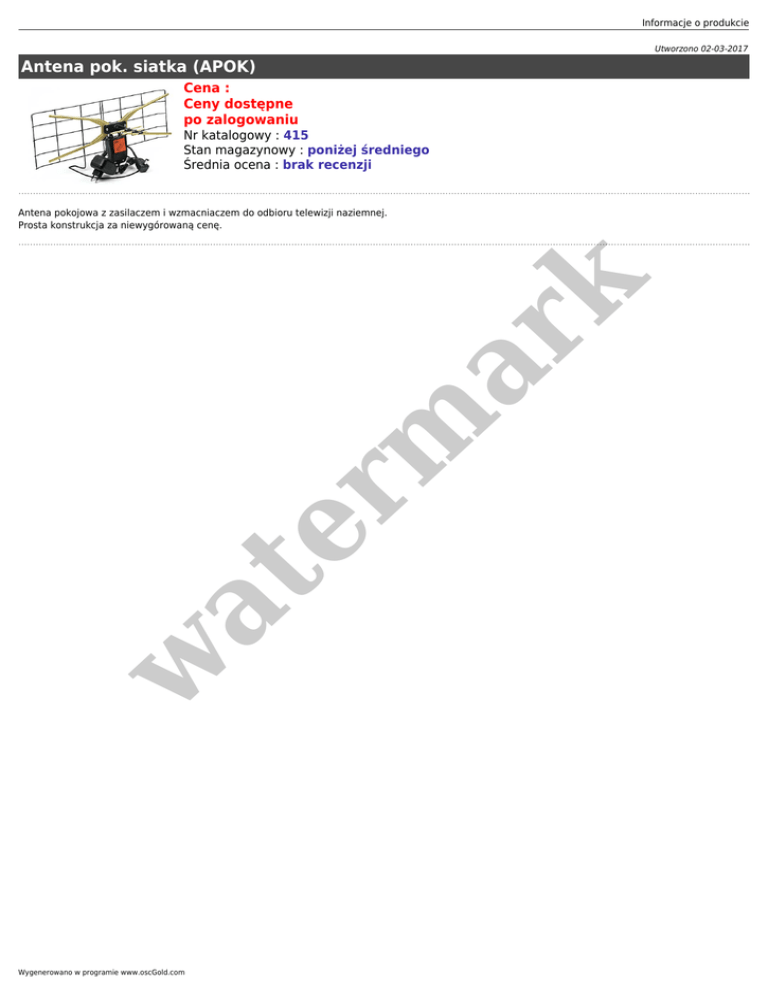 Informacje o produkcie Utworzono 02-03-2017 Antena pok. siatka (APOK) Cena : Ceny dostępne po zalogowaniu Nr katalogowy : 415 Stan magazynowy : poniżej średniego Średnia ocena : brak recenzji w at er m ar k Antena pokojowa z zasilaczem i wzmacniaczem do odbioru telewizji naziemnej. Prosta konstrukcja za niewygórowaną cenę. Wygenerowano w programie www.oscGold.com