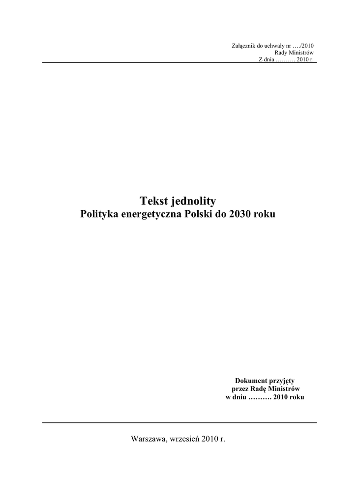 Załącznik do uchwały nr …./2010 Rady Ministrów Z dnia ………. 2010 r. Tekst jednolity Polityka energetyczna Polski do 2030 roku Dokument przyjęty przez Radę Ministrów w dniu ………. 2010 roku Warszawa, wrzesień 2010 r. SPIS TREŚCI 1. 1.1. 1.2. 1.3. 1.4. 2. 2.1. 2.2. 2.3. 3. 3.1. WPROWADZENIE ........................................................................................................ 4 UWARUNKOWANIA ............................................................................................ 4 PODSTAWOWE KIERUNKI POLITYKI ENERGETYCZNEJ ....................................... 4 NARZĘDZIA REALIZACJI POLITYKI ENERGETYCZNEJ ......................................... 5 STRUKTURA DOKUMENTU ................................................................................. 6 POPRAWA EFEKTYWNOŚCI ENERGETYCZNEJ................................................ 6 CELE W ZAKRESIE POPRAWY EFEKTYWNOŚCI ENERGETYCZNEJ ....................... 7 DZIAŁANIA NA RZECZ POPRAWY EFEKTYWNOŚCI ENERGETYCZNEJ.................. 7 PRZEWIDYWANE EFEKTY DZIAŁAŃ NA RZECZ POPRAWY EFEKTYWNOŚCI ENERGETYCZNEJ ................................................................................................ 8 WZROST BEZPIECZEŃSTWA DOSTAW PALIW I ENERGII............................. 8 CELE I DZIAŁANIA W ZAKRESIE WZROSTU BEZPIECZEŃSTWA DOSTAW PALIW I ENERGII ...........................................................................................................8 3.1.1. Paliwa – pozyskiwanie i przesyłanie .......................................................... 10 3.1.1.1 3.1.1.2 3.1.1.3 3.1.2. 3.2. Węgiel .......................................................................................................... 10 Gaz ............................................................................................................... 11 Ropa naftowa i paliwa płynne ...................................................................... 12 Wytwarzanie i przesyłanie energii elektrycznej oraz ciepła ........................ 14 PRZEWIDYWANE EFEKTY DZIAŁAŃ NA RZECZ WZROSTU BEZPIECZEŃSTWA DOSTAW PALIW I ENERGII ................................................................................ 16 3.2.1. Paliwa – pozyskiwanie i przesyłanie .......................................................... 16 3.2.2. Wytwarzanie i przesyłanie energii elektrycznej oraz ciepła ...................... 16 4. 4.1. 4.2. 4.3. DYWERSYFIKACJA STRUKTURY WYTWARZANIA ENERGII ELEKTRYCZNEJ POPRZEZ WPROWADZENIE ENERGETYKI JĄDROWEJ ......................................................................................................................................... 16 CELE W ZAKRESIE DYWERSYFIKACJI STRUKTURY WYTWARZANIA ENERGII ELEKTRYCZNEJ POPRZEZ WPROWADZENIE ENERGETYKI JĄDROWEJ ............... 17 DZIAŁANIA NA RZECZ DYWERSYFIKACJI STRUKTURY WYTWARZANIA ENERGII ELEKTRYCZNEJ POPRZEZ WPROWADZENIE ENERGETYKI JĄDROWEJ ............... 18 PRZEWIDYWANE EFEKTY DZIAŁAŃ NA RZECZ DYWERSYFIKACJI STRUKTURY WYTWARZANIA ENERGII ELEKTRYCZNEJ POPRZEZ WPROWADZENIE ENERGETYKI JĄDROWEJ ................................................................................... 19 5. 5.1. 5.2. 5.3. 6. 6.1. ROZWÓJ WYKORZYSTANIA ODNAWIALNYCH ŹRÓDEŁ ENERGII, W TYM BIOPALIW ..................................................................................................... 19 CELE W ZAKRESIE ROZWOJU WYKORZYSTANIA OZE...................................... 20 DZIAŁANIA NA RZECZ ROZWOJU WYKORZYSTANIA OZE ................................ 20 PRZEWIDYWANE EFEKTY DZIAŁAŃ NA RZECZ ROZWOJU WYKORZYSTANIA OZE.......... ....................................................................................................... 21 ROZWÓJ KONKURENCYJNYCH RYNKÓW PALIW I ENERGII .................... 21 CELE W ZAKRESIE ROZWOJU KONKURENCYJNYCH RYNKÓW .......................... 22 6.2. 6.3. 7. 7.1. 7.2. 7.3. DZIAŁANIA NA RZECZ ROZWOJU KONKURENCYJNYCH RYNKÓW .................... 23 PRZEWIDYWANE EFEKTY DZIAŁAŃ NA RZECZ ROZWOJU KONKURENCYJNYCH RYNKÓW..... ..................................................................................................... 23 OGRANICZENIE ODDZIAŁYWANIA ENERGETYKI NA ŚRODOWISKO .... 23 CELE W ZAKRESIE OGRANICZENIA ODDZIAŁYWANIA ENERGETYKI NA ŚRODOWISKO ............................................................................................. 24 DZIAŁANIA NA RZECZ OGRANICZENIA ODDZIAŁYWANIA ENERGETYKI NA ŚRODOWISKO ............................................................................................. 24 PRZEWIDYWANE EFEKTY DZIAŁAŃ NA RZECZ OGRANICZENIA ODDZIAŁYWANIA ENERGETYKI NA ŚRODOWISKO ........................................................................ 25 8. DZIAŁANIA WSPOMAGAJĄCE .............................................................................. 26 9. SYSTEM WDRAŻANIA POLITYKI ENERGETYCZNEJ .................................... 28 10. ZAŁĄCZNIKI ............................................................................................................... 30 1. Wprowadzenie 1.1. Uwarunkowania Polski sektor energetyczny stoi obecnie przed poważnymi wyzwaniami. Wysokie zapotrzebowanie na energię, nieadekwatny poziom rozwoju infrastruktury wytwórczej i transportowej paliw i energii, znaczne uzależnienie od zewnętrznych dostaw gazu ziemnego i niemal pełne od zewnętrznych dostaw ropy naftowej oraz zobowiązania w zakresie ochrony środowiska, w tym dotyczące klimatu, powodują konieczność podjęcia zdecydowanych działań zapobiegających pogorszeniu się sytuacji odbiorców paliw i energii. 1 Jednocześnie w ostatnich latach w gospodarce światowej wystąpił szereg niekorzystnych zjawisk. Istotne wahania cen surowców energetycznych, rosnące zapotrzebowanie na energię ze strony krajów rozwijających się, poważne awarie systemów energetycznych oraz wzrastające zanieczyszczenie środowiska wymagają nowego podejścia do prowadzenia polityki energetycznej. W ramach zo