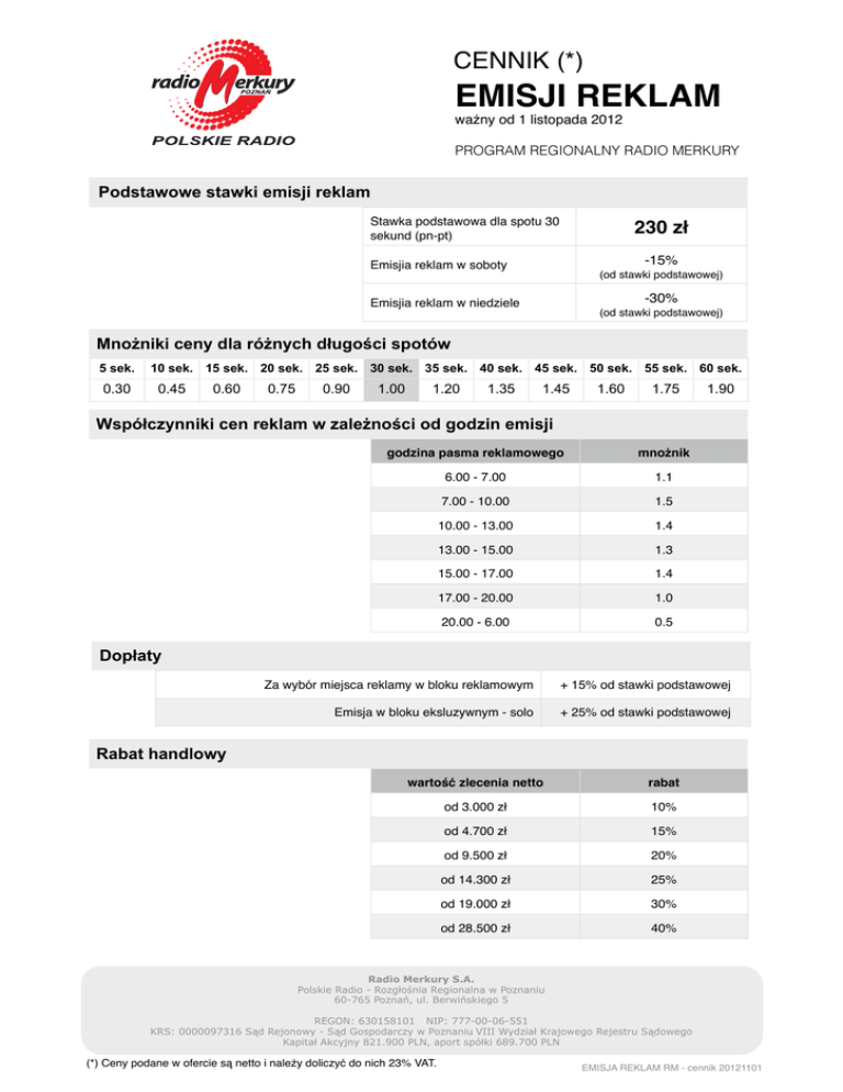 CENNIK (*)! EMISJI REKLAM ważny od 1 listopada 2012! !PROGRAM REGIONALNY RADIO MERKURY Podstawowe stawki emisji reklam Stawka podstawowa dla spotu 30 sekund (pn-pt) 230 zł -15% ! Emisjia reklam w soboty (od stawki podstawowej) -30% ! Emisjia reklam w niedziele (od stawki podstawowej) Mnożniki ceny dla różnych długości spotów 5 sek. 0.30 10 sek. 15 sek. 20 sek. 25 sek. 30 sek. 35 sek. 40 sek. 45 sek. 50 sek. 55 sek. 60 sek. 0.45 0.60 0.75 0.90 1.00 1.20 1.35 1.45 1.60 1.75 1.90 Współczynniki cen reklam w zależności od godzin emisji godzina pasma reklamowego mnożnik 6.00 - 7.00 1.1 7.00 - 10.00 1.5 10.00 - 13.00 1.4 13.00 - 15.00 1.3 15.00 - 17.00 1.4 17.00 - 20.00 1.0 20.00 - 6.00 0.5 Dopłaty Za wybór miejsca reklamy w bloku reklamowym + 15% od stawki podstawowej Emisja w bloku eksluzywnym - solo + 25% od stawki podstawowej Rabat handlowy ! ! wartość zlecenia netto rabat od 3.000 zł 10% od 4.700 zł 15% od 9.500 zł 20% od 14.300 zł 25% od 19.000 zł 30% od 28.500 zł 40% Radio Merkury S.A. Polskie Radio - Rozgłośnia Regionalna w Poznaniu 60-765 Poznań, ul. Berwińskiego 5 REGON: 630158101 NIP: 777-00-06-551 KRS: 0000097316 Sąd Rejonowy - Sąd Gospodarczy w Poznaniu VIII Wydział Krajowego Rejestru Sądowego Kapitał Akcyjny 821.900 PLN, aport spółki 689.700 PLN (*) Ceny podane w ofercie są netto i należy doliczyć do nich 23% VAT. ! EMISJA REKLAM RM - cennik 20121101