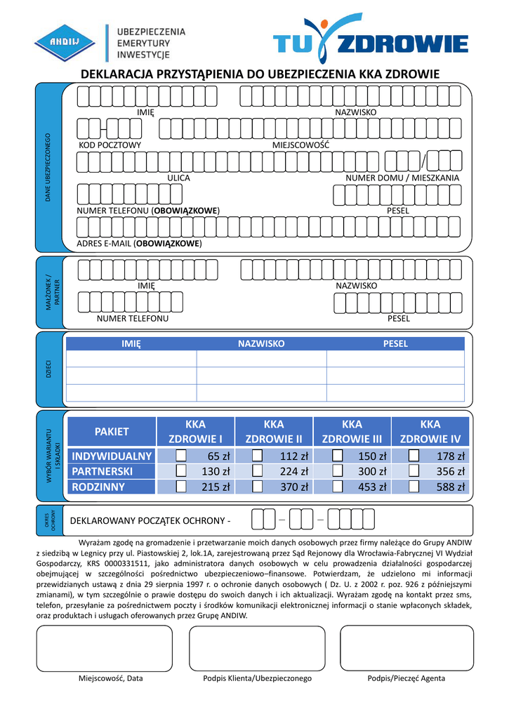 DEKLARACJA PRZYSTĄPIENIA DO UBEZPIECZENIA KKA ZDROWIE DANE UBEZPIECZONEGO IMIĘ NAZWISKO KOD POCZTOWY MIEJSCOWOŚĆ ULICA NUMER DOMU / MIESZKANIA NUMER TELEFONU (OBOWIĄZKOWE) PESEL MAŁŻONEK / PARTNER ADRES E-MAIL (OBOWIĄZKOWE) IMIĘ NAZWISKO NUMER TELEFONU PESEL NAZWISKO PESEL OKRES OCHRONY WYBÓR WARIANTU I SKŁADKI DZIECI IMIĘ PAKIET INDYWIDUALNY PARTNERSKI RODZINNY KKA ZDROWIE I 65 zł 130 zł 215 zł KKA ZDROWIE II 112 zł 224 zł 370 zł KKA ZDROWIE III 150 zł 300 zł 453 zł KKA ZDROWIE IV 178 zł 356 zł 588 zł DEKLAROWANY POCZĄTEK OCHRONY - Wyrażam zgodę na gromadzenie i przetwarzanie moich danych osobowych przez firmy należące do Grupy ANDIW z siedzibą w Legnicy przy ul. Piastowskiej 2, lok.1A, zarejestrowaną przez Sąd Rejonowy dla Wrocławia-Fabrycznej VI Wydział Gospodarczy, KRS 0000331511, jako administratora danych osobowych w celu prowadzenia działalności gospodarczej obejmującej w szczególności pośrednictwo ubezpieczeniowo–finansowe. Potwierdzam, że udzielono mi informacji przewidzianych ustawą z dnia 29 sierpnia 1997 r. o ochronie danych osobowych ( Dz. U. z 2002 r. poz. 926 z późniejszymi zmianami), w tym szczególnie o prawie dostępu do swoich danych i ich aktualizacji. Wyrażam zgodę na kontakt przez sms, telefon, przesyłanie za pośrednictwem poczty i środków komunikacji elektronicznej informacji o stanie wpłaconych składek, oraz produktach i usługach oferowanych przez Grupę ANDIW. Miejscowość, Data Podpis Klienta/Ubezpieczonego Podpis/Pieczęć Agenta OKRES OCHRONY UBEZPIECZONY Oświadczenia Klienta/Ubezpieczonego IMIĘ NAZWISKO PESEL DEKLAROWANY POCZĄTEK OCHRONY - Zakres grupowego ubezpieczenia zdrowotnego POLISA OPTIMA dla klientów P.U.H. ANDIW Andrzej Wątrobiński obejmuje dostęp do usług medycznych zgodnie z postanowieniami Ogólnych Warunków Grupowego Ubezpieczenia Zdrowotnego POLISA OPTIMA Towarzystwa Ubezpieczeń ZDROWIE SA o kodzie OWU/03/2016, zatwierdzonych Uchwałą Zarządu z dnia 21.01.2016 r. o numerze UZ/06/2016 oraz Katalogu Świadczeń POLISA OPTIMA z opcja zwrotów kosztów kodzie o kodzie KS/03/2016, zatwierdzonych Uchwałą Zarządu z dnia 21.01.2016 r. o numerze UZ/10/2016. 1. Oświadczam, że zostałem poinformowany, zgodnie z art. 24 ustawy z dnia 29 sierpnia 1997 roku o ochronie danych osobowych, że: administratorem moich danych osobowych (oraz danych osobowych członków mojej rodziny w opcji rodzinnej i partnerskiej ubezpieczenia) jest Towarzystwo Ubezpieczeń ZDROWIE S.A. z siedzibą w Gdyni ul. Śląska 21; mam prawo do wglądu moich danych osobowych oraz prawo ich poprawiania; moje dane (i członków mojej rodziny w opcji rodzinnej i partnerskiej ubezpieczenia), w tym dane dotyczące udzielonych usług medycznych (moich i członków mojej rodziny), są wykorzystywane w celu wykonania przez Towarzystwo Ubezpieczeń ZDROWIE S.A. umowy ubezpieczenia. 2. Wyrażam zgodę na przetwarzanie moich danych osobowych (i członków mojej rodziny w opcji rodzinnej i partnerskiej ubezpieczenia) podanych przez mnie, w tym danych dotyczących, lub mających wpływ na stan mojego zdrowia (lub mojej rodziny) przez Towarzystwo Ubezpieczeń ZDROWIE SA w celu realizacji umowy ubezpieczenia, a także na przekazanie danych do operatora medycznego odpowiedzialnego, za organizację usług medycznych oraz do Placówek Medycznych, które będą udzielały usług medycznych (zgodnie z ustawą z dnia 29 sierpnia 1997 r. o ochronie danych osobowych (Dz. U. 2002 Nr 101, poz. 926 ze zm.) i z ustawą z dnia 11 września 2015r. o działalności ubezpieczeniowej i reasekuracyjnej (Dz.U. 2015 poz. 1844 z późn. zm). 3. Upoważniam Towarzystwo Ubezpieczeń do zasięgania, zgodnie z obowiązującym prawem, wszelkich informacji dotyczących stanu mojego zdrowia (oraz stanu zdrowia członków mojej rodziny w opcji rodzinnej i partnerskiej) od każdego lekarza, u którego leczyłem(am) się lub zasięgałem(am) porady medycznej, a także we wszystkich placówkach medycznych, które udzielały mi usług medycznych. 4. Niniejszym potwierdzam, iż udostępnione zostały mi oraz członkom mojej rodziny (w opcji rodzinnej i partnerskiej ubezpieczenia) Ogólne Warunki Grupowego Ubezpieczenia Zdrowotnego POLISA OPTIMA Towarzystwa Ubezpieczeń ZDROWIE SA o kodzie OWU/03/2016, zatwierdzonych Uchwałą Zarządu z dnia 21.01.2016 r. o numerze UZ/06/2016 oraz Katalogu Świadczeń POLISA OPTIMA z opcja zwrotów kosztów kodzie o kodzie KS/03/2016, zatwierdzonych Uchwałą Zarządu z dnia 21.01.2016 r. o numerze UZ/10/2016 oraz Procedura Reklamacyjna przed przystąpieniem do umowy ubezpieczenia i wyrażaniem przeze mnie zgody na sfinansowanie kosztu składki.. 5. Oświadczam, że zgodnie z art. 60, 61 § 1 i 63 § 1 Kodeksu cywilnego (Dz.U. Nr 16, poz. 93, z późń.zm.) posiadam pisemne upoważnienie osób wskazanych w niniejszym wniosku do składania powyższych oświadczeń woli w ich imieniu, Osoby wskazane w niniejszym wniosku zostały zapoznane z treścią powyższych zapisów i świadomie wyrażają zgodę na złożenie powyższych oświadczeń również w ich imieniu. Świadomie przyjmuję do wiadomości, iż brak upoważnień uniemożliwia realizację umowy ubezpieczenia (dotyczy opcji rodzinnej i partnerskiej ubezpieczenia). TAK 6. Wyrażam zgodę na przekazywanie mi przez Towarzystwo Ubezpieczeń ZDROWIE S.A. korespondencji, w tym oświadczeń woli drogą elektroniczną na adres e-mailowy podany we wniosku lub na podany numer telefonu komórkowego. Jednocześnie zobowiązuję się w przypadku zmiany adresu e-mailowego lub numeru telefonu komórkowego do niezwłocznego przekazania nowych danych Towarzystwu Ubezpieczeń ZDROWIE SA TAK Miejscowość, Data NIE Podpis Klienta/Ubezpieczonego