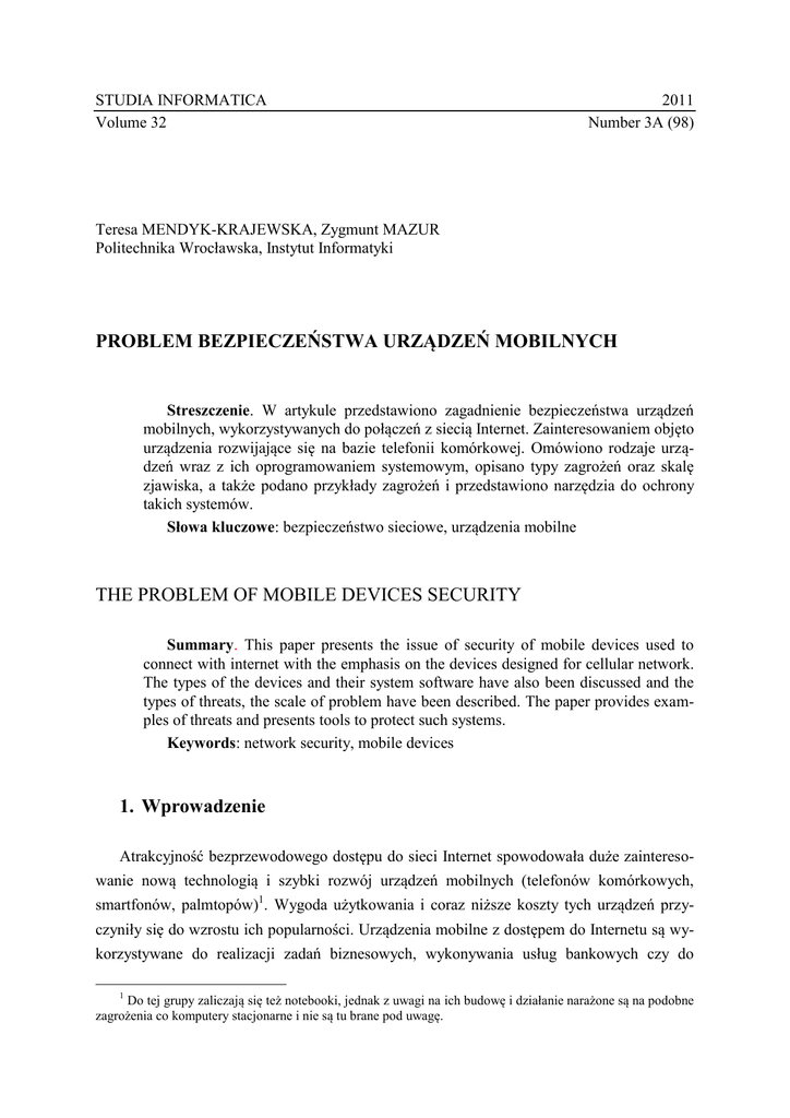 STUDIA INFORMATICA Volume 32 2011 Number 3A (98) Teresa MENDYK-KRAJEWSKA, Zygmunt MAZUR Politechnika Wrocławska, Instytut Informatyki PROBLEM BEZPIECZEŃSTWA URZĄDZEŃ MOBILNYCH Streszczenie. W artykule przedstawiono zagadnienie bezpieczeństwa urządzeń mobilnych, wykorzystywanych do połączeń z siecią Internet. Zainteresowaniem objęto urządzenia rozwijające się na bazie telefonii komórkowej. Omówiono rodzaje urządzeń wraz z ich oprogramowaniem systemowym, opisano typy zagrożeń oraz skalę zjawiska, a także podano przykłady zagrożeń i przedstawiono narzędzia do ochrony takich systemów. Słowa kluczowe: bezpieczeństwo sieciowe, urządzenia mobilne THE PROBLEM OF MOBILE DEVICES SECURITY Summary. This paper presents the issue of security of mobile devices used to connect with internet with the emphasis on the devices designed for cellular network. The types of the devices and their system software have also been discussed and the types of threats, the scale of problem have been described. The paper provides examples of threats and presents tools to protect such systems. Keywords: network security, mobile devices 1. Wprowadzenie Atrakcyjność bezprzewodowego dostępu do sieci Internet spowodowała duże zainteresowanie nową technologią i szybki rozwój urządzeń mobilnych (telefonów komórkowych, smartfonów, palmtopów)1. Wygoda użytkowania i coraz niższe koszty tych urządzeń przyczyniły się do wzrostu ich popularności. Urządzenia mobilne z dostępem do Internetu są wykorzystywane do realizacji zadań biznesowych, wykonywania usług bankowych czy do 1 Do tej grupy zaliczają się też notebooki, jednak z uwagi na ich budowę i działanie narażone są na podobne zagrożenia co komputery stacjonarne i nie są tu brane pod uwagę. 156 T. Mendyk-Krajewska, Z. Mazur zakupów. Używane są chętnie przez menedżerów i pracowników przedsiębiorstw, umożliwiając im stały kontakt oraz dostęp do wspólnych zasobów firmowych (nawet podczas wyjazdów służbowych). Wraz z rosnącą popularnością urządzeń mobilnych obserwuje się coraz większe zainteresowanie sieciowych przestępców możliwością uzyskania nielegalnych zysków za ich pośrednictwem, ponieważ niemal na każdym urządzeniu przechowywane są ważne i poufne informacje. Pierwsze szkodliwe programy dla systemów mobilnych nie różniły się od kodów atakujących sieci komputerowe. Zjawisko zagrożenia bezpieczeństwa początkowo nie przybierało znacząco na sile z powodu dużej różnorodności wykorzystywanych platform systemowych, gdyż na rynku, oprócz smartfonów Nokii z systemem operacyjnym Symbian, wkrótce pojawiły się inne urządzenia – na przykład iPhone firmy Apple z systemem iOS, czy obsługiwany przez wielu producentów telefonów komórkowych Windows Mobile, firmy Microsoft. Praktyka pokazuje, że o wyborze systemu komputerowego na cel ataków (a więc tworzeniu szkodliwych kodów) przesądza właśnie jego popularność. W przypadku urządzeń mobilnych znaczący rozwój zagrożeń wiąże się z opracowaniem wirusów uniwersalnych, przystosowanych do atakowania wielu różnych platform systemowych. 2. Rodzaje urządzeń mobilnych Do szerokiej gamy urządzeń mobilnych zalicza się: PDA (Personal Digital Assistant) – pierwszy, bardzo mały komputer osobisty zwany palmtopem (1992 r.), palmofon – PDA z telefonem, ekranem dotykowym i głośnikami, smartfon – połączenie telefonu i komputera, netbook – mniejszy od notebooka, o mniejszych możliwościach (na ogół bez napędu CD/DVD), tablet PC – rodzaj komputera wyposażonego w ekran dotykowy o parametrach porównywalnych z notebookami, MDA (Mobile Digital Assistant) – połączenie palmtopa z telefonem komórkowym oraz wbudowanym modemem GSM2, e-book – tzw. książka elektroniczna (urządzenie do czytania tekstów pobieranych z Internetu), smartbook – wyposażony w mikrofon, głośniki, kamerę (umożliwia komunikację za pomocą komunikatorów internetowych). Jest jeszcze wiele innych urządzeń przenośnych umożliwiających przesyłanie plików, na przykład aparaty i kamery cyfrowe, urządzenia do nawigacji satelitarnej, odtwarzacze MP3, skanery. Klasyfikacja urządzeń mobilnych staje się coraz trudniejsza, gdyż ich funkcjonalności są stale rozbudowywane. Poszczególne urządzenia, nawet w tej samej kategorii, różnią się między innymi: budową, wielkością, sposobem interakcji z użytkownikiem. Projektowanie dla 2 Global System for Mobile Communications – obecnie najpopularniejszy standard telefonii komórkowej. Problem bezpieczeństwa urządzeń mobilnych 157 nich aplikacji użytkowych, rozpoznających rodzaj urządzenia i dostosowujących do ekranu wyświetlaną treść jest zadaniem złożonym [2]. Wśród urządzeń mobilnych obecnie trudno jest wskazać jednego lidera. Na rynku konkuruje ze sobą wiele firm, oferujących dużą gamę urządzeń pracujących na różnych platformach systemowych. Pierwsze miejsce należało przez pewien czas do fińskiej firmy Nokia, wkrótce jednak pojawiły się inne firmy, których produkty również zyskały dużą popularność. Obecnie dostępne są także urządzenia takich firm, jak: RIM, Apple, Google i wielu innych. Liczne urządzenia mobilne są ukierunkowane na najczęściej poszukiwane funkcjonalności, czyli możliwość komunikacji i dostęp do Internetu, ze szczególnym uwzględnieniem serwisów społecznościowych. Stąd w niektórych z nich są specjalne przyciski, umożliwiające bezpośredni dostęp do popularnych serwisów społecznościowych, jak Facebook czy Twitter. Rozwijające się technologie sprawiają, że dostęp do Internetu z wykorzystaniem urządzeń mobilnych jest coraz szybszy i wygodniejszy. W grudniu 2010 roku firma Google udostępniała bezpłatnie testowe netbooki Cr-48 z automatycznie aktualizowanym systemem operacyjnym Google Chrome OS, bez dysku twardego, z łącznością Wi-Fi i z połączeniem w technologi