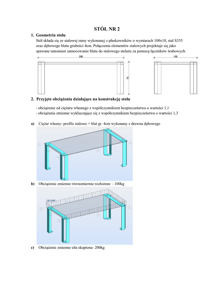 STÓŁ NR 2 1. Geometria stołu Stół składa się ze stalowej ramy wykonanej z płaskowników o wymiarach 100x10, stal S355 oraz dębowego blatu grubości 4cm. Połączenia elementów stalowych projektuje się jako spawane natomiast zamocowanie blatu do stalowego stelażu za pomocą łączników śrubowych. 2. Przyjęte obciążenia działające na konstrukcję stołu - obciążenie od ciężaru własnego z współczynnikiem bezpieczeństwa o wartości 1,1 - obciążenia zmienne wykluczające się z współczynnikiem bezpieczeństwa o wartości 1,3 a) Ciężar własny- profile stalowe + blat gr. 4cm wykonany z drewna dębowego b) Obciążenie zmienne równomiernie rozłożone – 100kg c) Obciążenie zmienne siła skupiona- 200kg d) Obciążenie zmienne poziome wzdłuż dłuższej krawędzi- 200kg e) Obciążenie zmienne poziome wzdłuż krótszej krawędzi- 200kg 3. Obliczenia dla ramy stalowej wykonanej z płaskownika 10x100mm 3.1. Weryfikacja prętów w stanie granicznym nośności przeprowadzona wg PN-90/B-03200 ZASTOSOWANY MATERIAŁ Gatunek stali: S 355 Wytrzymałość obliczeniowa stali: fd = 305.00 MPa Moduł Younga: E = 210000.00 MPa CHARAKTRYSTYKI GEOMETRYCZNE PŁASKOWNIKA 10x100mm h=10.0 cm b=1.0 cm -wysokość i szerokość przekroju 2 2 Ay=0.91 cm Az=9.09 cm Ax=10.00 cm2 -pole przekroju Iy=83.33 cm4 Iz=0.83 cm4 Ix=3.12 cm4 -momenty bezwładności 3 3 Wely=16.67 cm Welz=1.67 cm -wskaźniki wytrzymałości przekroju na zginanie a) Elementy pionowe- słupy OBCIĄŻENIA: Decydujący przypadek obciążenia: a∙1.10+e∙1.30 SIŁY WEWNĘTRZNE I NOŚNOŚCI: N = 4.38 kN My = 0.09 kNm Mz = -0.13 kNm Nrc = 305.00 kN Mry = 0.51 kNm Mrz = 5.08 kNm Mry_v = 0.51 kNm Mrz_v = 5.08 kNm Vy = 0.06 kN Vry = 160.82 kN Vz = 0.21 kN Vrz = 16.08 kN KLASA PRZEKROJU = 2 By∙Mymax = 0.09 kNm Bz∙Mzmax = -0.13 kNm PARAMETRY WYBOCZENIOWE: Względem osi Y: Ly = 0.71 m Lambda_y = 6.86 Lwy = 1.42 m Ncr y = 8.57 kN Lambda y = 491.90 Wzgledem osi Z: Lz = 0.71 m Lwz = 0.71 m fi y = 0.02 Lambda_z = 0.34 Ncr z = 3426.27 kN FORMUŁY WERYFIKACYJNE: N/(fi∙Nrc)+By∙Mymax/(fiL∙Mry)+Bz∙Mzmax/Mrz = 0.68 + 0.18 + 0.03 = 0.88 < 1.00 Vy/Vry = 0.00 < 1.00 Vz/Vrz = 0.01 < 1.00 b) Elementy poziome OBCIĄŻENIA: Decydujący przypadek obciążenia: a∙1.10+d∙1.30 SIŁY WEWNĘTRZNE I NOŚNOŚCI: N = 0.77 kN My = -0.10 kNm Mz = 0.02 kNm Nrc = 305.00 kN Mry = 0.51 kNm Mrz = 5.08 kNm Mry_v = 0.51 kNm Mrz_v = 5.08 kNm Vy = 0.16 kN Vry = 160.82 kN Vz = -1.69 kN Vrz = 16.08 kN KLASA PRZEKROJU = 2 By∙Mymax = -0.10 kNm Bz∙Mzmax = 0.02 kNm FORMUŁY WERYFIKACYJNE: N/(fi∙Nrc)+By∙Mymax/(fiL∙Mry)+Bz∙Mzmax/Mrz = 0.00 + 0.20 + 0.00 = 0.21 < 1.00 Vy/Vry = 0.00 < 1.00 Vz/Vrz = 0.11 < 1.00 3.2. Weryfikacja prętów w stanie użytkowalności a) Elementy pionowe- słupy Przemieszczenia vx = 0.8 cm > vx max = L/150.00 = 0.5 cm Nie zweryfikowano Decydujący przypadek obciążenia: (a+e)∙1.00 vy = 0.5 cm < vy max = L/150.00 = 0.5 cm Zweryfikowano Decydujący przypadek obciążenia: (a+e)∙1.00 b) Elementy poziome Ugięcia uy = 0.0 cm < uy max = L/250.00 = 0.3 cm Zweryfikowano Decydujący przypadek obciążenia: (a+e)∙1.00 uz = 0.1 cm < uz max = L/250.00 = 0.3 cm Zweryfikowano Decydujący przypadek obciążenia: (a+d)∙1.00 3.2.1 Deformacje a) Kombinacja obciążeń: a+b b) Kombinacja obciążeń: a+c c) Kombinacja obciążeń: a+d d) Kombinacja obciążeń: a+e 4. Momenty zginające blat stołu [kNm/m] Kombinacja 1 Kombinacja 2 Kombinacja 3 Kombinacja 4