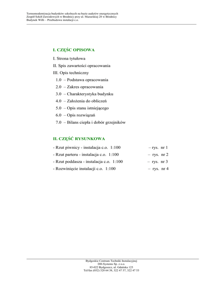 Termomodernizacja budynków szkolnych na bazie audytów energetycznych Zespół Szkół Zawodowych w Brodnicy przy ul. Mazurskiej 28 w Brodnicy Budynek Willi – Przebudowa instalacji c.o. I. CZĘŚC OPISOWA I. Strona tytułowa II. Spis zawartości opracowania III. Opis techniczny 1.0 – Podstawa opracowania 2.0 – Zakres opracowania 3.0 – Charakterystyka budynku 4.0 – Założenia do obliczeń 5.0 – Opis stanu istniejącego 6.0 – Opis rozwiązań 7.0 – Bilans ciepła i dobór grzejników II. CZĘŚĆ RYSUNKOWA - Rzut piwnicy - instalacja c.o. 1:100 – rys. nr 1 - Rzut parteru - instalacja c.o. 1:100 – rys. nr 2 - Rzut poddasza - instalacja c.o. 1:100 – rys. nr 3 - Rozwinięcie instalacji c.o. 1:100 – rys. nr 4 Bydgoskie Centrum Techniki Instalacyjnej DH-Systems Sp. z o.o. 85-022 Bydgoszcz, ul. Gdańska 125 Tel/fax (052) 328 64 38, 322 47 57, 322 47 53 Termomodernizacja budynków szkolnych na bazie audytów energetycznych Zespół Szkół Zawodowych w Brodnicy przy ul. Mazurskiej 28 w Brodnicy Budynek Willi – Przebudowa instalacji c.o. 3 III. OPIS TECHNICZNY DO PROJEKTU PRZEBUDOWY INSTALACJI C.O. W BUDYNKU WILLI ZESPOŁU SZKÓŁ ZAWODOWYCH W BRODNICY, UL. MAZURSKA 28 1.0 Podstawa opracowania - Zlecenie Inwestora, Podkłady architektoniczno-budowlane, Inwentaryzacja instalacji grzewczej, Audyt energetyczny budynku wykonany przez Zbigniewa Wyszogrodzkiego w październiku 2011 r. Warunki PEC sp. Z o.o. pismo DT/3524/2014 z dnia 25 lipca 2012 r. Aktualne normy i przepisy. 2.0 Zakres opracowania Opracowanie obejmuje projekt przebudowy instalacji c.o. polegającej na wymianie grzejników w budynku Willi Zespołu Szkół Zawodowych przy ul. Mazurskiej 28 w Brodnicy. 3.0 Charakterystyka budynku 1. Kubatura ogrzewana: 2. Ogólna strata ciepła dla c.o. 3. Wskaźnik kubaturowy: 1749,1m3 59,02 kW 33,74 W/m3 4.0 Założenia do obliczeń A – Zestawienie norm: PN-EN 12831:2006, PN-EN ISO 6946, PN-EN ISO 10077-1. B – Dane wyjściowe do obliczeń: - rodzaj budynku: konstrukcja tradycyjna murowana - rodzaj ogrzewania: grzejnikowe 80/60oC z węzła cieplnego - strefa klimatyczna: III o - temperatura obliczeniowa zewnętrzna: -20 C - praca ogrzewania: ciągła z obniżeniem nocnym Bydgoskie Centrum Techniki Instalacyjnej DH-Systems Sp. z o.o. 85-022 Bydgoszcz, ul. Gdańska 125 Tel/fax (052) 328 64 38, 322 47 57, 322 47 53 Termomodernizacja budynków szkolnych na bazie audytów energetycznych Zespół Szkół Zawodowych w Brodnicy przy ul. Mazurskiej 28 w Brodnicy Budynek Willi – Przebudowa instalacji c.o. 4 Współczynniki przenikania ciepła przegród budowlanych przyjęte do obliczeń strat ciepła (na podstawie audytu energetycznego): - ściany zewnętrzne - stropodach - podłoga w piwnicy - strop nad piwnicą - okno zewnętrzne - drzwi zewnętrzne k = 1,062 W/m2 k = 1,467 W/m2 k = 0,179 W/m2 k = 0,210 W/m2 k = 0,375 W/m2 k = 1,055 W/m2 k = 1,3 W/m2 k = 2,6 W/m2 Obliczenia strat ciepła wykonano w programie Purmo OZC – wersja 4.8 Pro. 5.0 Opis stanu istniejącego Budynek Willi jest budynkiem murowanym w kształcie litery „T”. Jest obiektem dwukondygnacyjnym z poddaszem częściowo zaadaptowanym na mieszkania. Budynek jest całościowo podpiwniczony. Ściany murowane z cegły pełnej na zaprawie cementowo – wapiennej. Budynek pokryty jest dachem dwuspadowym. Konstrukcja dachu drewniana – mieszana. Pokrycie dachówką ceramiczną na łatach. Budynek wpisany jest do gminnego rejestru zabytków. Źródłem ciepła dla budynku jest węzeł cieplny wymiennikowy, dwufunkcyjny c.o. i c.w.u. zlokalizowany w budynku głównym. Instalacja c.o. w budynku Willi jest dwuprzewodowa z rozdziałem dolnym o parametrach szczytowych 90/70oC - systemu zamkniętego. Przewody rozprowadzające instalacji prowadzone są nad posadzkami piwnic oraz w kanałach podposadzkowych. Piony prowadzone są natynkowo przy ścianach zewnętrznych. Odpowietrzenie instalacji pod stropem ostatnich kondygnacji zebrane do jednego naczynia odpowietrzającego zlokalizowanego w pom. 101 na poddaszu. Instalacja wykonana jest z rur stalowych czarnych wg PN-74/H-74200 łączonych przez spawanie. Instalacja c.o. budynku zasilana jest z rozdzielaczy instalacyjnych zlokalizowanych w pom nr 02 w piwnicy. Rozdzielacz posiada dwa odejścia : - odejście o średnicy Ø32, - odejście o średnicy Ø32, Na odejściach nie zastosowano elementów regulacji hydraulicznej. Elementy grzejne instalacji stanowią grzejniki stalowe płytowokonwektorowe, z rur stalowych ożebrowanych typu GŻ-2, GŻ-3 wg PN-67/B40020. Grzejniki wyposażone są w zawory grzejnikowe pojedynczej regulacji. Bydgoskie Centrum Techniki Instalacyjnej DH-Systems Sp. z o.o. 85-022 Bydgoszcz, ul. Gdańska 125 Tel/fax (052) 328 64 38, 322 47 57, 322 47 53 Termomodernizacja budynków szkolnych na bazie audytów energetycznych Zespół Szkół Zawodowych w Brodnicy przy ul. Mazurskiej 28 w Brodnicy Budynek Willi – Przebudowa instalacji c.o. 5 6.0 Opis rozwiązań 6.1 Opis instalacji c.o. Przebudowa instalacji c.o. obejmuje wymianę wszystkich grzejników w budynku na nowe stalowe płytowo-konwektorowe oraz regulację hydrauliczną instalacji. Instalację rurową pozostawia się bez zmian z uwzględnieniem niezbędnych modernizacji na potrzeby podłączenia nowych grzejników. Wymianie ulegają gałązki grzejnikowe . Parametry instalacji 80/60oC. Rozdział ciepła na poszczególne obiegi grzewcze w budynku realizuje się na istniejącym rozdzielaczu instalacyjnym w pom. nr 02 w piwnicy – zgodnie z rys. nr 1. Dobór grzejników oraz nastawy przedstawiono na rzutach oraz rozwinięciu instalacji c.o. – rys. nr 1- 3. Zdemontować istniejące kryzy dławiące z połączeń kołnierzowych pod pionami. 6.2 Elementy grzejne Elementy grzejne modernizowanej instalacji stanowią stalowe grzejniki płytowo-konwektorowe z podejściem bocznym. Rodzaje, wielkości, rozmieszczenie oraz ilości grzejników podane są na rysunkach oraz w zestawieniu. 6.3 Rurociągi oraz arma