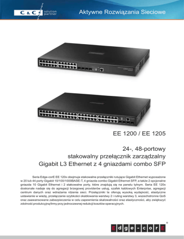 Aktywne Rozwiązania Sieciowe EE 1200 / EE 1205 24-, 48-portowy stakowalny przełącznik zarządzalny Gigabit L3 Ethernet z 4 gniazdami combo SFP Seria Edge-corE EE 120x obejmuje stakowalne przełączniki rutujące Gigabit Ethernet wyposażone w 20 lub 44 porty Gigabit 10/100/1000BASE-T, 4 gniazda combo Gigabit Ethernet SFP, a także 2 opcjonalne gniazda 10 Gigabit Ethernet i 2 stakowalne porty, które znajdują się na panelu tylnym. Seria EE 120x doskonale nadaje się do agregacji brzegowej providerów usług, szafek kablowych Enterprise, agregacji centrum danych oraz wdrażania rdzenia sieci. Przełączniki te oferują wysoką wydajność, elastyczne ustawianie w wieżę, przełączanie szybkości okablowania warstwy 2 i ruting warstwy 3, wszechstronne QoS oraz zaawansowane zabezpieczenia w celu zapewnienia skalowalności oraz elastyczności, aby zwiększyć zdolność produkcyjną firmy przy jednoczesnej redukcji kosztów operacyjnych. Aktywne Rozwiązania Sieciowe Kluczowe cechy i zalety Elastyczne ustawianie w wieżę do 8 urządzeń: Seria Edge-corE EE 120x obecnie obejmuje dwa różne modele EE 1200 oraz EE 1205 z podwójnymi opcjonalnymi uplinkami 10 Gigabit Ethernet. Te dwa modele zapewniają pełną funkcjonalność bez blokowania, aby sprostać największym potrzebom sieciowym w zakresie przesyłania strumieni głosowych i wideo. Opcjonalne nadajniki-odbiorniki 10GBASE-XFP mogą obsługiwać uplinki światłowodowe o długości do 40 km. Seria Edge-corE EE 120x wyposażona jest w dwa porty stakowalne w celu ustawienia sprzętu w wieżę o przepustowości maks. 320 Gbps. Każde urządzenie z serii EE 120x może być zestawiane w wieżę składającą się maks. z 8 urządzeń lub z maks. 400 portów. Stos urządzeń pełni rolę pojedynczego urządzenia przełączającego, które zarządzane jest przez przełącznik nadrzędny, wybierany spośród przełączników z zestawu. Przełącznik nadrzędny automatycznie tworzy i aktualizuje wszystkie tablice przełączania oraz opcjonalne tablice rutowania. Do działającego stosu można dodawać nowe urządzenia lub usuwać stare bez konieczności przerywania pracy urządzeń na czas serwisu. Wysoka dostępność : Dzięki protokołowi Rapid Spanning Tree (IEEE 802.1w), seria Edge-corE EE 120x zapewnia sieć pozbawioną pętli oraz rezerwowe łącza do sieci rdzeniowej z błyskawiczną zbieżnością, która dokonywana jest w czasie krótszym niż 2 sekundy. Protokół Multiple Spanning Tree (IEEE 802.1s ) umożliwia wystąpienie algorytmu spanning-tree dla każdej sieci VLAN w celu rozłożenia obciążenia warstwy 2 na rezerwowych łączach. Seria Edge-corE EE 120x obsługuje protokół Link Aggregation Control (IEEE 802.3ad ). Powoduje on zwiększenie przepustowości poprzez automatyczną agregację wielu fizycznych łączy w formie logicznej magistrali oraz zapewnia zrównoważenie obciążenia oraz odporność na błędy w przypadku połączeń uplink. Dołożenie opcjonalnego rezerwowego źródła zasilania sprawia, że przełączniki serii Edge-corE EE 120x zapewniają stabilną i rezerwową dostawę energii na potrzeby aktualnego środowiska pracy o wysokiej dostępności oraz kluczowym znaczeniu. Kompleksowa usługa QoS: Seria Edge-corE EE 120x oferuje zaawansowaną usługę QoS w zakresie marking'u, klasyfikowania, a także planowania w celu zapewnienia najlepszą w swojej klasie wydajność dla ruchu danych, głosu i wideo przy szybkości okablowania. 8 kolejek dla punktu wyjścia dla każdego portu umożliwia zróżnicowane zarządzanie do 8 typów ruchu w zakresie stosu. Ruch jest klasyfikowany pod względem ważności zgodnie ze standardem 802.1p, DSCP, IP precedence oraz numerem portu TCP/UDP, co zapewnia optymalne działanie w przypadku rozwiązań w czasie rzeczywistym. Priorytet WRR i strict zapewnia zróżnicowaną klasyfikację ważności przepływów pakietów oraz pozwala uniknąć przeciążenia kolejek w punkcie wejścia i wyjścia. Poprzez dwukierunkowe ograniczanie przepustowości dla każdej klasy portu i ruchu urządzenia serii EdgecorE EE 120x chronią przepustowość sieci oraz zapewniają maksymalną kontrolę zasobów sieciowych. Zaawansowane zabezpieczenia: Seria Edg-corE EE 120x posiada funkcje zaawansowanych zabezpieczeń w zakresie połączeń i kontroli dostępu, w szczególności listy ACL, uwierzytelnianie oraz zabezpieczenia na poziomie portów przy zastosowaniu standardu IEEE 802.1X. W celu ograniczenia dostępu do poufnych zasobów sieciowych używane są listy kontroli dostępu (ACL) poprzez odrzucanie pakietów opartych na nagłówkach warstwy 2, 3 i 4. Uwierzytelnienie SSH i RADIUS zapewnia ochronę podczas przekazywania danych oraz gwarantuje prywatność tych danych. Kontrola dostępu w oparciu o porty zgodnie ze standardem IEEE 802.1X zapewnia dynamiczne, oparte na portach zabezpieczenia oraz uwierzytelnianie użytkownika w zakresie dostępu do Aktywne Rozwiązania Sieciowe sieci. Ochrona źródła IP zabezpiecza przed atakami złośliwych użytkowników, które polegają na fałszowaniu lub przejmowaniu adresu IP innego użytkownika poprzez tworzenie tablicy powiązań między adresem IP i MAC klienta, portem oraz siecią VLAN. Uproszczone zarządzanie W przypadku ruchu multicastów IP urządzenie Edge-corE umożliwia IGMP snooping w celu zapewnienia szybkich kanałów wejść i wyjść strumieni multicastów. Zapobiega to przepełnieniu ruchu multicastów IP oraz ogranicza szerokopasmowy intensywny ruch wideo wyłącznie dla subskrybentów. Seria Edge-corE EE 120x obsługuje funkcje zarządzania IPv6 w zakresie uwierzytelniania SNMP/HTTP/Telnet/TFTP/ICMP, SSH, RADIUS/TACACS+ oraz przemapowania IPv6 QoS, gdy następuje połączenie z przełącznikiem lub stosem. Seria ta może być zarządzana poprzez spełniający standardy branżowe interfejs CLI w zakresie wyglądu i działania, co eliminuje konieczność szkoleń oraz zmniejsza koszty operacyjne. Zapewnia on także łatwy w użyci