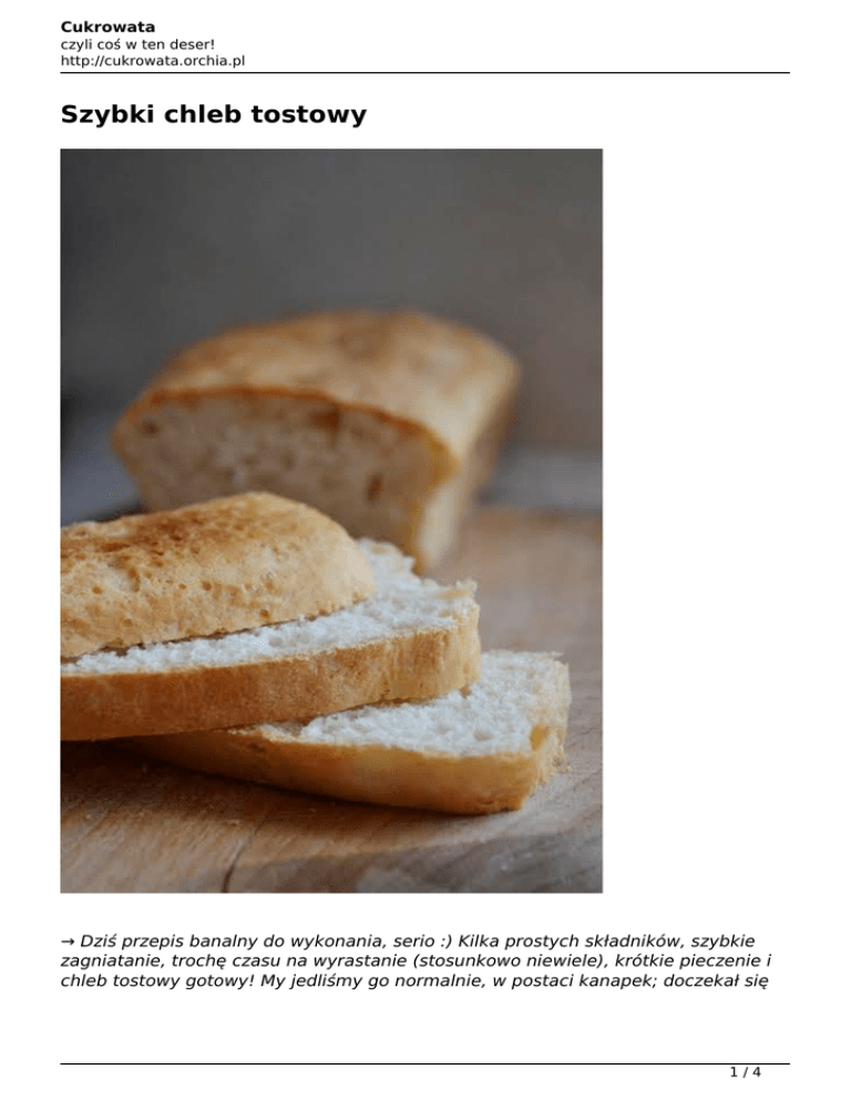 Cukrowata czyli coś w ten deser! http://cukrowata.orchia.pl Szybki chleb tostowy → Dziś przepis banalny do wykonania, serio :) Kilka prostych składników, szybkie zagniatanie, trochę czasu na wyrastanie (stosunkowo niewiele), krótkie pieczenie i chleb tostowy gotowy! My jedliśmy go normalnie, w postaci kanapek; doczekał się 1/4 Cukrowata czyli coś w ten deser! http://cukrowata.orchia.pl też zrobienia z niego domowych zapiekanek - były pyszne! Sam chleb jest klasyczny, może nic wielkiego, może eksplozji smaków nie było, ale ale! Jest domowym wypiekiem, a te ceni się podwójnie :) Spróbujcie, będziecie zadowoleni! Składniki: 15 g drożdży 1 łyżeczka cukru 220 g letniej wody 330 g mąki pszennej 1 płaska łyżeczka soli 2 łyżki oleju Wykonanie: Przygotować zaczyn: w miseczce zmieszać drożdże z cukrem i połową przygotowanej wody, przykryć tkaniną lub talerzykiem i odstawić w ciepłe miejsce na około 15 minut. W tym czasie do miski przesiać mąkę i sól. Do mąki dodać zaczyn, wymieszać dłońmi, stopniowo dodawać wodę i wyrabiać nieco lepiące się do rąk ciasto. Blaszkę (keksówkę 30 cm x 10 cm) wysmarować olejem i podsypać kaszą manną*. Przełożyć do niej ciasto i posmarować wierzch olejem. Przykryć całość tkaniną i pozostawić w ciepłym miejscu na około 1,5 godziny - po tym czasie ciasto wypełni całą foremkę. Rozgrzać piekarnik do 210*C i piec w nim chleb przez około 20-25 minut. Po upieczeniu wyjąć z blaszki i wystudzić na kratce. I gotowe! :) *można też użyć bułki tartej 2/4 Cukrowata czyli coś w ten deser! http://cukrowata.orchia.pl 3/4 Cukrowata czyli coś w ten deser! http://cukrowata.orchia.pl Źródło inspiracji: http://kotlet.tv/chleb-tostowy-dla-leniwych/ 4/4 Powered by TCPDF (www.tcpdf.org)