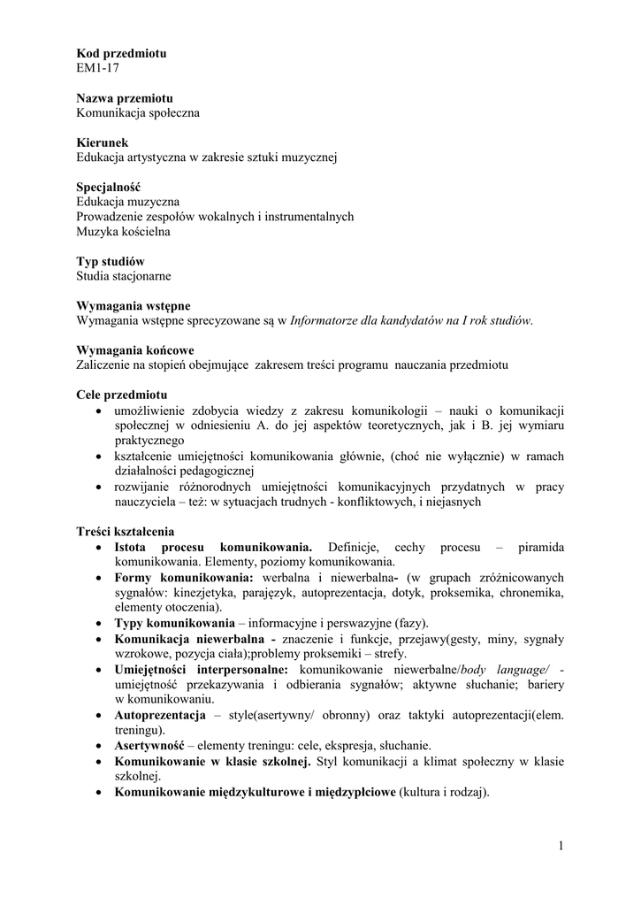 Kod przedmiotu EM1-17 Nazwa przemiotu Komunikacja społeczna Kierunek Edukacja artystyczna w zakresie sztuki muzycznej Specjalność Edukacja muzyczna Prowadzenie zespołów wokalnych i instrumentalnych Muzyka kościelna Typ studiów Studia stacjonarne Wymagania wstępne Wymagania wstępne sprecyzowane są w Informatorze dla kandydatów na I rok studiów. Wymagania końcowe Zaliczenie na stopień obejmujące zakresem treści programu nauczania przedmiotu Cele przedmiotu umożliwienie zdobycia wiedzy z zakresu komunikologii – nauki o komunikacji społecznej w odniesieniu A. do jej aspektów teoretycznych, jak i B. jej wymiaru praktycznego kształcenie umiejętności komunikowania głównie, (choć nie wyłącznie) w ramach działalności pedagogicznej rozwijanie różnorodnych umiejętności komunikacyjnych przydatnych w pracy nauczyciela – też: w sytuacjach trudnych - konfliktowych, i niejasnych Treści kształcenia Istota procesu komunikowania. Definicje, cechy procesu – piramida komunikowania. Elementy, poziomy komunikowania. Formy komunikowania: werbalna i niewerbalna- (w grupach zróżnicowanych sygnałów: kinezjetyka, parajęzyk, autoprezentacja, dotyk, proksemika, chronemika, elementy otoczenia). Typy komunikowania – informacyjne i perswazyjne (fazy). Komunikacja niewerbalna - znaczenie i funkcje, przejawy(gesty, miny, sygnały wzrokowe, pozycja ciała);problemy proksemiki – strefy. Umiejętności interpersonalne: komunikowanie niewerbalne/body language/ umiejętność przekazywania i odbierania sygnałów; aktywne słuchanie; bariery w komunikowaniu. Autoprezentacja – style(asertywny/ obronny) oraz taktyki autoprezentacji(elem. treningu). Asertywność – elementy treningu: cele, ekspresja, słuchanie. Komunikowanie w klasie szkolnej. Styl komunikacji a klimat społeczny w klasie szkolnej. Komunikowanie międzykulturowe i międzypłciowe (kultura i rodzaj). 1 Strategie wywierania wpływu na innych. Obrona przed wpływem manipulacyjnym. Zamierzone efekty kształcenia Po ukończeniu 30 h nauczania przedmiotu komunikacja społeczna studenci powinni: w zakresie wiedzy znać i rozumieć istotę procesów komunikowania społecznego – głównie interpersonalnego, w szczególności na obszarze działań pedagogicznych – dydaktyczno-wychowawczo-opiekuńczych w zakresie umiejętności posiadać rozwinięte kompetencje komunikacyjne, szczególnie wobec wszystkich uczestników procesu wychowania być przygotowani do współpracy z innymi muzykami w różnego typu zespołach oraz w ramach innych wspólnych prac i projektów, także o charakterze multidyscyplinarnym EM_U06 umieć skutecznie porozumiewać się z osobami pochodzącymi z odmiennych środowisk, o różnej kondycji emocjonalnej i potrafić dialogowo rozwiązywać konflikty U-U i N-U; tworzyć właściwą atmosferę komunikowania się w klasie szkolnej w zakresie kompetencji społecznych charakteryzować się szczególnie rozwiniętymi umiejętnościami skutecznego komunikowania interpersonalnego, wspierać swych wychowanków na drodze samorozwoju, wspomagać ich procesy uczenia się skutecznie porozumiewać się z uczestnikami procesu edukacyjnego i szerszym środowiskiem EM_K11 posiadać umiejętność współpracy, integracji i negocjacji podczas realizacji zespołowych zadań projektowych oraz przy pracach organizacyjnych i artystycznych związanych z różnymi przedsięwzięciami kulturalnymi EM_K12 w sposób zorganizowany podchodzić do rozwiązywania problemów dotyczących szeroko pojętych prac projektowych, jak również własnych działań artystycznych EM_K13 w sposób świadomy i profesjonalny umieć zaprezentować własną działalność artystyczną EM_K14 Formy kształcenia Wykład zbiorowy Nakład pracy studenta niezbędny do osiągnięcia zamierzonych efektów kształcenia Rok I II III Semestr 1 2 3 4 5 6 Punkty ECTS 1 1 Liczba godzin 1 1 w tygodniu Rodzaj zaliczenia s s Legenda s – zaliczenie ze stopniem Kryteria oceny: 1.Obecność na zajęciach/szczególnie istotna podczas zajęć treningowych. 2. Poziom przygotowania do zajęć, aktywny udział w zajęciach. 3. Podejmowanie zadań indywidualnych. 4. Pozytywna ocena z kolokwium zaliczeniowego. Literatura* /fragmenty/ 1. Covey S., R., Komunikacja synergiczna (Stewart, J., red. pracy zbiorowej, Mosty zamiast 2 murów – O komunikowaniu się między ludźmi, PWN, W-wa 2002. 1. Dobek-Ostrowska B., Podstawy komunikowania społecznego, Wyd. Astrum, W-w 1999. 2. Doliński D., Ekspresja emocji, emocje podstawowe i pochodne. /W/: Strelau,J.,red.nauk., Psychologia podręcznik akademicki –psychologia ogólna, t. II, s. 352-368. 3. Ernst K., Szkolne gry uczniów - Jak sobie z nimi radzić, WSiP, W-wa 1991. 4. Gordon T., Wychowanie bez porażek w szkole, Wyd. PAX, W-wa 1991. 5. Grzesiuk L., Trzebińska E., Jak ludzie porozumiewają się, Nasza Księgarnia, 1978. 6. Hartley P., Komunikowanie interpersonalne, Wyd. Astrum, Wrocław, 2006. 7. Jak żyć z ludźmi (umiejętności interpersonalne – program profilaktyczny dla młodzieży, MEN Agencja Informacji Użytkowej, W-wa 1988, rozdz.5 i 6. 8. Ken E., Szkolne gry uczniów – jak sobie z nimi radzić. WSiP, W-wa 1991. 9. McKay,M., Davis M., Fanning, P., Sztuka skutecznego porozumiewania się, GWP,2003. 10. Pease A i B., Mowa ciała, Dom Wyd. Rebis, Poznań 2007. 11. Sztejnberg A., Podstawy komunikacji spolecznej w edukacji, Wyd. Astrum, W-w 2002. 12. Warner T., Umiejętności w komunikowaniu się, Wyd. Astrum, Wrocław 1999. Z możliwością uzupełnienia o: 13. Doliński D., Psychologia reklamy, Agencja Reklmowa Aida, Wrocław 1998. 14 Detz J., Sztuka przemawiania –nie co mówić, ale jak mówić,GWP, 2000. 15. Janda-Dębek B., Komunikacja niewerbalna i jej funkcje.(W): Psychologiczne konteksty komunikacji, pod red. J.Klebaniuka.Ofic,Wyd.Atut,Wrocław 2005, s.17-28. 16.Thomson P., Sposoby komunikacji interpersonalnej, Wyd. Zysk i Spółka, Poznań 1998. * Poszczególne pozycje z danego etapu edukacy
