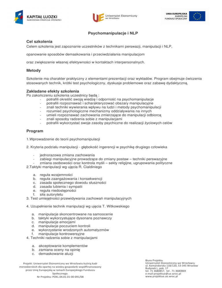 Psychomanipulacje i NLP Cel szkolenia Metody Zakładane efekty