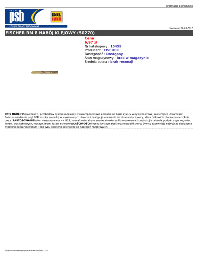 Informacje o produkcie Utworzono 02-03-2017 FISCHER RM 8 NABÓJ KLEJOWY (50270) Cena : 6,97 zł Nr katalogowy : 15455 Producent : FISCHER Dostępność : Dostępny Stan magazynowy : brak w magazynie Średnia ocena : brak recenzji OPIS OGÓLNYSprawdzony i przebadany system mocujący Dwukomponentowa ampułka na bazie żywicy winylowoestrowej zawierająca utwardzacz. Podczas osadzania pręt RGM rozbija ampułkę w wywierconym otworze i następuje mieszanie się składników żywicy, która całkowicie otacza powierzchnię pręta. ZASTOSOWANIEbeton niezarysowany =< B15, kamień naturalny o zwartej strukturze Do mocowania: konstrukcji stalowch, podpór, szyn, regałów, konsol, tras kablowych, maszyn, bram, fasad, schodówWŁAŚCIWOŚCIWysoka wytrzymałość oraz niewielki skurcz żywicy zapewniają najwyższe obciążenia w betonie niezarysowanym Tego typu kotwienie jest wolne od naprężeń rozporowych. Wygenerowano w programie www.oscGold.com
