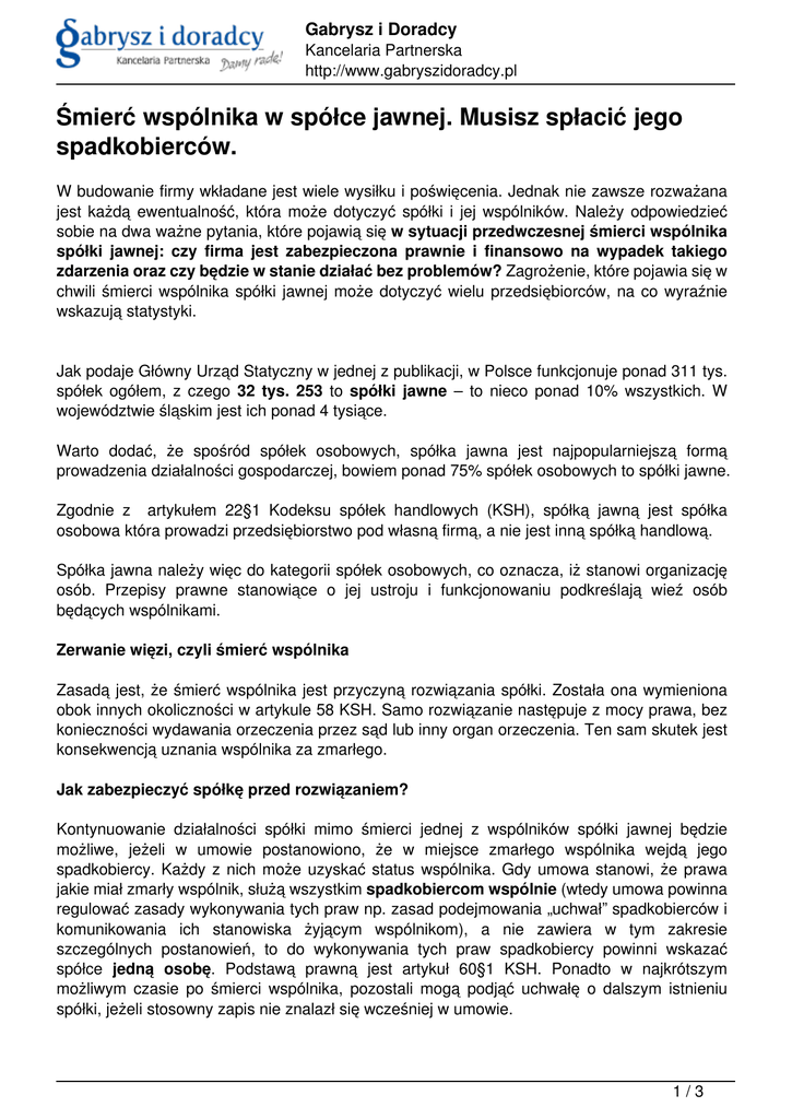 Gabrysz i Doradcy Kancelaria Partnerska http://www.gabryszidoradcy.pl Śmierć wspólnika w spółce jawnej. Musisz spłacić jego spadkobierców. W budowanie firmy wkładane jest wiele wysiłku i poświęcenia. Jednak nie zawsze rozważana jest każdą ewentualność, która może dotyczyć spółki i jej wspólników. Należy odpowiedzieć sobie na dwa ważne pytania, które pojawią się w sytuacji przedwczesnej śmierci wspólnika spółki jawnej: czy firma jest zabezpieczona prawnie i finansowo na wypadek takiego zdarzenia oraz czy będzie w stanie działać bez problemów? Zagrożenie, które pojawia się w chwili śmierci wspólnika spółki jawnej może dotyczyć wielu przedsiębiorców, na co wyraźnie wskazują statystyki. Jak podaje Główny Urząd Statyczny w jednej z publikacji, w Polsce funkcjonuje ponad 311 tys. spółek ogółem, z czego 32 tys. 253 to spółki jawne – to nieco ponad 10% wszystkich. W województwie śląskim jest ich ponad 4 tysiące. Warto dodać, że spośród spółek osobowych, spółka jawna jest najpopularniejszą formą prowadzenia działalności gospodarczej, bowiem ponad 75% spółek osobowych to spółki jawne. Zgodnie z artykułem 22§1 Kodeksu spółek handlowych (KSH), spółką jawną jest spółka osobowa która prowadzi przedsiębiorstwo pod własną firmą, a nie jest inną spółką handlową. Spółka jawna należy więc do kategorii spółek osobowych, co oznacza, iż stanowi organizację osób. Przepisy prawne stanowiące o jej ustroju i funkcjonowaniu podkreślają wieź osób będących wspólnikami. Zerwanie więzi, czyli śmierć wspólnika Zasadą jest, że śmierć wspólnika jest przyczyną rozwiązania spółki. Została ona wymieniona obok innych okoliczności w artykule 58 KSH. Samo rozwiązanie następuje z mocy prawa, bez konieczności wydawania orzeczenia przez sąd lub inny organ orzeczenia. Ten sam skutek jest konsekwencją uznania wspólnika za zmarłego. Jak zabezpieczyć spółkę przed rozwiązaniem? Kontynuowanie działalności spółki mimo śmierci jednej z wspólników spółki jawnej będzie możliwe, jeżeli w umowie postanowiono, że w miejsce zmarłego wspólnika wejdą jego spadkobiercy. Każdy z nich może uzyskać status wspólnika. Gdy umowa stanowi, że prawa jakie miał zmarły wspólnik, służą wszystkim spadkobiercom wspólnie (wtedy umowa powinna regulować zasady wykonywania tych praw np. zasad podejmowania „uchwał” spadkobierców i komunikowania ich stanowiska żyjącym wspólnikom), a nie zawiera w tym zakresie szczególnych postanowień, to do wykonywania tych praw spadkobiercy powinni wskazać spółce jedną osobę. Podstawą prawną jest artykuł 60§1 KSH. Ponadto w najkrótszym możliwym czasie po śmierci wspólnika, pozostali mogą podjąć uchwałę o dalszym istnieniu spółki, jeżeli stosowny zapis nie znalazł się wcześniej w umowie. 1/3 Gabrysz i Doradcy Kancelaria Partnerska http://www.gabryszidoradcy.pl Jak wyłączyć prawo potencjalnych spadkobierców do miejsca w spółce? W tym przypadku najlepszym rozwiązaniem jest klauzula w umowie spółki, która podtrzyma jej byt prawny i jednocześnie uniemożliwi wstąpienie spadkobierców w miejsce zmarłego wspólnika. Istotą takiego postanowienia jest oświadczenie o spłacie spadkobierców. Uzgodnienie takie, jeżeli nie zostało zastrzeżone w umowie powinno nastąpić niezwłocznie po śmierci wspólnika. W przeciwnym razie spadkobiercy mogą domagać się przeprowadzenia likwidacji spółki. Jak spłacić spadkobierców? Zastrzeżenie o tym, że spadkobiercy nie wstępują do spółki (lub brak rozstrzygnięcia w tym zakresie w ogóle) powoduje obowiązek rozliczenia się przez spółkę ze spadkobieracami. Spółka zobowiązania jest do wypłaty udziału kapitałowego zmarłego wspólnika, ustalonego na podstawie ostatniego bilansu uwzględniającego wartość zbywczą majątku spółki. Udział kapitałowy obliczony w ten sposób powinien być wypłacony w gotówce. Jeżeli udział zmarłego wspólnika wykazuje wartość ujemną, to spadkobiercy są zobowiązani wyrównać brakującą wartość. Aby bez problemów spłacić spadkobierców konieczne jest optymalne zabezpieczenie finansowe. Jednym z rozwiązań jest wykupienie polisy ubezpieczenia na życie. Spadkobiercy mogą żądać przekształcenia spółki Na mocy art. 583 §1 KSH spadkobiercy w przypadku śmierci wspólnika - ich spadkodawcy, mogą żądać przekształcenia spółki jawnej w komandytową lub komandytowo-akcyjną z przyznaniem im statusu komandytariuszy, a w drugim przypadku akcjonariuszy. Wspólnicy mogą sprzeciwić się podejmując uchwałę o rozwiązaniu spółki. Dwuosobowa spółka jawna a śmierć wspólnika W doktrynie prawa istnieje rozbieżny pogląd co do oceny skutków śmierci jednego z dwóch wspólników spółki jawnej. Według jednego poglądu spółka istnieje jedynie wówczas, gdy umowa to przewiduje lub wspólnicy tak postanowili oraz żyje co najmniej dwóch wspólników (oznacza to, że wcześniej musiało być ich więcej niż dwóch). Odmienny pogląd zakłada, iż zamieszczona klauzula w umowie o trwaniu spółki na wypadek śmierci wspólnika zapobiega automatycznemu rozwiązaniu spółki, ponieważ spółka istnieje nadal ze spadkobiercami, którzy weszli w miejsce wspólnika. Uprawnienie to reguluje artykuł 60§1 KSH. To drugie stanowisko przyjął Sąd Apelacyjny w wyroku z dnia 26 października 2006 r. VI ACa 394/06. Podsumowanie Każdy wspólnik spółki jawnej powinien mieć świadomość różnych zagrożeń, w szczególności swojej przedwczesnej śmierci lub śmierci wspólnika. Niewątpliwie priorytetowe w tej kwestii może okazać się stosowne postanowienie w umowie spółki. Ważna jest jednak odpowiedź na 2/3 Gabrysz i Doradcy Kancelaria Partnerska http://www.gabryszidoradcy.pl podstawowe pytanie: ile potrzebuje spółka kapitału na spłatę rodziny - spadkobierców w przypadku, kiedy nie mogą lub nie