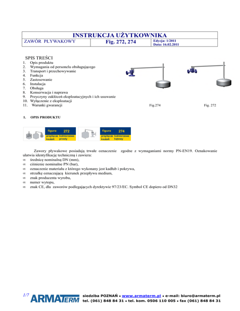 INSTRUKCJA UŻYTKOWNIKA ZAWÓR PŁYWAKOWY Fig. 272, 274 Edycja: 1/2011 Data: 16.02.2011 SPIS TREŚCI 1. 2. 3. 4. 5. 6. 7. 8. 9. 10. 11. Opis produktu Wymagania od personelu obsługującego Transport i przechowywanie Funkcja Zastosowanie Instalacja Obsługa Konserwacja i naprawa Przyczyny zakłóceń eksploatacyjnych i ich usuwanie Wyłączenie z eksploatacji Warunki gwarancji 1. OPIS PRODUKTU figura 272 przyłącze kołnierzowe prosty kształt figura Fig.274 Fig. 272 274 przyłącze kołnierzowe kątowy kształt Zawory pływakowe posiadają trwałe oznaczenie zgodne z wymaganiami normy PN-EN19. Oznakowanie ułatwia identyfikację techniczną i zawiera: • średnicę nominalną DN (mm), • ciśnienie nominalne PN (bar), • oznaczenie materiału z którego wykonany jest kadłub i pokrywa, • strzałkę oznaczającą kierunek przepływu medium, • znak producenta wyrobu, • numer wytopu, • znak CE, dla zaworów podlegających dyrektywie 97/23/EC. Symbol CE dopiero od DN32 1/7 siedziba POZNAŃ • www.armaterm.pl • e-mail: [email protected] tel. (061) 848 84 31 • tel. kom. 0506 110 005 • fax (061) 848 84 31 2. WYMAGANIA OD PERSONELU OBSŁUGUJĄCEGO Personel skierowany do prac montażowych, konserwacyjnych i eksploatacyjnych powinien posiadać kwalifikacje do wykonywania tych prac. Jeżeli podczas pracy zaworów gorące części zaworu, np. kadłub lub pokrywa mogą spowodować oparzenie, to użytkownik jest zobowiązany do zabezpieczenia ich przed dotknięciem. 3.TRANSPORT I PRZECHOWYWANIE Transport i przechowywanie powinien odbywać się w temperaturze –200 do 650C, a zawory należy zabezpieczyć przed działaniem sił zewnętrznych i zniszczeniem powłoki malarskiej. Powłoka malarska ma na celu ochronę zaworów przed korozją podczas transportu i składowania. Zawory należy przechowywać w pomieszczeniach wolnych od zanieczyszczeń i zabezpieczonych przed wpływami atmosferycznymi. W pomieszczeniach wilgotnych należy stosować środek wysuszający lub ogrzewanie aby zapobiec tworzeniu się skroplin. Zawory należy transportować w taki sposób by nie uszkodzić trzpienia zaworu. Zawory pływakowe transportowane są w częściach:kompletny zawór, dźwignia ,pręt pływaka oraz pływak. Niedopuszczalne jest mocowanie urządzeń dźwigowych za otwory przyłączeniowe . 2/7 siedziba POZNAŃ • www.armaterm.pl • e-mail: [email protected] tel. (061) 848 84 31 • tel. kom. 0506 110 005 • fax (061) 848 84 31 4. FUNKCJA Zawory pływakowe służą do regulacji poziomu czynnika w zbiorniku przy jego napełnianiu lub opróżnianiu. Po osiągnięciu założonego poziomu cieczy w zbiorniku zawór zamyka się i pozostaje w takim stanie do czasu gdy poziom cieczy opadnie. Zakres zastosowania podano w karcie katalogowej. Czynnik roboczy powoduje nakaz lub zakaz stosowania określonych materiałów. Zawory zaprojektowano dla normalnych warunków użytkowania. W przypadku warunków pracy przekraczających te wymagania, jak np. w przypadku czynników agresywnych czy ściernych użytkownik powinien zwrócić się przed złożeniem zamówienia z zapytaniem do producenta. Przy doborze armatury do konkretnego czynnika pomocny może być „Wykaz odporności chemicznej” zamieszczony na stronie internetowej producenta obok kart katalogowych. Ciśnienie robocze należy dostosować do maksymalnej temperatury czynnika, zgodnie z poniższą tabelą. Zawór pływakowy Fig. 272,274 Wg EN 1092-2 Temperatura [º C] Materiał PN -10 do 120 EN-GJL250 10 10 bar Za prawidłowy dobór armatury do warunków pracy odpowiedzialność ponosi projektant instalacji. 5. ZASTOSOWANIE - instalacje wody zimnej i gorącej - sieci p.poż. , technologie przemysłowe, energetyka, ciepłownictwo, 6. INSTALACJA Przy montażu zaworów pływakowych należy przestrzegać następujących zasad: - ocenić przed montażem czy armatura nie została uszkodzona w czasie transportu lub przechowywania, oraz upewnić się, że zastosowane zawory są właściwe dla eksploatacyjnych parametrów i mediów w danej instalacji, - zdjąć zaślepki jeżeli zawory pływakowe są w nie wyposażone, zaślepka 3/7 siedziba POZNAŃ • www.armaterm.pl • e-mail: [email protected] tel. (061) 848 84 31 • tel. kom. 0506 110 005 • fax (061) 848 84 31 - sprawdzić , czy wnętrze armatury jest wolne od ciał obcych, zabezpieczyć armaturę przy pracach np. spawalniczych , Zamontowanie osadnika – filtra siatkowego przed zaworem zwiększa pewność jego poprawnego funkcjonowania. Połączenia śrubowe na rurociągu nie mogą wprowadzać dodatkowych naprężeń wytrzymałościowych wynikających z nadmiernego ich dokręcenia, a rodzaj materiałów części złącznych musi być dostosowany do parametrów roboczych instalacji. Instalować zawór tak , aby kierunek przepływu czynnika był zgodny ze strzałką umieszczoną kadłubie i pamiętać, że dla tych zaworów napływ cieczy ma następować na grzyb. - - 4/7 na po przykręceniu zaworu do rurociągu zamontować dźwignię i pływak zaworu, podczas malowania rurociągu należy chronić trzpień zaworu , dźwignię, sworznie oraz pływak , zawory powinny być montowane w takim położeniu, aby oś trzpienia i pływaka były pionowo zawór pływakowy powinien być umieszczony powyżej lustra cieczy , tak aby lustro cieczy mogło oddziaływać na pływak, dla zaworów w zakresie DN 25-80 dopasowanie odległości pływaka do poziomu cieczy odbywa się poprzez poluzowanie dwóch śrub (2) w główce dźwigni (3) i przemieszczeniu pręta(4) wraz z pływakiem (5)do założonego poziomu, a następnie dokręceniu śrub (2) - jak na poniższym rysunku, dla zaworów w zakresie DN 100-200 dopasowanie odległości pływaka do poziomu cieczy odbywa się poprzez wstawienie dodatkowej rurki (6) i odpowiedniej złączki (7) (G11/2” dla DN 100-125, G3/4” dla DN 150-200)pomiędzy pływak (8) a uchwyt pływaka (9)- jak na poniższym rysunku; producent zaworu nie dostarcza rurki i złączki- są one og