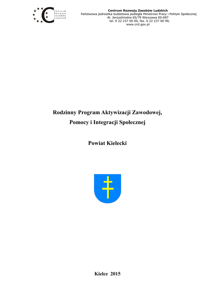 Centrum Rozwoju Zasobów Ludzkich Państwowa jednostka budżetowa podległa Ministrowi Pracy i Polityki Społecznej Al. Jerozolimskie 65/79 Warszawa 00-697 tel. 0 22 237 00 00, fax. 0 22 237 00 99, www.crzl.gov.pl Rodzinny Program Aktywizacji Zawodowej, Pomocy i Integracji Społecznej Powiat Kielecki Kielce 2015 Centrum Rozwoju Zasobów Ludzkich Państwowa jednostka budżetowa podległa Ministrowi Pracy i Polityki Społecznej Al. Jerozolimskie 65/79 Warszawa 00-697 tel. 0 22 237 00 00, fax. 0 22 237 00 99, www.crzl.gov.pl SPIS TREŚCI 1. Wprowadzenie. 1.1. Opis sposobu wypracowania rodzinnego programu aktywizacji zawodowej, pomocy i integracji społecznej 1.2. Określenie roli Mobilnej Grupy Interdyscyplinarnej (MGI), Powiatowego Zespołu Koordynującego Współpracę (PZKW) i rodziny w opracowaniu i wdrażaniu rodzinnego programu. 1.3. Przesłanki wyboru instytucji tworzących MGI. 1.4. Związki pomiędzy MGI i PZKW. 2. Diagnoza stanu zastanego. 2.1. Sytuacja rodzin wielodzietnych w ujęciu statystycznym i problemowym na terenie Gminy Bieliny oraz Gminy Masłów. 2.2. Formy wsparcia skierowanego do rodzin wielodzietnych zagrożonych wykluczeniem społecznym świadczonego przez IPIR: 2.3. Diagnoza poziomu współpracy pomiędzy instytucjami pomocy i integracji społecznej (IPiIS) i instytucjami rynku pracy (IRP) wobec rodzin wielodzietnych zagrożonych wykluczeniem społecznym. 2.4. Identyfikacja barier utrudniających usamodzielnienie członków rodzin wielodzietnych zagrożonych wykluczeniem społecznym. 3. Katalog usług skierowanych do rodzin wielodzietnych. 4. Cele, rezultaty, działania i wskaźniki rodzinnego programu aktywizacji. 4.1. Harmonogram realizacji rodzinnego programu. 4.2. Trwałość rezultatów rodzinnego programu. 5. Zarządzanie oraz nadzór merytoryczny i administracyjny nad realizacją rodzinnego programu. 5. 1. Zarządzanie ryzykiem podczas wdrażania rodzinnego programu. 6. Promocja rodzinnego programu. 7. Źródła finansowania rodzinnego programu. 8. Monitoring i ewaluacja rodzinnego programu. 9. Załączniki (9 kontraktów rodzinnych – zmiany, 10 ocen z realizacji kontraktów rodzinnych). 2 Centrum Rozwoju Zasobów Ludzkich Państwowa jednostka budżetowa podległa Ministrowi Pracy i Polityki Społecznej Al. Jerozolimskie 65/79 Warszawa 00-697 tel. 0 22 237 00 00, fax. 0 22 237 00 99, www.crzl.gov.pl 1. Wprowadzenie Rodzinny program aktywizacji zawodowej, pomocy i integracji społecznej opracowany został na potrzeby pilotażowej części projektu „Schematom Stop! Wspólne działania instytucji pomocy społecznej i instytucji rynku pracy – pilotaż”. Założeniem rodzinnego programu aktywizacji było stworzenie skoordynowanego systemu współpracy instytucjonalnej skoncentrowanego na wypracowaniu oraz przetestowaniu nowych metod pomocy rodzinom wieloproblemowym pozostającym pod opieką pomocy społecznej. W przygotowaniu i realizacji rodzinnego programu aktywizacji, istotne było przeformułowanie istniejącego sposobu pracy z rodzinami. Odejście od tradycyjnego modelu opartego na deficytach, gdzie głównym celem specjalistów na początku jest diagnoza obejmująca głównie problemy rodziny, określająca to, co nie funkcjonuje w rodzinie w sposób prawidłowy. Zastosowanie natomiast sposobu pracy, opartego na diagnozie pokazującej zasoby rodziny, poszczególnych jej osób, a także rodziny dalszej oraz społeczności lokalnej. Takie postępowanie prowadzone było na każdym poziomie podejmowanych działań zmierzających do usamodzielnienia rodziny. Prace z rodziną, prowadzone były w oparciu o koncepcję empowerment, wykorzystywaną na każdym etapie tworzenia programu w dwóch podstawowych wymiarach. Pierwszy wymiar polegał na włączaniu rodzin w procesy decyzyjne na każdym etapie konstruowania rodzinnego programu i jego realizacji, drugi natomiast na konstruowaniu programu i planu pomocy tak, by każdy moment pracy z rodziną był okazją do praktykowania samodzielnego podejmowania przez nią decyzji, brania odpowiedzialności za te decyzje i w efekcie osiągania wyższego poziomu samodzielności. Zaproponowane w rodzinnym programie aktywizacji działania oparte zostały na nowatorskich rozwiązaniach ekspertów zawartych w modelach pracy z rodzinami wielodzietnymi zagrożonymi wykluczeniem społecznym z tytułu bezrobocia (w tym długotrwałego) i ubóstwa, przygotowanych na potrzeby realizacji pilotażu oraz wypracowane przez dwa zespoły Powiatowy Zespół Koordynujący Współpracę (PZKW) i Mobilną Grupę Interdyscyplinarną (MGI) rozwiązania. PZKW i MGI składały się przede wszystkim z przedstawicieli instytucji pomocy i integracji społecznej oraz instytucji rynku pracy. Zespół MGI zaangażowany we wdrażanie nowych metod pracy poprzez bezpośrednią pomoc rodzinom uczestniczącym w pilotażu oraz działanie PZKW czuwającego nad wykorzystaniem istniejących zasobów, realizacją i zasadnością podejmowanych rozwiązań wywierał zasadniczy wpływ na ostateczny kształt rodzinnego programu aktywizacji, a w efekcie wypracowanie systemu współpracy w zakresie pomocy rodzinom wieloproblemowym. 3 Centrum Rozwoju Zasobów Ludzkich Państwowa jednostka budżetowa podległa Ministrowi Pracy i Polityki Społecznej Al. Jerozolimskie 65/79 Warszawa 00-697 tel. 0 22 237 00 00, fax. 0 22 237 00 99, www.crzl.gov.pl 1.1 Opis sposobu wypracowania rodzinnego programu aktywizacji zawodowej, pomocy i integracji społecznej Rodzinny program aktywizacji zawodowej, pomocy i integracji społecznej, jako ogólny, wzorcowy model pracy z rodzinami wielodzietnymi zagrożonymi wykluczeniem społecznym z tytułu bezrobocia (w tym długotrwałego) i ubóstwa, stanowił narzędzie zawierające w swej treści współpracę instytucji działających w obszarze pomocy rodzinie jak i zaangażowanie samej rodziny w procesy służące jej usamodzielnieniu. Określał etapy pracy zespołów, włączania rodziny w procesy decyzyjne oraz strukturę realizacji po