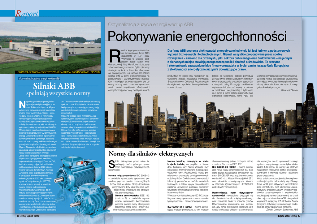 Raport Optymalizacja zużycia en ergii według ABB Pokonywanie energochłonności R fabryka silników elektrycznych ABB w aleksandrowie Łódzkim Optymalizacja zużycia energii według ABB Silniki ABB spełniają wszystkie normy 16 Dzisiaj Lipiec 2009 Dla firmy ABB poprawa efektywności energetycznej od wielu lat jest jednym z podstawowych wyzwań biznesowych i technologicznych. Niemal wszystkie proponowane przez spółkę rozwiązania – zarówno dla przemysłu, jak i sektora publicznego oraz budownictwa – na jednym z pierwszych miejsc stawiają energooszczędność i dbałość o środowisko. Te szczytne i ekonomicznie uzasadnione idee firma wprowadziła w życie, zanim jeszcze Unia Europejska z efektywności energetycznej uczyniła obowiązujące prawo. produktów. W ciągu kilku następnych lat wykonana została niezależna weryfikacja Środowiskowych Deklaracji Produktowych dla większości wyrobów dla wszystkich ob‑ szarów biznesu. Dzisiaj te wieloletnie zabiegi powodują, że ABB słynie przede wszystkim z efektyw‑ nych energetycznie produktów, systemów, rozwiązań i usług. Pomagają one klientom wytwarzać i dostarczać więcej produktów w przeliczeniu na jednostkę zużytej ener‑ gii. I mimo iż różne gałęzie przemysłu mają odmienne oczekiwania, firma ABB jest w stanie przygotować i przystosować swo‑ ją ofertę niemal dla każdego użytkownika, od miejsca wytworzenia energii w elektrow‑ ni czy elektrociepłowni do symbolicznego gniazdka elektrycznego. Sławomir Dolecki zharmonizowaną (mimo drobnych różnic) z metodą B z normy IEEE 112. IEC 60034‑30 (2008) – norma definiu‑ jąca nowe klasy sprawności (IE1-IE2-IE3), które bazują na aktualnie istniejących kla‑ sach EU-CEMEP oraz są zharmonizowa‑ ne dla 60 Hz z klasami brazylijskimi (IE1) oraz aktualnie obowiązującymi klasami w Stanach Zjednoczonych (EPACT/IE2 and NEMA Premium/IE3). nia wymogów co do sprawności całego systemu napędowego, a nie tylko silnika. Widać tutaj jasno, że normy są istotnym narzędziem kreowania polityki energoosz‑ czędności i dotyczą różnych aspektów pracy urządzenia. Wraz z dalszym rozwojem technologii nor‑ malizacja będzie pełnić dużą rolę. Dlatego firma ABB jest aktywnym uczestnikiem prac komitetu IEC TC2, jak również uczest‑ niczyła w pracach SEEEM (inicjatywy śro‑ dowisk przemysłowych i akademickich wspierającej harmonizacje norm). W chwili obecnej przedstawiciele ABB biorą udział w pracach inicjatywy IEA 4E Motor Annex (program dotyczący systemowego podej‑ ścia do spraw sprawności silników). Źródło: Centrum Badawcze ABB 2017 roku wszystkie silniki elektryczne muszą spełniać normę IE3, chyba że zainstalowane będą z napędem pozwalającym na regulację prędkości obrotowej, wówczas obowiązuje je norma IE2. Mając na uwadze nowe wymagania, ABB systematycznie poprawia jakość i parametry efektywnościowe wytwarzanych silników elektrycznych. Urządzenia produkowane w nowej fabryce w Aleksandrowie Łódzkim, które w tym roku trafią na rynek, spełniają najbardziej rygorystyczne – obowiązujące dziś – normy unijne. Dzięki temu, na rynku europejskim nie mają sobie równych. Patrząc na dotychczasowe działania oraz strategiczne założenia firmy na najbliższe lata, w przyszłości również się to nie zmieni. Normy dla silników elektrycznych S ilniki elektryczne przez wiele lat podlegały dwóm głównym syste‑ mom normalizacji, dotyczącym ich sprawności: Norma międzynarodowa IEC 60034‑2 – zakładała wyznaczanie sprawności po‑ średnio, poprzez pomiar poszczególnych typów strat w silniku. Straty dodatkowe przyjmowane były jako 0,5 proc. war‑ tości mocy wejściowej dla obciąże‑ nia znamionowego. Norma amerykańska IEEE 112 (metoda B) – zakładała wyzna‑ czanie sprawności bezpośrednio poprzez pomiar mocy elektrycznej pobieranej przez silnik i mocy me‑ chanicznej wydawanej przez silnik. Normy lokalne, istniejące w wielu krajach świata, na przykład w Kana‑ dzie, Meksyku czy Nowej Zelandii, były najczęściej zharmonizowane z jedną z po‑ wyższych norm. Rozbieżność metod po‑ miarowych prowadziła do nieporównywal‑ ności wyników. Dodatkowo różne wartości tolerancji pomiarów w dwóch metodach testowych, a także wpływ częstotliwości zasilania używanych podczas pomiarów utrudniały ewentualną konwersję lub prze‑ liczenie wyników. Wreszcie komitet techniczny IEC TC 2 rota‑ ting machinery opracował nowe normy do‑ tyczące pomiaru i oznaczania sprawności: IEC 60034‑2-1 (2007) – norma zawie‑ rająca metody pomiarowe, w tym metodę Harmonizacja norm dotyczących sprawności niewątpliwie przyczyni się do ułatwienia handlu międzynarodowego oraz zniesienia barier w rozwoju rynków. Równocześnie zauważalna jest tenden‑ cja, aby silniki elektryczne traktować jako części większego układu – a więc stawia‑ Lipiec 2009 Dzisiaj 17 Fot. na kolumnach: Andrzej Gabler/Arch. ABB; Someformofhuman/Wikimedia Commons N ajwiększym odbiorcą energii elektrycznej w skali globalnej jest przemysł. Pobiera i zużywa ok. 42 proc. wytworzonej na świecie energii. Niemal trzy czwarte z niej wykorzystują napędy i silniki. Nie dziwi więc, że właśnie w tym miejscu najmocniej poszukuje się oszczędności. Komisja Europejska silnikom elektrycznym poświęciła nawet osobny, wielostronicowy akt wykonawczy, dotyczący dyrektywy 2005/32/ WE regulującej zasady ustalania wymogów ekoprojektu dla produktów wykorzystujących energię. Dokument w jednym z pierwszych punktów podkreśla, iż potencjał opłacalnej ekonomicznie poprawy efektywności energetycznej tych urządzeń może osiągnąć nawet 30 proc. Dlatego też silniki elektryczne stanowią jeden z głównych produktów, dla których należy ustalić szczegółowe wymogi. Dzisiaj silniki elektryczne pracujące na terenie Wspólnoty zużywają ponad 1000 TWh, co przekłada się na