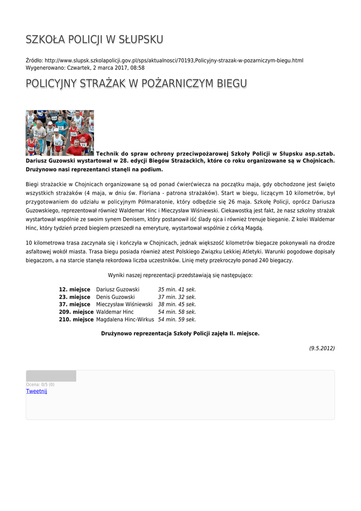 SZKOŁA POLICJI W SŁUPSKU Źródło: http://www.slupsk.szkolapolicji.gov.pl/sps/aktualnosci/70193,Policyjny-strazak-w-pozarniczym-biegu.html Wygenerowano: Czwartek, 2 marca 2017, 08:58 POLICYJNY STRAŻAK W POŻARNICZYM BIEGU Technik do spraw ochrony przeciwpożarowej Szkoły Policji w Słupsku asp.sztab. Dariusz Guzowski wystartował w 28. edycji Biegów Strażackich, które co roku organizowane są w Chojnicach. Drużynowo nasi reprezentanci stanęli na podium. Biegi strażackie w Chojnicach organizowane są od ponad ćwierćwiecza na początku maja, gdy obchodzone jest święto wszystkich strażaków (4 maja, w dniu św. Floriana - patrona strażaków). Start w biegu, liczącym 10 kilometrów, był przygotowaniem do udziału w policyjnym Półmaratonie, który odbędzie się 26 maja. Szkołę Policji, oprócz Dariusza Guzowskiego, reprezentował również Waldemar Hinc i Mieczysław Wiśniewski. Ciekawostką jest fakt, że nasz szkolny strażak wystartował wspólnie ze swoim synem Denisem, który postanowił iść ślady ojca i również trenuje bieganie. Z kolei Waldemar Hinc, który tydzień przed biegiem przeszedł na emeryturę, wystartował wspólnie z córką Magdą. 10 kilometrowa trasa zaczynała się i kończyła w Chojnicach, jednak większość kilometrów biegacze pokonywali na drodze asfaltowej wokół miasta. Trasa biegu posiada również atest Polskiego Związku Lekkiej Atletyki. Warunki pogodowe dopisały biegaczom, a na starcie stanęła rekordowa liczba uczestników. Linię mety przekroczyło ponad 240 biegaczy. Wyniki naszej reprezentacji przedstawiają się następująco: 12. miejsce 23. miejsce 37. miejsce 209. miejsce 210. miejsce Dariusz Guzowski Denis Guzowski Mieczysław Wiśniewski Waldemar Hinc Magdalena Hinc-Wirkus 35 min. 41 sek. 37 min. 32 sek. 38 min. 45 sek. 54 min. 58 sek. 54 min. 59 sek. Drużynowo reprezentacja Szkoły Policji zajęła II. miejsce. (9.5.2012) Ocena: 0/5 (0) Tweetnij
