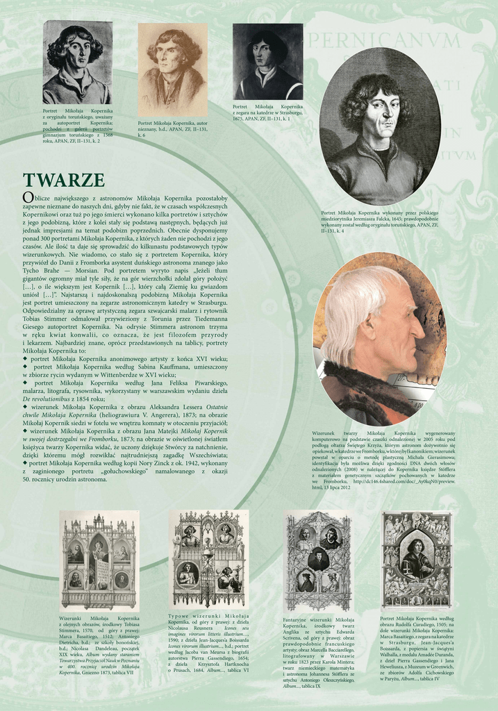 Portret Mikołaja Kopernika z oryginału toruńskiego, uważany za autoportret Kopernika; pochodzi z galerii portretów gimnazjum toruńskiego z 1568 roku, APAN, ZF, II–131, k. 2 Portret Mikołaja Kopernika, autor nieznany, b.d., APAN, ZF, II–131, k. 6 Portret Mikołaja Kopernika z zegara na katedrze w Strasburgu, 1675, APAN, ZF, II–131, k. 1 TWARZE blicze największego z astronomów Mikołaja Kopernika pozostałoby zapewne nieznane do naszych dni, gdyby nie fakt, że w czasach współczesnych Kopernikowi oraz tuż po jego śmierci wykonano kilka portretów i sztychów z jego podobizną, które z kolei stały się podstawą następnych, będących już jednak impresjami na temat podobizn poprzednich. Obecnie dysponujemy ponad 300 portretami Mikołaja Kopernika, z których żaden nie pochodzi z jego czasów. Ale ilość ta daje się sprowadzić do kilkunastu podstawowych typów wizerunkowych. Nie wiadomo, co stało się z portretem Kopernika, który przywiózł do Danii z Fromborka asystent duńskiego astronoma znanego jako Tycho Brahe — Morsian. Pod portretem wyryto napis „Jeżeli tłum gigantów ogromny miał tyle siły, że na gór wierzchołki zdołał góry położyć […], o ile większym jest Kopernik […], który całą Ziemię ku gwiazdom uniósł […]”. Najstarszą i najdoskonalszą podobizną Mikołaja Kopernika jest portret umieszczony na zegarze astronomicznym katedry w Strasburgu. Odpowiedzialny za oprawę artystyczną zegara szwajcarski malarz i rytownik Tobias Stimmer odmalował przywieziony z Torunia przez Tiedemanna Giesego autoportret Kopernika. Na odrysie Stimmera astronom trzyma w ręku kwiat konwalii, co oznacza, że jest filozofem przyrody i lekarzem. Najbardziej znane, oprócz przedstawionych na tablicy, portrety Mikołaja Kopernika to: ◆ portret Mikołaja Kopernika anonimowego artysty z końca XVI wieku; ◆ portret Mikołaja Kopernika według Sabina Kauffmana, umieszczony w zbiorze rycin wydanym w Wittenberdze w XVI wieku; ◆ portret Mikołaja Kopernika według Jana Feliksa Piwarskiego, malarza, litografa, rysownika, wykorzystany w warszawskim wydaniu dzieła De revolutionibus z 1854 roku; ◆ wizerunek Mikołaja Kopernika z obrazu Aleksandra Lessera Ostatnie chwile Mikołaja Kopernika (heliograwiura V. Angerera), 1873; na obrazie Mikołaj Kopernik siedzi w fotelu we wnętrzu komnaty w otoczeniu przyjaciół; ◆ wizerunek Mikołaja Kopernika z obrazu Jana Matejki Mikołaj Kopernik w swojej dostrzegalni we Fromborku, 1873; na obrazie w oświetlonej światłem księżyca twarzy Kopernika widać, że uczony dziękuje Stwórcy za natchnienie, dzięki któremu mógł rozwikłać najtrudniejszą zagadkę Wszechświata; ◆ portret Mikołaja Kopernika według kopii Nory Zinck z ok. 1942, wykonany z zaginionego portretu „gołuchowskiego” namalowanego z okazji 50. rocznicy urodzin astronoma. Wizerunki Mikołaja Kopernika z olejnych obrazów, środkowy Tobiasa Stimmera, 1570, od góry z prawej: Marca Basaitiego, 1512; Antoniego Dietricha, b.d.; ze szkoły bonońskiej, b.d.; Nicolasa Dandeleau, początek XIX wieku, Album wydany staraniem Towarzystwa Przyjaciół Nauk w Poznaniu w 400. rocznicę urodzin Mikołaja Kopernika, Gniezno 1873, tablica VII Ty p o w e w i z e r u n k i M i k o ł a j a Kopernika, od góry z prawej: z dzieła Nicolausa Reusnera Icones seu imagines virorum litteris illustrium…, 1590; z dzieła Jean-Jacques’a Boissarda Icones virorum illustrium..., b.d.; portret według Jacoba van Meursa z biografii autorstwa Pierra Gassendiego, 1654; z dzieła Krzysztofa Hartknocha o Prusach, 1684, Album..., tablica VI Portret Mikołaja Kopernika wykonany przez polskiego miedziorytnika Jeremiasza Falcka, 1645; prawdopodobnie wykonany został według oryginału toruńskiego, APAN, ZF, II–131, k. 4 Wizerunek twarzy Mikołaja Kopernika wygenerowany komputerowo na podstawie czaszki odnalezionej w 2005 roku pod podłogą ołtarza Świętego Krzyża, którym astronom dożywotnio się opiekował, w katedrze we Fromborku, w której był kanonikiem; wizerunek powstał w oparciu o metodę plastyczną Michała Gierasimowa; identyfikacja była możliwa dzięki zgodności DNA dwóch włosów odnalezionych (2008) w należącej do Kopernika księdze Stöfflera z materiałem genetycznym szczątków pochowanych w katedrze we Fromborku, http://dc146.4shared.com/doc/_Ay0kqN0/preview. html, 13 lipca 2012 Fantazyjne wizerunki Mikołaja Kopernika, środkowy twarz Anglika ze sztychu Edwarda Scrivena, od góry z prawej: obraz prawdopodobnie francuskiego artysty; obraz Marcella Bacciarellego, litografowany w Warszawie w roku 1823 przez Karola Mintera; twarz niemieckiego matematyka i astronoma Johannesa Stöfflera ze sztychu Antoniego Oleszczyńskiego, Album..., tablica IX Portret Mikołaja Kopernika według obrazu Rudolfa Curadiego, 1505; na dole wizerunki Mikołaja Kopernika: Marca Basaitiego, z zegara na katedrze w Strasburgu, Jean-Jacques’a Boissarda, z popiersia w świątyni Walhalla, z medalu Amadée Duranda, z dzieł Pierra Gassendiego i Jana Heweliusza, z Muzeum w Greenwich, ze zbiorów Adolfa Cichowskiego w Paryżu, Album..., tablica IV