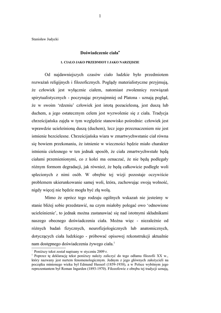 1 Stanisław Judycki Doświadczenie ciała∗ 1. CIAŁO JAKO PRZEDMIOT I JAKO NARZĘDZIE Od najdawniejszych czasów ciało ludzkie było przedmiotem rozważań religijnych i filozoficznych. Poglądy materialistyczne przyjmują, że człowiek jest wyłącznie ciałem, natomiast zwolennicy rozwiązań spirytualistycznych - poczynając przynajmniej od Platona - uznają pogląd, że w swoim ‘rdzeniu’ człowiek jest istotą pozacielesną, jest duszą lub duchem, a jego ostatecznym celem jest wyzwolenie się z ciała. Tradycja chrześcijańska zajęła w tym względzie stanowisko pośrednie: człowiek jest wprawdzie ucieleśnioną duszą (duchem), lecz jego przeznaczeniem nie jest istnienie bezcielesne. Chrześcijańska wiara w zmartwychwstanie ciał równa się bowiem przekonaniu, że istnienie w wieczności będzie miało charakter istnienia cielesnego w ten jednak sposób, że ciała zmartwychwstałe będą ciałami przemienionymi, co z kolei ma oznaczać, że nie będą podlegały różnym formom degradacji, jak również, że będą całkowicie podległe woli splecionych z nimi osób. W obrębie tej wizji pozostaje oczywiście problemem ukierunkowanie samej woli, która, zachowując swoją wolność, nigdy więcej nie będzie mogła być złą wolą. Mimo że oprócz tego rodzaju ogólnych wskazań nie jesteśmy w stanie bliżej sobie przedstawić, na czym miałoby polegać owo ‘odnowione ucieleśnienie’, to jednak można zastanawiać się nad istotnymi składnikami naszego obecnego doświadczenia ciała. Można więc - niezależnie od różnych badań fizycznych, neurofizjologicznych lub anatomicznych, dotyczących ciała ludzkiego - próbować opisowej rekonstrukcji aktualnie nam dostępnego doświadczenia żywego ciała.1 Poniższy tekst został napisany w styczniu 2009 r. Poprzez tę deklarację tekst poniższy należy zaliczyć do tego odłamu filozofii XX w., który nazwany jest nurtem fenomenologicznym. Jednym z jego głównych założycieli na początku minionego wieku był Edmund Husserl (1859-1938), a w Polsce wybitnym jego reprezentantem był Roman Ingarden (1893-1970). Filozofowie z obrębu tej tradycji uznają, 1 2 Ludzkie żywe ciało może być doświadczane na dwa podstawowe sposoby. W wielu sytuacjach życia codziennego nasze ciało pojawia się nam jako jedna z wielu rzeczy w świecie, jako materialny przedmiot pośród innych przedmiotów, jako przedmiot, który posiada określoną wagę, wielkość, który może być przemieszczany lub popychany. Gdy więc patrzymy na nie całkiem obiektywnie, to n a s z e ciało zwyczajną tego rzeczą fizyczną. Doświadczenia jest rodzaju obiektywności żywego ciała ludzkiego narzucają się szczególnie wyraźnie na przykład w zatłoczonym autobusie, ale też w szpitalu, gdy nasze ciało staje się przedmiotem manipulacji chirurgicznych. Czym innym jest natomiast subiektywne doświadczenie ciała. ‘Subiektywność’ tego doświadczenia należy rozumieć jako jego związanie z jedynym, pierwszo-osobowym punktem widzenia. Ciało subiektywne jest przede wszystkim doświadczane jako narzędzie, którym władamy, gdy dokonujemy różnych działań: za pomocą ciała jako narzędzia mówimy, pracujemy, bawimy się, uprawiamy różne sporty itd. Wtedy nie jest ono ‘czystym’ przedmiotem fizycznym, lecz przenikniętym świadomością instrumentem, którym posługujemy się w różnych celach. We wszystkich tego rodzaju sytuacjach n a s z e ż y w e c i a ł o j e s t ‘ b l i s k o n a s s a m y c h ’, a nawet, jak często odnosimy wrażenie, jest po prostu tożsame z nami. Z drugiej jednak strony, nawet w odniesieniu do ciała jako narzędzia i naszej prawie całkowitej z nim identyfikacji, ciągle uświadamiamy sobie, że to my, my jako świadome ośrodki woli, posługujemy się tym narzędziem, a więc uświadamiamy sobie, że nie jesteśmy naszym ciałem. Doświadczenie ciała jako czegoś subiektywnego oraz doświadczenie ciała jako czysto fizycznego przedmiotu przeplatają się ze sobą. Gdy sięgam po stojącą na biurku filiżankę z kawą, to moja ręka jest niejako przedłużeniem mojej chęci napicia się kawy, jest przedłużeniem mojego że analiza danych bezpośredniego doświadczenia może dostarczać wyników poznawczo doniosłych, a zatem, że nie wszystkie istotne zjawiska, należące do różnych dziedzin, są wyczerpująco opisywane i wyjaśniane wyłącznie przez nauki przyrodnicze. 3 świadomego aktu woli. Gdy jednak w tym samym momencie zauważę na niej, przyjmijmy, jakąś opuchliznę, to ten sam przedmiot zaczynam traktować jako czysto fizyczny obiekt, wymagający dokładniejszej obserwacji. Ciało subiektywne, a więc ciało jako narzędzie, jest jednak również czymś obiektywnym dla pozostałych obserwatorów poza nami samymi. Inni mogą potraktować nasze ciało czysto przedmiotowo, ale jednocześnie wiedzą dobrze, że używamy go jako narzędzia, że doświadczamy go od wewnątrz w pewien szczególny sposób i to ujęcie naszego ciała wpisują w swoje doświadczenie. Ciało subiektywne nie jest wyłączenie narzędziem, za pomocą którego ‘nawigujemy’ w przestrzeni świata i na różne sposoby działamy manipulując przedmiotami, lecz j e s t wyrazu i ono także narzędziem k o m u n i k a c j i . Ciała jako narzędzia używamy do komunikacji językowej, ale posługujemy się nim też jako środkiem komunikacji pozajęzykowej: miny, gesty, postawy cielesne wyrażają nas samych, to znaczy nasze myśli i stany emocjonalne. Poprzez żywe ciało wyraża się świadoma siebie i swojego ciała osoba. Odrębną sferę doświadczenia stanowią te u j ę c i a ciała l u d z k i e g o , k t ó r e n a z y w a m y e s t e t y c z n y m i . Potężny, ciągle nas zalewający i stąd też, przynajmniej do pewnego stopnia, również zniewalający nasze doświadczenie medialny kult ciała, kult młodego, sprawnego i w ten swoisty sposób pięknego ciała ludzkiego spycha jednak na drugi plan