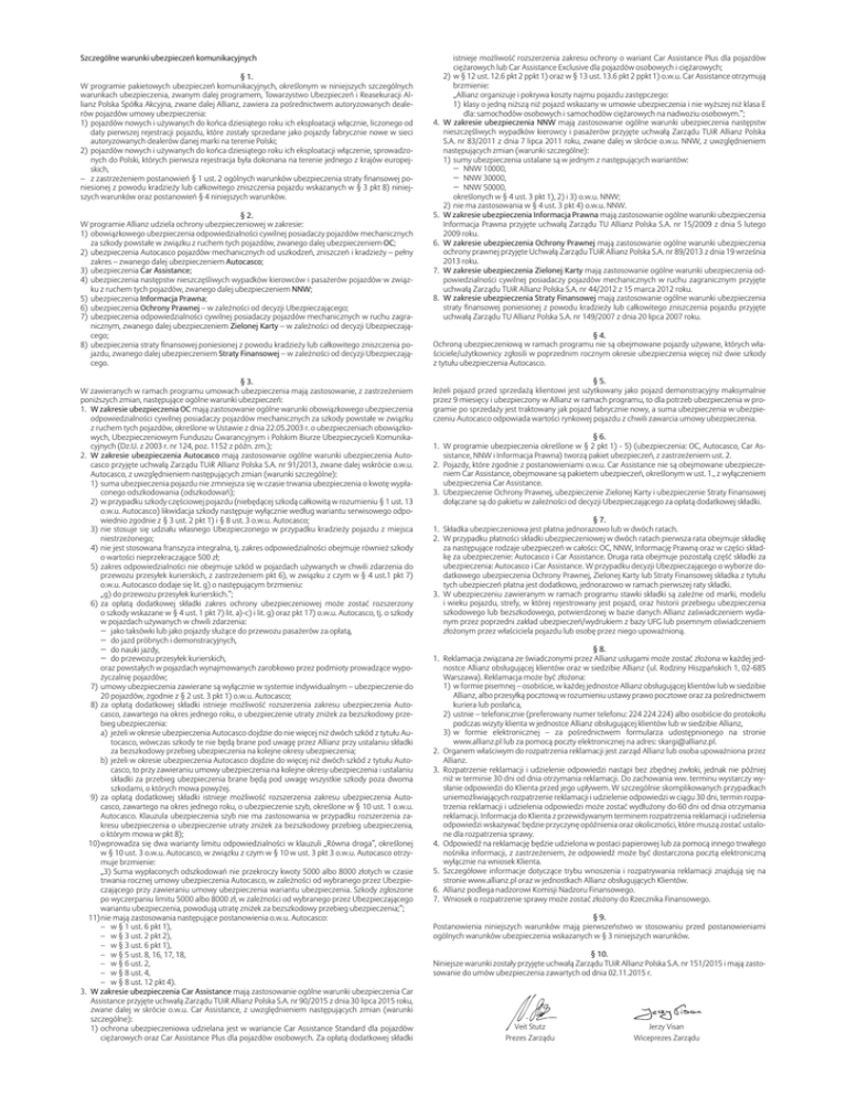 Szczególne warunki ubezpieczeń komunikacyjnych § 1. W programie pakietowych ubezpieczeń komunikacyjnych, określonym w niniejszych szczególnych warunkach ubezpieczenia, zwanym dalej programem, Towarzystwo Ubezpieczeń i Reasekuracji Allianz Polska Spółka Akcyjna, zwane dalej Allianz, zawiera za pośrednictwem autoryzowanych dealerów pojazdów umowy ubezpieczenia: 1) pojazdów nowych i używanych do końca dziesiątego roku ich eksploatacji włącznie, liczonego od daty pierwszej rejestracji pojazdu, które zostały sprzedane jako pojazdy fabrycznie nowe w sieci autoryzowanych dealerów danej marki na terenie Polski; 2) pojazdów nowych i używanych do końca dziesiątego roku ich eksploatacji włączenie, sprowadzonych do Polski, których pierwsza rejestracja była dokonana na terenie jednego z krajów europejskich, – z zastrzeżeniem postanowień § 1 ust. 2 ogólnych warunków ubezpieczenia straty finansowej poniesionej z powodu kradzieży lub całkowitego zniszczenia pojazdu wskazanych w § 3 pkt 8) niniejszych warunków oraz postanowień § 4 niniejszych warunków. § 2. W programie Allianz udziela ochrony ubezpieczeniowej w zakresie: 1) obowiązkowego ubezpieczenia odpowiedzialności cywilnej posiadaczy pojazdów mechanicznych za szkody powstałe w związku z ruchem tych pojazdów, zwanego dalej ubezpieczeniem OC; 2) ubezpieczenia Autocasco pojazdów mechanicznych od uszkodzeń, zniszczeń i kradzieży – pełny zakres – zwanego dalej ubezpieczeniem Autocasco; 3) ubezpieczenia Car Assistance; 4) ubezpieczenia następstw nieszczęśliwych wypadków kierowców i pasażerów pojazdów w związku z ruchem tych pojazdów, zwanego dalej ubezpieczeniem NNW; 5) ubezpieczenia Informacja Prawna; 6) ubezpieczenia Ochrony Prawnej – w zależności od decyzji Ubezpieczającego; 7) ubezpieczenia odpowiedzialności cywilnej posiadaczy pojazdów mechanicznych w ruchu zagranicznym, zwanego dalej ubezpieczeniem Zielonej Karty – w zależności od decyzji Ubezpieczającego; 8) ubezpieczenia straty finansowej poniesionej z powodu kradzieży lub całkowitego zniszczenia pojazdu, zwanego dalej ubezpieczeniem Straty Finansowej – w zależności od decyzji Ubezpieczającego. § 3. W zawieranych w ramach programu umowach ubezpieczenia mają zastosowanie, z zastrzeżeniem poniższych zmian, następujące ogólne warunki ubezpieczeń: 1. W zakresie ubezpieczenia OC mają zastosowanie ogólne warunki obowiązkowego ubezpieczenia odpowiedzialności cywilnej posiadaczy pojazdów mechanicznych za szkody powstałe w związku z ruchem tych pojazdów, określone w Ustawie z dnia 22.05.2003 r. o ubezpieczeniach obowiązkowych, Ubezpieczeniowym Funduszu Gwarancyjnym i Polskim Biurze Ubezpieczycieli Komunikacyjnych (Dz.U. z 2003 r. nr 124, poz. 1152 z późn. zm.); 2. W zakresie ubezpieczenia Autocasco mają zastosowanie ogólne warunki ubezpieczenia Autocasco przyjęte uchwałą Zarządu TUiR Allianz Polska S.A. nr 91/2013, zwane dalej wskrócie o.w.u. Autocasco, z uwzględnieniem następujących zmian (warunki szczególne): 1) suma ubezpieczenia pojazdu nie zmniejsza się w czasie trwania ubezpieczenia o kwotę wypłaconego odszkodowania (odszkodowań); 2) w przypadku szkody częściowej pojazdu (niebędącej szkodą całkowitą w rozumieniu § 1 ust. 13 o.w.u. Autocasco) likwidacja szkody następuje wyłącznie według wariantu serwisowego odpowiednio zgodnie z § 3 ust. 2 pkt 1) i § 8 ust. 3 o.w.u. Autocasco; 3) nie stosuje się udziału własnego Ubezpieczonego w przypadku kradzieży pojazdu z miejsca niestrzeżonego; 4) nie jest stosowana franszyza integralna, tj. zakres odpowiedzialności obejmuje również szkody o wartości nieprzekraczające 500 zł; 5) zakres odpowiedzialności nie obejmuje szkód w pojazdach używanych w chwili zdarzenia do przewozu przesyłek kurierskich, z zastrzeżeniem pkt 6), w związku z czym w § 4 ust.1 pkt 7) o.w.u. Autocasco dodaje się lit. g) o następującym brzmieniu: „g) do przewozu przesyłek kurierskich.”; 6) za opłatą dodatkowej składki zakres ochrony ubezpieczeniowej może zostać rozszerzony o szkody wskazane w § 4 ust. 1 pkt 7) lit. a)-c) i lit. g) oraz pkt 17) o.w.u. Autocasco, tj. o szkody w pojazdach używanych w chwili zdarzenia: − jako taksówki lub jako pojazdy służące do przewozu pasażerów za opłatą, − do jazd próbnych i demonstracyjnych, − do nauki jazdy, − do przewozu przesyłek kurierskich, oraz powstałych w pojazdach wynajmowanych zarobkowo przez podmioty prowadzące wypożyczalnię pojazdów; 7) umowy ubezpieczenia zawierane są wyłącznie w systemie indywidualnym – ubezpieczenie do 20 pojazdów, zgodnie z § 2 ust. 3 pkt 1) o.w.u. Autocasco; 8) za opłatą dodatkowej składki istnieje możliwość rozszerzenia zakresu ubezpieczenia Autocasco, zawartego na okres jednego roku, o ubezpieczenie utraty zniżek za bezszkodowy przebieg ubezpieczenia: a) jeżeli w okresie ubezpieczenia Autocasco dojdzie do nie więcej niż dwóch szkód z tytułu Autocasco, wówczas szkody te nie będą brane pod uwagę przez Allianz przy ustalaniu składki za bezszkodowy przebieg ubezpieczenia na kolejne okresy ubezpieczenia; b) jeżeli w okresie ubezpieczenia Autocasco dojdzie do więcej niż dwóch szkód z tytułu Autocasco, to przy zawieraniu umowy ubezpieczenia na kolejne okresy ubezpieczenia i ustalaniu składki za przebieg ubezpieczenia brane będą pod uwagę wszystkie szkody poza dwoma szkodami, o których mowa powyżej. 9) za opłatą dodatkowej składki istnieje możliwość rozszerzenia zakresu ubezpieczenia Autocasco, zawartego na okres jednego roku, o ubezpieczenie szyb, określone w § 10 ust. 1 o.w.u. Autocasco. Klauzula ubezpieczenia szyb nie ma zastosowania w przypadku rozszerzenia zakresu ubezpieczenia o ubezpieczenie utraty zniżek za bezszkodowy przebieg ubezpieczenia, o którym mowa w pkt 8); 10)wprowadza się dwa warianty limitu odpowiedzialności w klauzuli „Równa droga”, określonej w § 10 ust. 3 o.w.u. Au