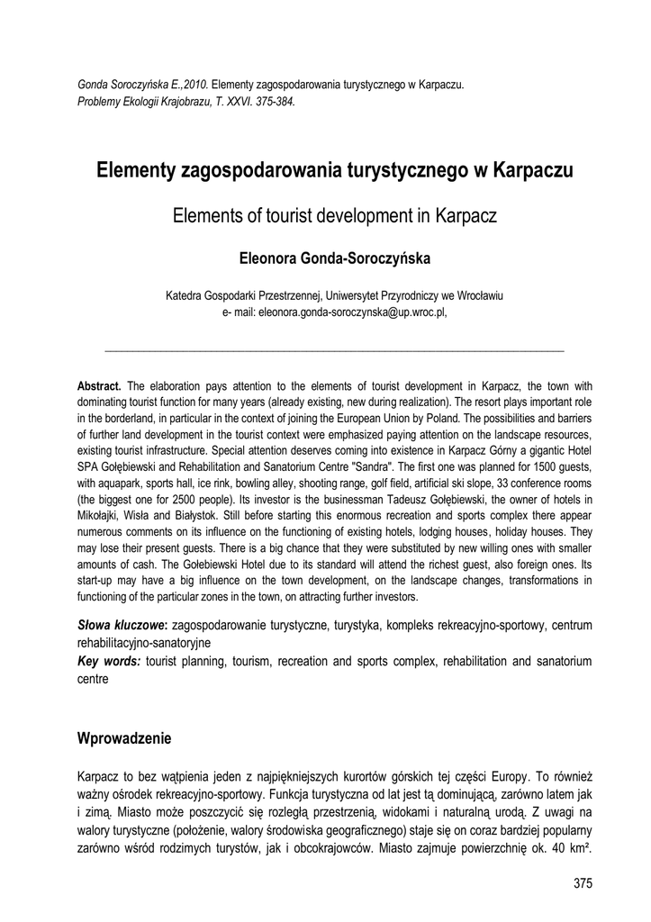 Gonda Soroczyńska E.,2010. Elementy zagospodarowania turystycznego w Karpaczu. Problemy Ekologii Krajobrazu, T. XXVI. 375-384. Elementy zagospodarowania turystycznego w Karpaczu Elements of tourist development in Karpacz Eleonora Gonda-Soroczyńska Katedra Gospodarki Przestrzennej, Uniwersytet Przyrodniczy we Wrocławiu e- mail: [email protected], __________________________________________________________________________________ Abstract. The elaboration pays attention to the elements of tourist development in Karpacz, the town with dominating tourist function for many years (already existing, new during realization). The resort plays important role in the borderland, in particular in the context of joining the European Union by Poland. The possibilities and barriers of further land development in the tourist context were emphasized paying attention on the landscape resources, existing tourist infrastructure. Special attention deserves coming into existence in Karpacz Górny a gigantic Hotel SPA Gołębiewski and Rehabilitation and Sanatorium Centre "Sandra". The first one was planned for 1500 guests, with aquapark, sports hall, ice rink, bowling alley, shooting range, golf field, artificial ski slope, 33 conference rooms (the biggest one for 2500 people). Its investor is the businessman Tadeusz Gołębiewski, the owner of hotels in Mikołajki, Wisła and Białystok. Still before starting this enormous recreation and sports complex there appear numerous comments on its influence on the functioning of existing hotels, lodging houses, holiday houses. They may lose their present guests. There is a big chance that they were substituted by new willing ones with smaller amounts of cash. The Gołebiewski Hotel due to its standard will attend the richest guest, also foreign ones. Its start-up may have a big influence on the town development, on the landscape changes, transformations in functioning of the particular zones in the town, on attracting further investors. Słowa kluczowe: zagospodarowanie turystyczne, turystyka, kompleks rekreacyjno-sportowy, centrum rehabilitacyjno-sanatoryjne Key words: tourist planning, tourism, recreation and sports complex, rehabilitation and sanatorium centre Wprowadzenie Karpacz to bez wątpienia jeden z najpiękniejszych kurortów górskich tej części Europy. To również ważny ośrodek rekreacyjno-sportowy. Funkcja turystyczna od lat jest tą dominującą, zarówno latem jak i zimą. Miasto może poszczycić się rozległą przestrzenią, widokami i naturalną urodą. Z uwagi na walory turystyczne (położenie, walory środowiska geograficznego) staje się on coraz bardziej popularny zarówno wśród rodzimych turystów, jak i obcokrajowców. Miasto zajmuje powierzchnię ok. 40 km². 375 Gonda-Soroczyńska E. Liczy 4995 mieszkańców (dane na 2008 rok), przy gęstości zaludnienia 131,5 os./km². Położone jest w południowo-zachodniej części województwa dolnośląskiego, w Karkonoszach, u zbiegu Łomnicy i Łomniczki, u podnóża Śnieżki (1602 m n.p.m.). Od XIV w. ośrodek wydobycia złota i kamieni półszlachetnych. Od 1677 znany jako Krummhübel (nazwa urzędowa do 1945). Od poł. XIX w. rozwija się jako ośrodek turystyczno-wypoczynkowy. Prawa miejskie miejscowość uzyskała w 1959 roku. To główna baza wypadowa we wschodniej części Karkonoszy. Najwyższy szczyt Karkonoszy – Śnieżka znajduje się także w granicach miasta. Miasto rocznie odwiedzane jest przez około 150 tysięcy turystów. Do atrakcji turystycznych Karpacza należy: wyciąg krzesełkowy na Kopę, letni tor saneczkowy, zimowy tor saneczkowy, wyciągi narciarskie, dwie skocznie narciarskie, liczne korty tenisowe. Miasto jest organizatorem lub współorganizatorem wielu imprez sportowych, rozrywkowych i kulturalnych (ogółem jest ich ok. 70-ciu rocznie). Najważniejsze z nich to: Kontynentalny Puchar Świata B w Kombinacji Norweskiej (styczeń); Mistrzostwa Polski Seniorów w Skokach i Kombinacji Norweskiej (styczeń); "Ślizg na Bele Czym", organizowany nie w każdym roku (luty); Mistrzostwa Polski Żeglarzy w Narciarstwie Alpejskim (z udziałem żeglarzy, sterników i miłośników windsurfingu (marzec); „Memoriał Waldemara Siemaszki” Puchar Polski w Ski-Alpiniźmie. Mistrzostwa Służb Ratowniczych – Żleb Małego Stawu (marzec); „Mistrzostwa Polski z Jajem” (w miesiącu w którym przypada Wielkanoc); „Puchar Samotni” zawody narciarskie w Kotle Małego Stawu bez podziału na grupy wiekowe (kwiecień); Mistrzostwa Polski w Western i Rodeo (Western City) – (maj); Festyn Majowy – impreza plenerowa (maj); „Bieg na Śnieżkę” – trasą jednego z najtrudniejszych biegów górskich w Europie, przy wzniesieniu 1012 m (czerwiec); Międzynarodowy Zjazd Zabytkowych Pojazdów Pożarniczych (lipiec) (ryc. 1); Kolarski Wyścig na Śnieżkę (sierpień); Mistrzostwa Tragarzy Lektyk (sierpień); Finały kolarskiego wyścigu "Tour de Pologne" (wrzesień); Mistrzostwa Dolnego Śląska na sankorolkach (wrzesień); Międzynarodowy "Zbieg ze Śnieżki do Samotni" (wrzesień); Mistrzostwa Polski Dziennikarzy na Letnich Torach Saneczkowych (wrzesień); „Wyścigi Psich Zaprzęgów Husky” (grudzień). Ilość cyklicznych imprez, w tym o zasięgu międzynarodowym dowodzi o zapotrzebowaniach Karpacza w zakresie infrastruktury turystycznej, której ważnym elementem jest budowa kompleksu Gołębiewski i Centrum Rehabilitacyjno-Sanatoryjnego „Sandra”. Karpacz przyciąga turystów walorami krajobrazów. Można w nim delektować się przepięknymi widokami i czystym powietrzem. Z niemalże każdego miejsca podziwiać można pasmo Karkonoszy z najwyższym szczytem Śnieżką, która króluje nad miastem. Z Karpacza wychodzi wiele szlaków turystycznych. Wśród nich najbardziej uczęszczany to szlak na Śnieżkę. Dla wielu osób (w tym kuracjuszy) stanowi on wspaniałe miejsce powrotu do zdrowia, miejsce z możliwością skorzystania z aktywnego wypoczynku, miejsce 
