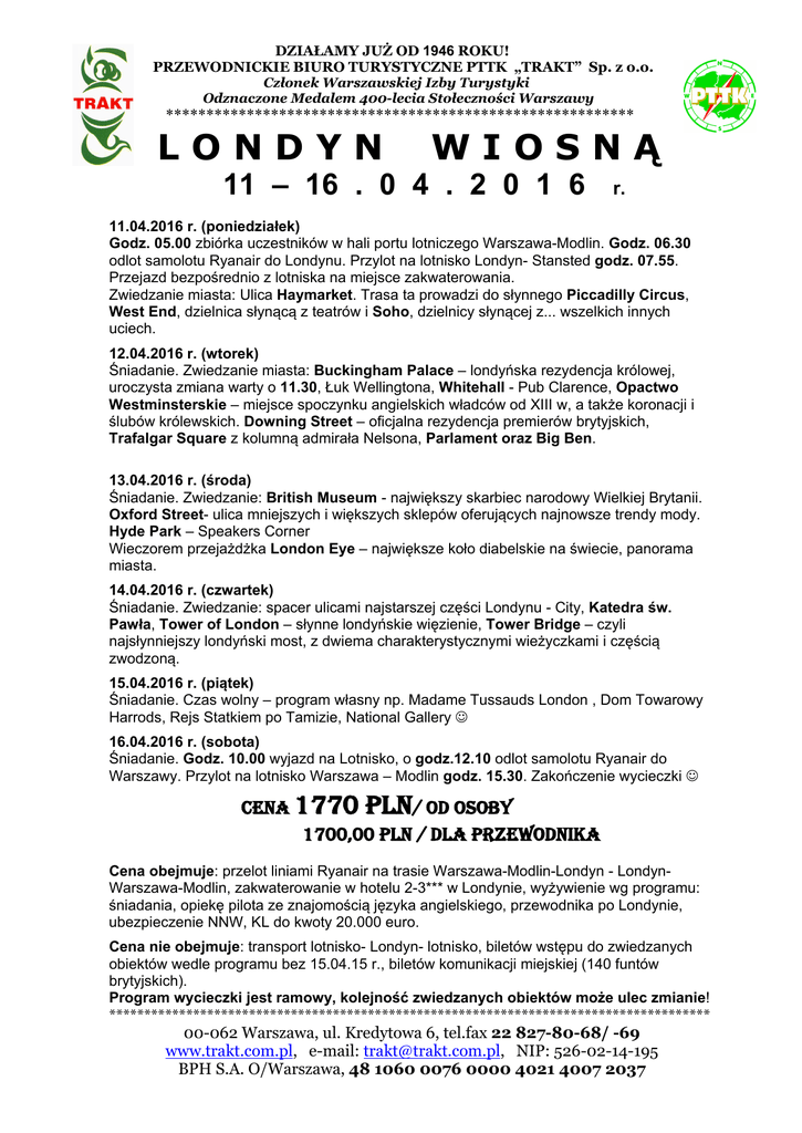 DZIAŁAMY JUŻ OD 1946 ROKU! PRZEWODNICKIE BIURO TURYSTYCZNE PTTK „TRAKT” Sp. z o.o. Członek Warszawskiej Izby Turystyki Odznaczone Medalem 400-lecia Stołeczności Warszawy ********************************************************** LONDYN WIOSNĄ 11 – 16 . 0 4 . 2 0 1 6 r. 11.04.2016 r. (poniedziałek) Godz. 05.00 zbiórka uczestników w hali portu lotniczego Warszawa-Modlin. Godz. 06.30 odlot samolotu Ryanair do Londynu. Przylot na lotnisko Londyn- Stansted godz. 07.55. Przejazd bezpośrednio z lotniska na miejsce zakwaterowania. Zwiedzanie miasta: Ulica Haymarket. Trasa ta prowadzi do słynnego Piccadilly Circus, West End, dzielnica słynącą z teatrów i Soho, dzielnicy słynącej z... wszelkich innych uciech. 12.04.2016 r. (wtorek) Śniadanie. Zwiedzanie miasta: Buckingham Palace – londyńska rezydencja królowej, uroczysta zmiana warty o 11.30, Łuk Wellingtona, Whitehall - Pub Clarence, Opactwo Westminsterskie – miejsce spoczynku angielskich władców od XIII w, a także koronacji i ślubów królewskich. Downing Street – oficjalna rezydencja premierów brytyjskich, Trafalgar Square z kolumną admirała Nelsona, Parlament oraz Big Ben. 13.04.2016 r. (środa) Śniadanie. Zwiedzanie: British Museum - największy skarbiec narodowy Wielkiej Brytanii. Oxford Street- ulica mniejszych i większych sklepów oferujących najnowsze trendy mody. Hyde Park – Speakers Corner Wieczorem przejażdżka London Eye – największe koło diabelskie na świecie, panorama miasta. 14.04.2016 r. (czwartek) Śniadanie. Zwiedzanie: spacer ulicami najstarszej części Londynu - City, Katedra św. Pawła, Tower of London – słynne londyńskie więzienie, Tower Bridge – czyli najsłynniejszy londyński most, z dwiema charakterystycznymi wieżyczkami i częścią zwodzoną. 15.04.2016 r. (piątek) Śniadanie. Czas wolny – program własny np. Madame Tussauds London , Dom Towarowy Harrods, Rejs Statkiem po Tamizie, National Gallery 16.04.2016 r. (sobota) Śniadanie. Godz. 10.00 wyjazd na Lotnisko, o godz.12.10 odlot samolotu Ryanair do Warszawy. Przylot na lotnisko Warszawa – Modlin godz. 15.30. Zakończenie wycieczki CENA 1770 PLN/ od osoby 1700,00 PLN / dla przewodnika Cena obejmuje: przelot liniami Ryanair na trasie Warszawa-Modlin-Londyn - LondynWarszawa-Modlin, zakwaterowanie w hotelu 2-3*** w Londynie, wyżywienie wg programu: śniadania, opiekę pilota ze znajomością języka angielskiego, przewodnika po Londynie, ubezpieczenie NNW, KL do kwoty 20.000 euro. Cena nie obejmuje: transport lotnisko- Londyn- lotnisko, biletów wstępu do zwiedzanych obiektów wedle programu bez 15.04.15 r., biletów komunikacji miejskiej (140 funtów brytyjskich). Program wycieczki jest ramowy, kolejność zwiedzanych obiektów może ulec zmianie! ************************************************************************************** 00-062 Warszawa, ul. Kredytowa 6, tel.fax 22 827-80-68/ -69 www.trakt.com.pl, e-mail: [email protected], NIP: 526-02-14-195 BPH S.A. O/Warszawa, 48 1060 0076 0000 4021 4007 2037