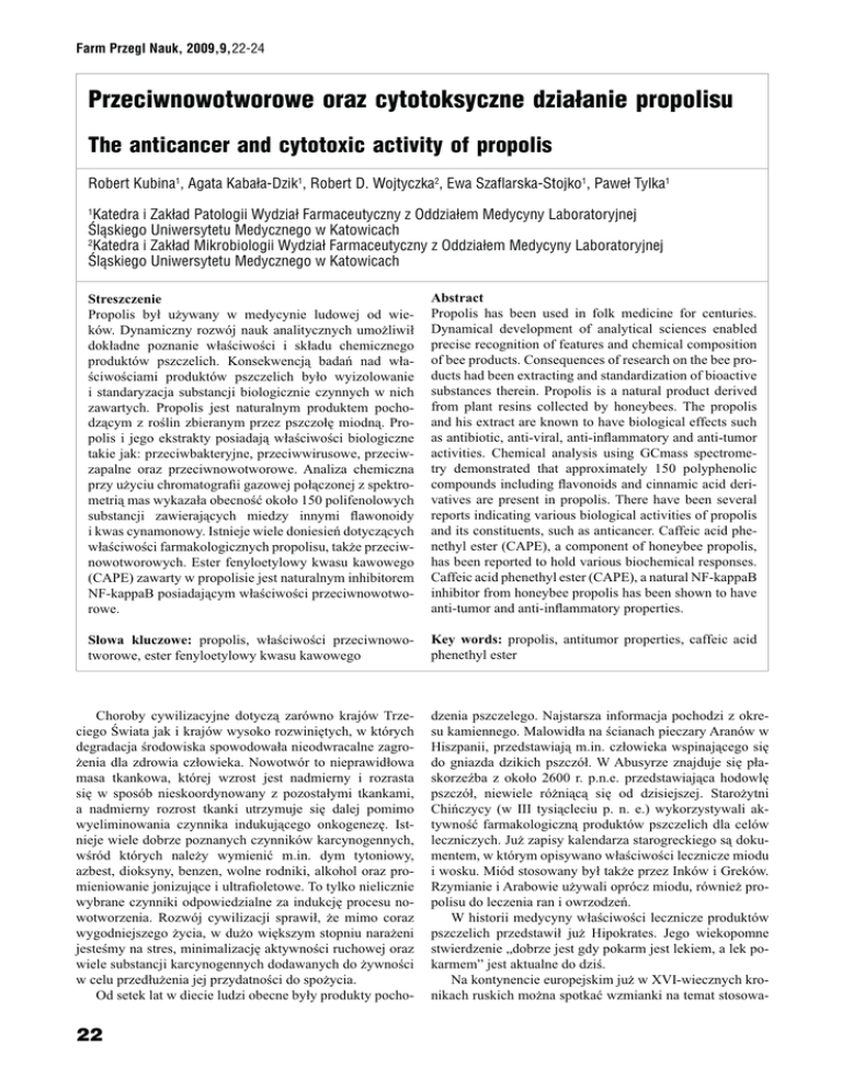 &ARM0RZEGL.AUK 0RZECIWNOWOTWOROWEORAZCYTOTOKSYCZNEDZIAANIEPROPOLISU 4HEANTICANCERANDCYTOTOXICACTIVITYOFPROPOLIS 2OBERT+UBINA!GATA+ABAA$ZIK2OBERT$7OJTYCZKA%WA3ZAFLARSKA3TOJKO0AWE4YLKA +ATEDRAI:AKAD0ATOLOGII7YDZIA&ARMACEUTYCZNYZ/DDZIAEM-EDYCYNY,ABORATORYJNEJ gLSKIEGO5NIWERSYTETU-EDYCZNEGOW+ATOWICACH +ATEDRAI:AKAD-IKROBIOLOGII7YDZIA&ARMACEUTYCZNYZ/DDZIAEM-EDYCYNY,ABORATORYJNEJ gLSKIEGO5NIWERSYTETU-EDYCZNEGOW+ATOWICACH Streszczenie Propolis był używany w medycynie ludowej od wieków. Dynamiczny rozwój nauk analitycznych umożliwił dokładne poznanie właściwości i składu chemicznego produktów pszczelich. Konsekwencją badań nad właściwościami produktów pszczelich było wyizolowanie i standaryzacja substancji biologicznie czynnych w nich zawartych. Propolis jest naturalnym produktem pochodzącym z roślin zbieranym przez pszczołę miodną. Propolis i jego ekstrakty posiadają właściwości biologiczne takie jak: przeciwbakteryjne, przeciwwirusowe, przeciwzapalne oraz przeciwnowotworowe. Analiza chemiczna przy użyciu chromatografii gazowej połączonej z spektrometrią mas wykazała obecność około 150 polifenolowych substancji zawierających miedzy innymi flawonoidy i kwas cynamonowy. Istnieje wiele doniesień dotyczących właściwości farmakologicznych propolisu, także przeciwnowotworowych. Ester fenyloetylowy kwasu kawowego (CAPE) zawarty w propolisie jest naturalnym inhibitorem NF-kappaB posiadającym właściwości przeciwnowotworowe. Abstract Propolis has been used in folk medicine for centuries. Dynamical development of analytical sciences enabled precise recognition of features and chemical composition of bee products. Consequences of research on the bee products had been extracting and standardization of bioactive substances therein. Propolis is a natural product derived from plant resins collected by honeybees. The propolis and his extract are known to have biological effects such as antibiotic, anti-viral, anti-inflammatory and anti-tumor activities. Chemical analysis using GCmass spectrometry demonstrated that approximately 150 polyphenolic compounds including flavonoids and cinnamic acid derivatives are present in propolis. There have been several reports indicating various biological activities of propolis and its constituents, such as anticancer. Caffeic acid phenethyl ester (CAPE), a component of honeybee propolis, has been reported to hold various biochemical responses. Caffeic acid phenethyl ester (CAPE), a natural NF-kappaB inhibitor from honeybee propolis has been shown to have anti-tumor and anti-inflammatory properties. Słowa kluczowe: propolis, właściwości przeciwnowotworowe, ester fenyloetylowy kwasu kawowego Key words: propolis, antitumor properties, caffeic acid phenethyl ester Choroby cywilizacyjne dotyczą zarówno krajów Trzeciego Świata jak i krajów wysoko rozwiniętych, w których degradacja środowiska spowodowała nieodwracalne zagrożenia dla zdrowia człowieka. Nowotwór to nieprawidłowa masa tkankowa, której wzrost jest nadmierny i rozrasta się w sposób nieskoordynowany z pozostałymi tkankami, a nadmierny rozrost tkanki utrzymuje się dalej pomimo wyeliminowania czynnika indukującego onkogenezę. Istnieje wiele dobrze poznanych czynników karcynogennych, wśród których należy wymienić m.in. dym tytoniowy, azbest, dioksyny, benzen, wolne rodniki, alkohol oraz promieniowanie jonizujące i ultrafioletowe. To tylko nielicznie wybrane czynniki odpowiedzialne za indukcję procesu nowotworzenia. Rozwój cywilizacji sprawił, że mimo coraz wygodniejszego życia, w dużo większym stopniu narażeni jesteśmy na stres, minimalizację aktywności ruchowej oraz wiele substancji karcynogennych dodawanych do żywności w celu przedłużenia jej przydatności do spożycia. Od setek lat w diecie ludzi obecne były produkty pocho- dzenia pszczelego. Najstarsza informacja pochodzi z okresu kamiennego. Malowidła na ścianach pieczary Aranów w Hiszpanii, przedstawiają m.in. człowieka wspinającego się do gniazda dzikich pszczół. W Abusyrze znajduje się płaskorzeźba z około 2600 r. p.n.e. przedstawiająca hodowlę pszczół, niewiele różniącą się od dzisiejszej. Starożytni Chińczycy (w III tysiącleciu p. n. e.) wykorzystywali aktywność farmakologiczną produktów pszczelich dla celów leczniczych. Już zapisy kalendarza starogreckiego są dokumentem, w którym opisywano właściwości lecznicze miodu i wosku. Miód stosowany był także przez Inków i Greków. Rzymianie i Arabowie używali oprócz miodu, również propolisu do leczenia ran i owrzodzeń. W historii medycyny właściwości lecznicze produktów pszczelich przedstawił już Hipokrates. Jego wiekopomne stwierdzenie „dobrze jest gdy pokarm jest lekiem, a lek pokarmem” jest aktualne do dziś. Na kontynencie europejskim już w XVI-wiecznych kronikach ruskich można spotkać wzmianki na temat stosowa- COPYRIGHT'RUPADR!2+WIECIÊSKIEGO)33. nia miodu i różnych produktów pszczelich w profilaktyce i leczeniu. Progresja nauk analitycznych przyczyniła się do rozwoju badań nad składem chemicznym i właściwościami farmakologicznymi produktów zebranych i częściowo zmienionych lub wydzielanych przez pszczoły. Ośrodki kliniczne i badawcze wyposażone w coraz nowocześniejszą aparaturę analityczną wzbogacają przekazywaną od pokoleń wiedzę na temat składu i właściwości produktów pszczelich [1, 2]. Propolis jako surowiec farmakopealny Jednym z dobrze poznanych surowców farmakopealnych jest propolis (kit pszczeli). Ta smolista substancja wytwarzana jest z żywic drzew liściastych, iglastych, pączków młodych pędów drzew, krzewów i innych roślin zielonych. Surowiec kitu pszczelego przynoszony jest do ula w postaci kropel żywicy umieszczonej w koszyczkach odnóży pszczół lotnych, a następnie przeżuwany przez pszczoły stacjonarne, które modyfikują jego skład wydzieliną gruczołów ślinowych i woskowych zwiększając w ten sposób j