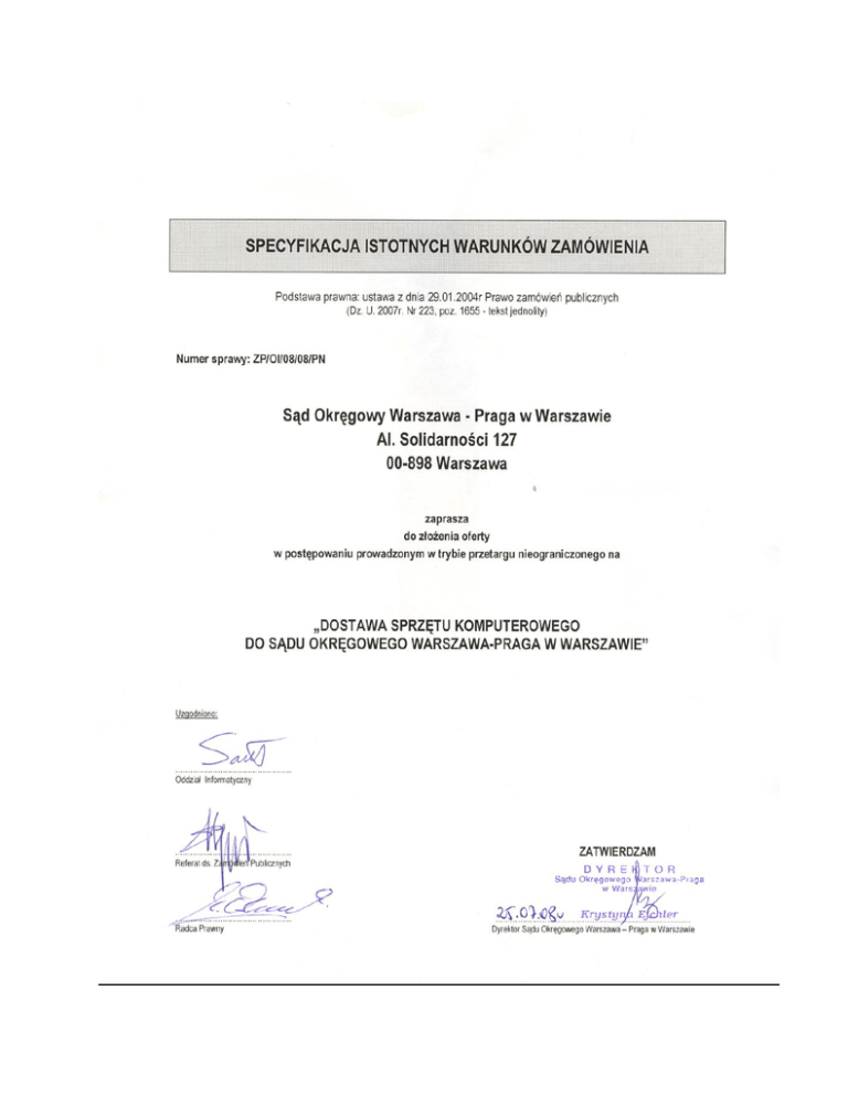 SPIS TREŚCI : Rozdział I Rozdział II Rozdział III Rozdział IV Rozdział V Rozdział VI Rozdział VII Rozdział VIII Rozdział IX Rozdział X Rozdział XI Rozdział XII Rozdział XIII Rozdział XIV Rozdział XV Rozdział XVI Rozdział XVII Nazwa i adres Zamawiającego, Tryb udzielenia zamówienia, Opis przedmiotu zamówienia, Termin wykonania zamówienia, Opis ofert częściowych jeżeli zamawiający dopuszcza ich składanie Warunki udziału w postępowaniu oraz opis sposobu dokonywania oceny tych warunków, Wykaz oświadczeń i dokumentów jakie winni dostarczyć wykonawcy w celu potwierdzenia warunków udziału w postępowaniu, Informacje o sposobie porozumiewania się zamawiającego z wykonawcami oraz przekazywania oświadczeń i dokumentów a także wskazanie osób uprawnionych do porozumiewania się z wykonawcami, Termin związania ofertą, Opis sposobu przygotowania ofert, Miejsce oraz termin składania i otwarcia ofert, Opis sposobu obliczenia ceny, Opis kryteriów, którymi zamawiający będzie się kierował przy wyborze oferty wraz z podaniem znaczenia tych kryteriów oraz sposobu obliczenia ceny, Wymagania dotyczące wadium, Informacje o formalnościach jakie powinny zostać dopełnione po wyborze oferty w celu zawarcia umowy w sprawie zamówienia publicznego, Istotne dla stron postanowienia, które zostaną wprowadzone do treści zawieranej umowy w sprawie zamówienia publicznego, Pouczenie o środkach ochrony prawnej przysługujących wykonawcy w toku postępowania o udzielenie zamówienia. Załączniki: Załącznik nr 1 , 1.3, 1.4 do SIWZ Załącznik nr 2 do SIWZ Załącznik nr 3 do SIWZ 3.1 – 3.7 Załącznik nr 4 do SIWZ - formularz ofertowy i formularz cenowo- ilościowy dla części 3, 4; - oświadczenie z art. 22 ustawy Prawo zamówień publicznych – formularz techniczny dla każdej części przedmiotu zamówienia; - istotne postanowienia umowy. ZP/OI/08/08/PN – Dostawa sprzętu komputerowego do Sądu Okręgowego Warszawa-Praga w Warszawie 2 ROZDZIAŁ I NAZWA I ADRES ZAMAWIAJĄCEGO Sąd Okręgowy Warszawa - Praga w Warszawie, Al. Solidarności 127, 00-898 Warszawa (NIP: 527-24-63-389) tel./fax. (0-22) 440-71-67, 440-41-79 ( HYPERLINK "http://www.warszawapraga.so.gov.pl" www.warszawapraga.so.gov.pl ) ROZDZIAŁ II TRYB UDZIELENIA ZAMÓWIENIA Postępowanie prowadzone będzie w trybie przetargu nieograniczonego na podstawie przepisów ustawy Prawo zamówień publicznych z dnia 29 stycznia 2004r (Dz. U. z 2006r. Nr 164, poz. 1163, Nr 170, poz. 1217 i Nr 227, oraz z 2007r. Nr 64, poz. 427 i Nr 82, poz. 560) – tekst ujednolicony przez Urząd Zamówień Publicznych. ROZDZIAŁ III OPIS PRZEDMIOTU ZAMÓWIENIA ORAZ TERMIN WYKONANIA ZAMÓWIENIA 1. Przedmiotem zamówienia jest dostawa sprzętu komputerowego do Sądu Okręgowego Warszawa – Praga w Warszawie w następującym asortymencie Część przetargowa Ilość (sztuki) kod CPV 2 30260000-9 23 31682500-5 wg załącznika nr 1.3 30217200-5 wg załącznika nr 1.4 30217200-5 część nr 1 serwery część nr 2 zasilacze awaryjne część nr 3 peryferia komputerowe część nr 4 kable i adaptery komputerowe część nr 5 karty rozszerzeń do switcha część nr 6 baterie do laptopa część nr 7 2 30217200-5 3 30217200-5 6 30217200-5 zasilacze do laptopów 2. Szczegółowy opis wymagań technicznych opisany jest w załączniku: a) b) c) d) e) f) g) dla części 1 – załącznik nr 3.1 dla części 2 – załącznik nr 3.2 dla części 3 – załącznik nr 3.3 dla części 4 – załącznik nr 3.4 dla części 5 – załącznik nr 3.5 dla części 6 – załącznik nr 3.6 dla części 7 – załącznik nr 3.7 ZP/OI/08/08/PN – Dostawa sprzętu komputerowego do Sądu Okręgowego Warszawa-Praga w Warszawie 3 3. Ilekroć w niniejszej specyfikacji przedmiot zamówienia jest opisany ze wskazaniem znaków towarowych, patentów lub pochodzenia, to przyjmuje się, że wskazaniom takim towarzyszą wyrazy „lub równoważne”. 4. Zamawiający wymaga aby: • sprzęt był fabrycznie nowy, w oryginalnym opakowaniu wraz z wyposażeniem zgodnie ze specyfikacją producenta umieszczoną na opakowaniu, spełniający obowiązujące normy i parametry dopuszczające do sprzedaży i używania na terenie Polski (w opisie technicznym, karcie referencyjnej). • wszystkie urządzenia wymagające do prawidłowej pracy sterowników w systemach operacyjnych Windows 2000, XP i 2003 Server muszą zostać dostarczone ze sterownikami do tych systemów, • • • • sprzęt był objęty gwarancją opisaną szczegółowo w formularzu ofertowym dla każdej części, instrukcja obsługi była dostarczona w języku polskim, Wykonawca zapoznał się z istotnymi postanowieniami umowy, dostawy poszczególnych części były realizowane w terminie wymaganym w SIWZ i faktura była wystawiona na każdą część oddzielnie. 5. Zamawiający nie przewiduje zamówień uzupełniających zgodnie z art. 67 ust. 1 pkt 7 ustawy (Pzp). 6. Zamawiający nie dopuszcza składania ofert wariantowych. 7. Wykonawca jest obowiązany wskazać część zamówienia, którą zamierza powierzyć podwykonawcy. ROZDZIAŁ IV TERMIN WYKONANIA ZAMÓWIENIA Termin realizacji dostawy: dla części 1 – do 28 dni od daty podpisania umowy, dla części 2 – 7 – do 21 dni od dnia podpisania umowy. ROZDZIAŁ V OPIS OFERT CZĘŚCIOWYCH JEŻELI ZAMAWIAJĄCY DOPUSZCZA ICH SKŁADANIE Zamawiający dopuszcza składanie ofert częściowych w następujących częściach: część nr 1- serwery z macierzą dyskową i obudową, część nr 2 - zasilacze awaryjne, część nr 3 - peryferia, części i akcesoria komputerowe, część nr 4 - kable i adaptery komputerowe, część nr 5 - karty rozszerzeń do switcha, część nr 6 - baterie do laptopa, część nr 7 - zasilacze do laptopów. ROZDZIAŁ VI WARUNKI UDZIAŁU W POSTĘPOWANIU ORAZ OPIS SPOSOBU DOKONYWANIA OCENY SPEŁNIANIA TYCH WARUNKÓW 1. O udzielenie zamówienia mogą ubiegać się Wykonawcy, którzy spełniają poniższe warunki udzia
