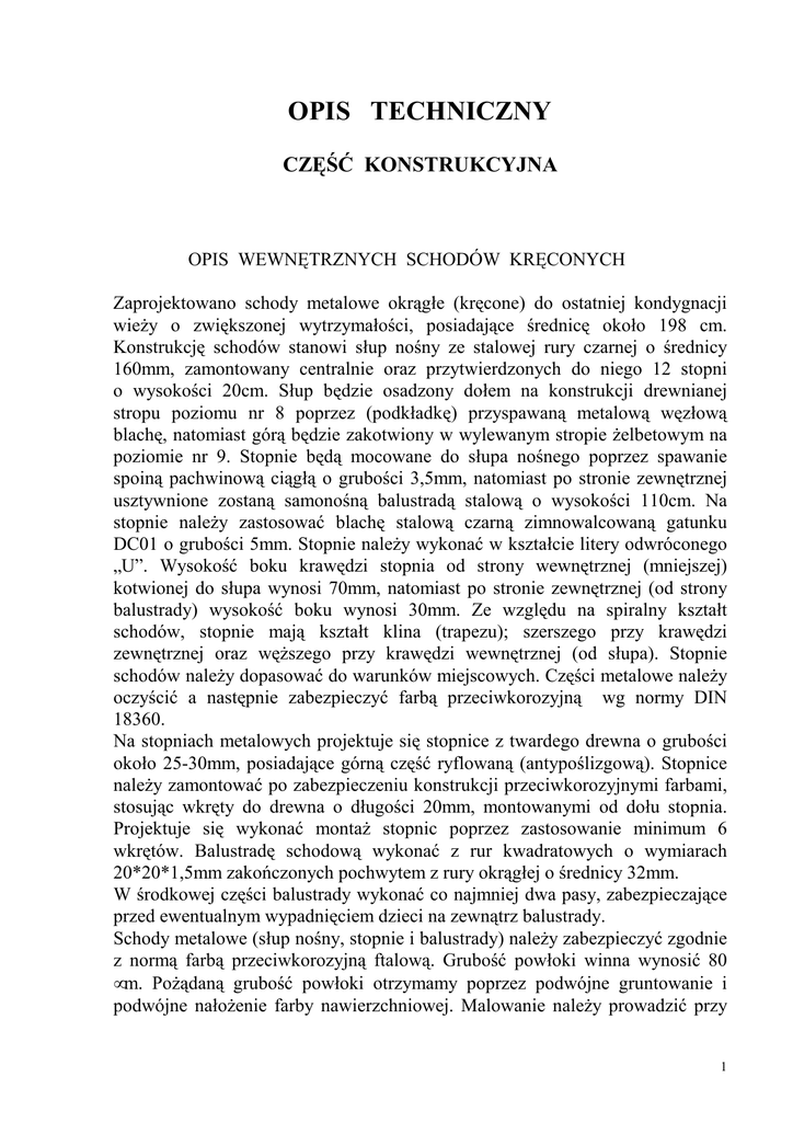 OPIS TECHNICZNY CZĘŚĆ KONSTRUKCYJNA OPIS WEWNĘTRZNYCH SCHODÓW KRĘCONYCH Zaprojektowano schody metalowe okrągłe (kręcone) do ostatniej kondygnacji wieŜy o zwiększonej wytrzymałości, posiadające średnicę około 198 cm. Konstrukcję schodów stanowi słup nośny ze stalowej rury czarnej o średnicy 160mm, zamontowany centralnie oraz przytwierdzonych do niego 12 stopni o wysokości 20cm. Słup będzie osadzony dołem na konstrukcji drewnianej stropu poziomu nr 8 poprzez (podkładkę) przyspawaną metalową węzłową blachę, natomiast górą będzie zakotwiony w wylewanym stropie Ŝelbetowym na poziomie nr 9. Stopnie będą mocowane do słupa nośnego poprzez spawanie spoiną pachwinową ciągłą o grubości 3,5mm, natomiast po stronie zewnętrznej usztywnione zostaną samonośną balustradą stalową o wysokości 110cm. Na stopnie naleŜy zastosować blachę stalową czarną zimnowalcowaną gatunku DC01 o grubości 5mm. Stopnie naleŜy wykonać w kształcie litery odwróconego „U”. Wysokość boku krawędzi stopnia od strony wewnętrznej (mniejszej) kotwionej do słupa wynosi 70mm, natomiast po stronie zewnętrznej (od strony balustrady) wysokość boku wynosi 30mm. Ze względu na spiralny kształt schodów, stopnie mają kształt klina (trapezu); szerszego przy krawędzi zewnętrznej oraz węŜszego przy krawędzi wewnętrznej (od słupa). Stopnie schodów naleŜy dopasować do warunków miejscowych. Części metalowe naleŜy oczyścić a następnie zabezpieczyć farbą przeciwkorozyjną wg normy DIN 18360. Na stopniach metalowych projektuje się stopnice z twardego drewna o grubości około 25-30mm, posiadające górną część ryflowaną (antypoślizgową). Stopnice naleŜy zamontować po zabezpieczeniu konstrukcji przeciwkorozyjnymi farbami, stosując wkręty do drewna o długości 20mm, montowanymi od dołu stopnia. Projektuje się wykonać montaŜ stopnic poprzez zastosowanie minimum 6 wkrętów. Balustradę schodową wykonać z rur kwadratowych o wymiarach 20*20*1,5mm zakończonych pochwytem z rury okrągłej o średnicy 32mm. W środkowej części balustrady wykonać co najmniej dwa pasy, zabezpieczające przed ewentualnym wypadnięciem dzieci na zewnątrz balustrady. Schody metalowe (słup nośny, stopnie i balustrady) naleŜy zabezpieczyć zgodnie z normą farbą przeciwkorozyjną ftalową. Grubość powłoki winna wynosić 80 µm. PoŜądaną grubość powłoki otrzymamy poprzez podwójne gruntowanie i podwójne nałoŜenie farby nawierzchniowej. Malowanie naleŜy prowadzić przy 1 wilgotności mniejszej niŜ 90% w temperaturze od +5 do +40 oC. Pierwszą warstwę powłoki moŜna nałoŜyć po pocięciu elementów do załoŜonych w projekcie wymiarów i przygotowaniu do montaŜu, w zakładzie produkcyjnym – drugą po osadzeniu (zamontowaniu) na obiekcie. Farba olejna miniowa 80% zawiera składniki trujące, przy malowaniu naleŜy uŜywać ubrań ochronnych, a po pracy naleŜy myć ręce. Nie naleŜy przystępować do pracy ze skaleczonymi dłońmi. Powierzchnię do malowania naleŜy przygotować do II lub III stopnia oczyszczenia, osuszyć i odtłuścić: wg KOR 3A. Spoiny oczyścić z resztek ŜuŜlu oraz nieorganicznych, nierozpuszczalnych w wodzie substancji (przez piaskowanie lub śrutowanie). Elementy wykonane w zakładzie produkcyjnym naleŜy raz zagruntować w zakładzie z tym, Ŝe w miejscach styków montaŜowych naleŜy pozostawić wolny od farby pas po 50mm z kaŜdej strony, aby moŜna było wykonać spoinę. Podczas transportu z zakładu produkcyjnego naleŜy uŜyć podkładek filcowych lub gumowych pod elementy, aby powłoka malarska nie uległa uszkodzeniu. JeŜeli elementy będą składowane na placu budowy, naleŜy układać je na drewnianych, stalowych, betonowych lub kamiennych podkładkach minimum 300mm nad powierzchnią terenu. JeŜeli w wyniku procesu montaŜowego w powłoce nastąpiły uszkodzenia, naleŜy miejsca takie oczyścić i ponownie pokryć warstwą ochronną. Po nałoŜeniu wszystkich warstw naleŜy sprawdzić, czy nie występują: pęcherze, odstawanie powłoki, miejsca niepokryte, liczne zacieki i zmarszczki, wtrącenia obcych ciał. Przy pracy naleŜy przestrzegać przepisów p.poŜ. i BHP. Opracował: inŜ. Stefan Olejnik 2