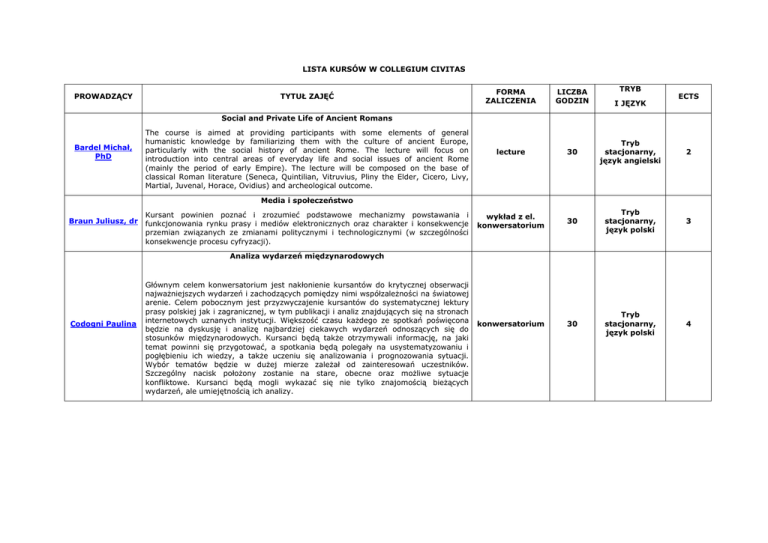 LISTA KURSÓW W COLLEGIUM CIVITAS PROWADZĄCY TYTUŁ ZAJĘĆ TRYB FORMA ZALICZENIA LICZBA GODZIN lecture 30 Tryb stacjonarny, język angielski 2 wykład z el. konwersatorium 30 Tryb stacjonarny, język polski 3 konwersatorium 30 Tryb stacjonarny, język polski 4 I JĘZYK ECTS Social and Private Life of Ancient Romans Bardel Michał, PhD The course is aimed at providing participants with some elements of general humanistic knowledge by familiarizing them with the culture of ancient Europe, particularly with the social history of ancient Rome. The lecture will focus on introduction into central areas of everyday life and social issues of ancient Rome (mainly the period of early Empire). The lecture will be composed on the base of classical Roman literature (Seneca, Quintilian, Vitruvius, Pliny the Elder, Cicero, Livy, Martial, Juvenal, Horace, Ovidius) and archeological outcome. Media i społeczeństwo Braun Juliusz, dr Kursant powinien poznać i zrozumieć podstawowe mechanizmy powstawania i funkcjonowania rynku prasy i mediów elektronicznych oraz charakter i konsekwencje przemian związanych ze zmianami politycznymi i technologicznymi (w szczególności konsekwencje procesu cyfryzacji). Analiza wydarzeń międzynarodowych Codogni Paulina Głównym celem konwersatorium jest nakłonienie kursantów do krytycznej obserwacji najważniejszych wydarzeń i zachodzących pomiędzy nimi współzależności na światowej arenie. Celem pobocznym jest przyzwyczajenie kursantów do systematycznej lektury prasy polskiej jak i zagranicznej, w tym publikacji i analiz znajdujących się na stronach internetowych uznanych instytucji. Większość czasu każdego ze spotkań poświęcona będzie na dyskusję i analizę najbardziej ciekawych wydarzeń odnoszących się do stosunków międzynarodowych. Kursanci będą także otrzymywali informację, na jaki temat powinni się przygotować, a spotkania będą polegały na usystematyzowaniu i pogłębieniu ich wiedzy, a także uczeniu się analizowania i prognozowania sytuacji. Wybór tematów będzie w dużej mierze zależał od zainteresowań uczestników. Szczególny nacisk położony zostanie na stare, obecne oraz możliwe sytuacje konfliktowe. Kursanci będą mogli wykazać się nie tylko znajomością bieżących wydarzeń, ale umiejętnością ich analizy. Nowe orientacje w muzyce współczesnej. Muzyka popularna - szanse i zagrożenia Czekanowska Anna, prof. Kursant powinien zdobyć orientację w sytuacji sztuki/muzyki w świecie współczesnym, w różnych jej dziedzinach (wysoka, popularna, próby awangardy wraz z różnymi formami przejściowymi). Powinien dowiedzieć jak zagadnienie to przedstawia się w skali świata. Pragnę skoncentrować się na wysokich wartościach współczesnej sztuki (muzyka/teatr) wskazując na jej mistrzów (Witold Lutosławski, Jerzy Grotowski). Bardzo istotnym jest też pytanie – o trwałe wartości sztuki/muzyki tradycyjnej w warunkach zglobalizowanego świata, oraz wskazanie na rodzaje i gatunki które te wartości prezentują. Będziemy wyjaśniać jak rozumiemy pojęcie sztuki tradycyjnej. wykład z el. konwersatorium 30 Tryb stacjonarny, język polski 2 wykład z el. konwersatorium 30 Tryb stacjonarny, język polski 3 wykład 30 Tryb stacjonarny, język polski 3 wykład z el. konwersatorium 30 Tryb stacjonarny, język polski 4 Eurazja na mapie politycznej świata Dziak Waldemar J. Znajomość podstawowych informacji o współczesnej Azji, tj. państwach regionu, konfliktach lokalnych i regionalnych, konfliktach granicznych, przynależności do organizacji międzynarodowych, potencjalnych konfliktach zbrojnych, a także umiejętność usytuowania miejsc państw tego regionu na mapie gospodarczej i politycznej świata. 2. Przegląd najważniejszych państw regionu (Chiny, Indie, Japonia, Rosja, Korea Płd. i Płn, Wietnam. 3. Chiny jako wschodzące supermocarstwo: historia Chin po 1949 r., reformy Denga po 1978 r. , konflikty graniczne Chin z sąsiadami, stosunki chińsko-tajwańskie, rywalizacja chińsko-amerykańska, perspektywy rozwoju stosunków chińsko-rosyjskich. 4. Miejsce Polski na azjatyckiej szachownicy, historia relacji polsko-chińskich, polsko- japońskich, polsko-koreańskich. 5 Polityka zagraniczna RP wobec Azji: stan obecny i perspektywy. Historia Polski po 1914 r. Friszke Andrzej, prof. dr hab. Celem kursu jest prześledzenie najważniejszych polskich doświadczeń XX wieku, przemian jakim ulegało społeczeństwo, głównych nurtów polskiej polityki, miejsca zajmowanego przez Polskę w Europie, w tym kształtowania jej granic i relacji z sąsiadami. Historia najnowsza to bowiem doświadczenia nadal wpływające na współczesne postawy, style myślenia, stereotypy, a także definiowanie państwowej racji stanu. Uzyskana w toku zajęć wiedza jest niezbędna dla prawidłowego analizowania zjawisk z zakresu politologii, stosunków międzynarodowych, a także szeregu dziedzin socjologii (np. przemian i świadomości społeczeństwa polskiego). Główne idee filozoficzne XX wieku, cz.I. Gadacz Tadeusz, prof. dr hab. Celem wykładu jest zapoznanie kursantów z głównymi ideami filozofii i kultury współczesnej (duch, prawda, rozum, doświadczenie, tożsamość i różnica, wolność i odpowiedzialność, podmiot, ciało, skończoność, dialog, historia, krytyka ideologii, ponowoczesność, religia). W wielu wypadkach idee te uległy w XX wieku reinterpretacji, pojawiły się nowe spojrzenia, były też przedmiotem wielu sporów. Na wykładzie zostaną przedstawione główne ich interpretacje i stanowiska. Propedeutyka filozofii, cz.I Gadacz Tadeusz, prof. dr hab. Celem wykładu jest wprowadzenie kursantów w pojęcie filozofii i pogranicza filozofii, próba definicji filozofii, wprowadzenie w różne style myślenia, argumentacji, metody. Natomiast celem części drugiej wykładu jest przedstawienie podstawowych pojęć filozoficznych (np. byt, prawda, człowiek, wolność, wartość, państwo) z