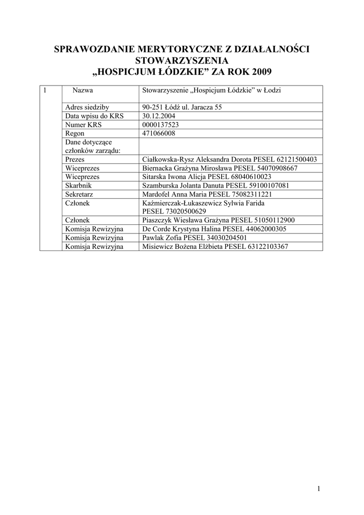 SPRAWOZDANIE MERYTORYCZNE Z DZIAŁALNOŚCI STOWARZYSZENIA „HOSPICJUM ŁÓDZKIE” ZA ROK 2009 1 Nazwa Adres siedziby Data wpisu do KRS Numer KRS Regon Dane dotyczące członków zarządu: Prezes Wiceprezes Wiceprezes Skarbnik Sekretarz Członek Członek Komisja Rewizyjna Komisja Rewizyjna Komisja Rewizyjna Stowarzyszenie „Hospicjum Łódzkie” w Łodzi 90-251 Łódź ul. Jaracza 55 30.12.2004 0000137523 471066008 Ciałkowska-Rysz Aleksandra Dorota PESEL 62121500403 Biernacka GraŜyna Mirosława PESEL 54070908667 Sitarska Iwona Alicja PESEL 68040610023 Szamburska Jolanta Danuta PESEL 59100107081 Mardofel Anna Maria PESEL 75082311221 Kaźmierczak-Łukaszewicz Sylwia Farida PESEL 73020500629 Piaszczyk Wiesława GraŜyna PESEL 51050112900 De Corde Krystyna Halina PESEL 44062000305 Pawlak Zofia PESEL 34030204501 Misiewicz BoŜena ElŜbieta PESEL 63122103367 1 Cele statutowe 2 Zasady, formy i zakres działalności statutowej Celem Stowarzyszenia jest, zgodnie z art.4 ust.1, ustawy z dnia 24 kwietnia 2003 r. o działalności poŜytku publicznego i o wolontariacie, realizacja następujących zadań publicznych: 1) pomoc społeczna, w tym pomoc rodzinom i osobom w trudnej sytuacja Ŝyciowej oraz wyrównywanie szans tych rodzin i osób; 2) zapewnienie zorganizowanej opieki byłym Ŝołnierzom zawodowym, którzy uzyskali uprawnienie do emerytury wojskowej lub wojskowej renty inwalidzkiej, inwalidom wojennym i wojskowym oraz kombatantom; 3) działalność charytatywna; 4) ochrona i promocja zdrowia; 5) działanie na rzecz osób niepełnosprawnych; 6) działalność wspomagająca rozwój gospodarczy, w tym rozwój przedsiębiorczości; 7) działalność wspomagająca rozwój wspólnot i społeczności lokalnych; 8) nauka, edukacja, oświata i wychowanie; 9) kultura, sztuka, ochrona dóbr kultury i tradycji; 10) przeciwdziałanie patologiom społecznym; 11) pomoc ofiarom katastrof, klęsk Ŝywiołowych, konfliktów zbrojnych i wojen w kraju i za granicą; 12) działania na rzecz integracji europejskiej oraz rozwijania kontaktów i współpracy między społeczeństwami; 13) promocja i organizacja wolontariatu; 14) działalność wspomagająca techniczni, szkoleniowo, informacyjnie lub finansowo organizacje pozarządowe, a w szczególności: a) propagowanie idei opieki paliatywnej wśród społeczeństwa; b) organizowanie i współorganizowanie medycznej i duchowej opieki na osobami niepełnosprawnymi i ludźmi cięŜko chorymi i znajdującymi się w terminalnej fazie choroby; c) udzielanie pomocy rodzinom osób cięŜko chorych; d) sprawowanie patronatu nad działalnością instytucji o profilu paliatywnym; e) budowa hospicjum stacjonarnego. W celu realizacji określonych wyŜej zadań, Stowarzyszenie stosuje następujące środki: 1) organizuje kursy, konferencje, seminaria dla swych członków i sympatyków, 2) udziela informacji w zakresie swojej działalności statutowej, współdziałając z prasą, radiem, telewizją, wydaje własne wydawnictwa oraz stosuje inne środki w 2 tym zakresie, 3) zbiera środki finansowe potrzebne na realizacje celów Stowarzyszenia. 4) współpracuje z organami władzy publicznej dla realizacji celów statutowych, 5) współpracuje z krajowymi i zagranicznymi instytucjami naukowymi, społecznymi i publicznymi o podobnym zakresie działania, 6) w sposób aktywny wspomaga osoby cięŜko chore i ich rodziny, 7) rehabilitacja osób niepełnosprawnych 8) działania na rzecz integracji niepełnosprawnych ze społeczeństwem, 9) podejmuje inne działania niezbędne dla realizacji celów Stowarzyszenia. 3 4 5 Informacja o prowadzonej działalności gospodarczej Odpisy uchwał Walnego Zgromadzenia Informacja o wysokości uzyskanych przychodów z wyodrębnieniem ich źródeł Stowarzyszenie nie prowadzi działalności gospodarczej. W załączniku: 1.Uchwała nr 1 z dn. 09.01.2009 r. 2. Uchwała nr 2 z dn. 24.03.2009 r. 3. Uchwała nr 3 z dn. 17.06.2009 r. 4. Uchwała nr 4 z dn. 17.06.2009 r. 5. Uchwała nr 5 z dn. 01.10.2009 r. 6. Uchwała nr 6 z dn. 01.10.2009 r. 7. Uchwała nr 7 z dn. 03.12.2009 r. W roku sprawozdawczym przychody składały się z: I. wpłaty z NFZ 631.850,20 II. nadwyŜka wpływów nad wydatkami 2008 roku 239.697,07 III. wpływy z tytułu szkoleń 102.589,00 IV. dotacja RITA 104.515,00 V. dotacja BATORY 22.400,00 VI. dotacja Fundacji BRE BANKU 5.000,00 VII. koncert, zbiórki publiczne 9.865,00 VIII. Składki członkowskie 130,00 IX. Darowizny • 1% podatku dochodowego od osób fizycznych 118.903,85 • likwidacja ROR-ów 14,64 • darowizny osób fizycznych – pozostałe 3.010,00 • otrzymane darowizny rzeczowe 63.399,77 • darowizny pienięŜne osoby prawne 21.858,40 • wyroki sądu 1.600,00 X. Badania kliniczne 376,54 XI. Refundacja wynagrodzeń z Urzędu Pracy 16.057,17 3 • • Przychody finansowe (odsetki bankowe) 7.291,21 Pozostałe przychody (drobne róŜnice w zapłacie,równowarość odpisów amortyzacyjnych) 8.084,23 Razem przychody: 6 Informacje o poniesionych kosztach 7 Dane o: a Liczba zatrudnionych 1.356.642,08 Koszty: • Realizacja działalności statutowej 636.597,17 • Koszty administracyjne233.272,48 • Pozostałe koszty operacyjne 0,31 • Koszty finansowe 441,13 -----------------------------Razem koszty 870.311,09 Liczba zatrudnionych na 31.XII.2009 r. - umowa o pracę – 8 osób - umowy zlecone – 12 osób b c d e f g h i j Łączna kwota wynagrodzeń, bez prac zleconych Wysokość przeciętnego wynagrodzenia/mc Wydatki na wynagrodzenie z umów-zleceń Udzielone poŜyczki pienięŜne Kwoty ulokowane na rachunkach bankowych Wartości nabytych obligacji i akcji Nabyte nieruchomości Nabyte pozostałe środki trwałe Wartość aktywów i zobowiązań 274.759,13 2.862,07 136.426,46 0 - rachunek lokata FORTIS 31.XII.2009 - rachunek bieŜący PKO BP 31.XII.2009. - rachunek bieŜący FORTIS 31.XII.2009 0 - 270.000,00 - 90.317,18 - 61.246,71 Nie było Środki trwałe – 39.749,60 Przenośne USG, koncentratory tlenu, Aktywa – 