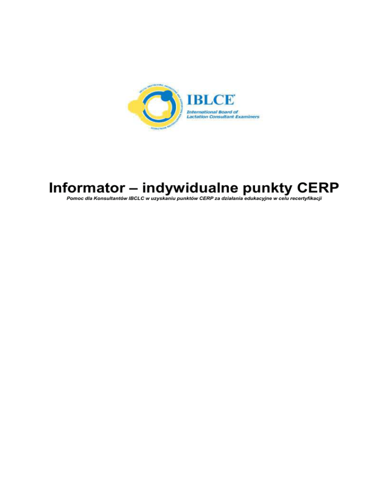 Informator – indywidualne punkty CERP Pomoc dla Konsultantów IBCLC w uzyskaniu punktów CERP za działania edukacyjne w celu recertyfikacji Spis Treści Czym jest rada IBLCE ………………………………………………… Dane kontaktowe…………………….……….………………………... Cel składania indywidualnych wniosków o zatwierdzenie punktów CERP............................................................................... Wykształcenie………………….………………………....................... Publikacje…………………………………………….…....................... Obserwacje kliniczne …………………………………...................... Wymogi dotyczące kontroli.....……………………………………... Wykształcenie…………………………………………. Publikacje……………………………………….……... Obserwacje kliniczne ……………………………….... Wskazówki odnośnie przyznania punktów CERP........................ 3 3 3 3 4 5 5 5 5 6 7 Copyright © 2016-17 International Board of Lactation Consultant Examiners. All rights reserved. Informator – indywidualne punkty CERP 31 Lipca 2016 strona 2 z 7 Czym jest rada IBLCE®? IBLCE®, lub Międzynarodowa Rada Egzaminatorów na Konsultanta (ang. the International Board of Lactation Consultant Examiners), jest niezależnym organem międzynarodowym, który przyznaje kwalifikacje na Międzynarodowego Certyfikowanego Konsultanta Laktacyjnego ( ang. The International Board Certified Lactation Consultant, IBCLC®). Dane kontaktowe International Board of Lactation Consultant Examiners (IBLCE) 10301 Democracy Lane, Suite 400 Fairfax,VA 22030-2545 USA telefon: 703-560-7330 faks: 703-560-7332 www.iblce.org IBLCE posiada biura w Austrii, Australii oraz Stanach Zjednocznych. Można skontaktować sie z biurem, któremu podlega kraj zamieszkania wykorzystując formularz “Kontakt z IBLCE” znajdujący się na stronie internetowej IBLCE. Cel składania indywidualnych wniosków o zatwierdzenie punktów CERP Konsultant IBCLC może przedłożyć IBLCE działania w sferze kształcenia, które jeszcze nie zostały uznane przez IBLC. Ten poradnik ma pomóc osobom, które posiadają certyfikaty IBCLC, uzyskać zatwierdzenie punktów CERP za 3 rodzaje działań edukacyjnych; wykształcenie, publikacje oraz obserwacje kliniczne. Wszelkie przyznane punkty CERP mogą zostać wykorzystywane przez osoby posiadające certyfikaty IBCLC w celu Recertyfikacji. Poszczególne wnioski o zatwierdzenie punktów CERP muszą zostać złożone w tym samym czasie, co wnioski o Recertyfikacje przez system punktowy CERP. Uwaga: Kształcenie dające prawo do uzyskania punktów CERP musi dotyczyć zagadnień zamieszczonych w Szczegółowym Wykazie Treści IBLCE (IBLCE Detailed Content Outline). Wykształcenie Osoby posiadające certyfikat IBCLC mogą dostarczyć do zatwierdzenia w ramach systemu punktacji CERPs pięć (5) różnych typów wykształcenia. • Wykształcenie , które zostało zatwierdzone przez inną radę lub organizację w celu uzyskania punktów zaliczeniowych do kontynuowania edukacji o 1 punkt CERP za każde 60 minut nauki • Przy zrobieniu prezentacji po raz pierwszy, prelegenci mogą uzyskać punkty CERP za przygotowanie prezentacji Copyright © 2016-17 International Board of Lactation Consultant Examiners. All rights reserved. Informator – indywidualne punkty CERP 31 Lipca 2016 strona 3 z 7 • • • o 2 punkty CERP za każde 60 minut nauki Kształcenie w miejscu pracy zapewnione przez pracodawców o 1 punkt CERP za każde 60 minut nauki Niezależne moduły szkoleniowe lub kształcenie na odległość zatwierdzone w celu zdobycia zaliczenia przez inną radę lub organizację o Punkty CERP oparte są na liczbie opublikowanych punktów zaliczeniowych w kształceniu ciągłym Studia licencjackie lub studia magisterskie o Maksymalnie 25 punktów CERP w jednym semestrze (10 tygodni lub dłużej) za przedmiot kierunkowy na Studiach licencjackich lub studiach magisterskich w ramach programu studiów. Proporcjonalnie mogą być przyznane punkty za krótsze studia magisterskie lub licencjackie. Publikacje Osoby posiadające certyfikat IBCLC mogą złożyć pięć (5) różnych typów publikacji do zatwierdzenia w ramach systemu punktacji CERP. Wszystkie publikacje muszą być znaczące dla zagadnień laktacji i karmienia piersią. Żadne inne tematy nie mogą zostać przedłożone do zatwierdzenia w ramach systemu punktacji CERP. • Streszczenie, rozdział lub artykuł opublikowany w renomowanym czasopiśmie* lub wydanej książce o 15 punktów L-CERP • Praca magisterska lub rozprawa doktorska o 75 punktów L-CERP • Prezentacja plakatu o 5 punktów L-CERP • Wideo dla pracowników służby zdrowia o 5 punktów L-CERP • Nowatorski, sfinalizowany zbiór zasad postępowania lub polityk szpitalnych o 5 punktów L-CERPs *Renomowane czasopismo: renomowane czasopismo jest czasopismem drukowanym lub czasopismem internetowym korzystającym z niezależnych recenzentów, którymi są eksperci merytoryczni z branży. W przypadku artykułów dostarczonych do punktacji CERP, tymi niezależnymi recenzentami powinni być eksperci w zakresie laktacji i karmienia piersią. Ich doświadczenie może być poświadczone poprzez referencje, autorstwo lub renomę; dla przykładu, IBCLC jest uznawana za eksperta tematu karmienia piersią. Niezależni recenzenci nie są członkami redakcji czasopisma, nie powinni posiadać stanowisk kierowniczych w organizacji lub stowarzyszeniu, która wydaje czasopismo. Eksperci merytoryczni to specjaliści, którzy mają doświadczenie w tej dziedzinie. Na przykład list do redaktora naczelnego lub autorstwo recenzji książki nie kwalifikuje się do CERPs. Copyright © 2016-17 International Board of Lactation Consultant Examiners. All rights reserved. Informator – indywidualne punkty CERP 31 Lipca 2016 strona 4 z 