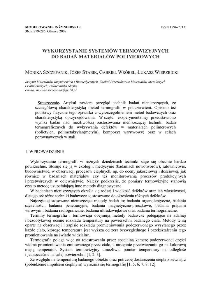 MODELOWANIE INśYNIERSKIE 36, s. 279-286, Gliwice 2008 ISSN 1896-771X WYKORZYSTANIE SYSTEMÓW TERMOWIZYJNYCH DO BADAŃ MATERIAŁÓW POLIMEROWYCH MONIKA SZCZEPANIK, JÓZEF STABIK, GABRIEL WRÓBEL, ŁUKASZ WIERZBICKI Instytut Materiałów InŜynierskich i Biomedycznych, Zakład Przetwórstwa Materiałów Metalowych i Polimerowych, Politechnika Śląska e-mail: [email protected] Streszczenie. Artykuł zawiera przegląd technik badań nieniszczących, ze szczegółową charakterystyką metod termografii w podczerwieni. Opisano teŜ podstawy fizyczne tego zjawiska z wyszczególnieniem metod badawczych oraz charakterystyką oprzyrządowania. W części eksperymentalnej przedstawiono wyniki badań nad moŜliwością zastosowania nieniszczącej techniki badań termograficznych do wykrywania defektów w materiałach polimerowych (polietylen, polimetakrylan(metylu), kompozyt warstwowy) oraz w celach porównawczych w stali. 1. WPROWADZENIE Wykorzystanie termografii w róŜnych dziedzinach techniki staje się obecnie bardzo powszechne. Stosuje się ją w ekologii, medycynie (badaniach nowotworów), ratownictwie, budownictwie, w obserwacji procesów cieplnych, np. do oceny jakościowej i ilościowej, jak równieŜ w badaniach materiałów czy teŜ monitorowania procesów produkcyjnych i przetwórczych w odlewnictwie. NaleŜy podkreślić, Ŝe pomiary termowizyjne stanowią często metodę uzupełniającą inne metody diagnostyczne. W badaniach nieniszczących określa się rodzaj i wielkość defektów oraz ich właściwości, dlatego teŜ róŜne techniki badawcze są stosowane do określenia róŜnych defektów. Najczęściej stosowane nieniszczące metody badań to: badania organoleptyczne, badania szczelności, badania penetracyjne, badania magnetyczno-proszkowe, badania prądami wirowymi, badania radiograficzne, badania ultradźwiękowe oraz badania termograficzne. Terminy termografia i termowizja obejmują metody badawcze polegające na zdalnej i bezdotykowej ocenie rozkładu temperatury na powierzchni badanego ciała. Metody te są oparte na obserwacji i zapisie rozkładu promieniowania podczerwonego wysyłanego przez kaŜde ciało, którego temperatura jest wyŜsza od zera bezwzględnego i przekształceniu tego promieniowania na światło widzialne. Termografia polega więc na rejestrowaniu przez specjalną kamerę podczerwonej części widma promieniowania emitowanego przez ciało, a następnie przetwarzaniu go na kolorową mapę temperatur. System termowizyjny umoŜliwia pomiar temperatury na odległość i jednocześnie na całej powierzchni [1, 2, 3]. Ze względu na temperaturę badanego obiektu oraz potrzebę dostarczenia ciepła z zewnątrz (pobudzenie impulsem cieplnym) wyróŜnia się termografię [1, 5, 6, 7, 8, 12]: 280 M. SZCZEPANIK, J. STABIK, G. WRÓBEL, Ł. WIERZBICKI pasywną – gdzie obserwujemy promieniowanie emitowane przez badany obiekt, niepobudzany zewnętrznym źródłem promieniowania cieplnego. MoŜliwe jest zastosowanie tej metody tylko do obserwacji obiektów o temperaturze róŜniącej się od otoczenia w znacznym stopniu, pozwalającym na wykonanie badań i późniejsze analizowanie promieniowania pochodzącego od badanego obiektu, aktywną – której istotą jest badanie termicznej odpowiedzi materiału w funkcji czasu na stymulację zewnętrznym impulsem ciepła i ta odpowiedź jest rejestrowana za pomocą termografu. W zaleŜności od sposobu stymulacji rozróŜnia się kilka rodzajów termografii aktywnej, a mianowicie, termografię: - impulsową (pulsed thermography) uwaŜaną za stosunkowo prosty rodzaj termografii aktywnej. Polega ona na wyznaczeniu i analizie rozkładu temperatury na badanej powierzchni w czasie jej stygnięcia po uprzednim równomiernym nagrzaniu impulsem cieplnym [8, 9, 10, 12]; - modulacyjną (lock-in thermography with modulated heating) wykorzystującą teorię fal termicznych. Fale termiczne są generowane przez nagrzewanie badanej powierzchni źródłem ciepła, którego natęŜenie zmienia się sinusoidalnie. Za pomocą termografu podczerwieni wyznacza się oscylujące pole temperatury na powierzchni badanego obiektu w stanie ustalonym. Sekwencja czasowa pól temperatury pozwala odtworzyć postać fali termicznej na badanej powierzchni, co umoŜliwia wyznaczenie przesunięcia fazy tej fali względem oscylacji źródła ciepła. Otrzymuje się mapę przesunięć fazowych. Przesunięcie fazowe, przy zadanej częstotliwości, jest funkcją dyfuzyjności wady w warstwie powierzchniowej materiału [9,10, 11]: - impulsowo-fazową (pulsed phase thermography) łączy zalety termografii impulsowej i modulacyjnej. Podobnie jak w metodzie termografii impulsowej powierzchnia badanego obiektu jest stymulowana impulsem ciepła i za pomocą termografu podczerwieni rejestruje się rozkład temperatury na badanej powierzchni w czasie jej stygnięcia. Zarejestrowany sygnał, w postaci zaleŜności temperatury od czasu T(t) w poszczególnych punktach powierzchni podczas stygnięcia, zostaje poddany dyskretnej transformacji Fouriera [9]. 2.BADANIA WŁASNE 2.1. Badane materiały Przeprowadzono badania termograficzne na 12 próbkach z materiałów polimerowych oraz na 4 próbkach ze stali. Badane materiały przedstawiono na rys.1. Polietylen Polimetakrylan metylu Laminat Stal Rys.1. Przygotowane próbki do badań Z kaŜdego materiału wykonano po cztery próbki w kształcie prostopadłościanu o wymiarach 23,5x35x150 mm. Następnie w trzech próbkach wykonano sztuczne defekty w postaci otworów przelotowych o róŜnej średnicy z przedziału φ2 mm ÷ φ10 mm w odległości 3 mm od badanej powierzchni oraz ok. 30 mm od kolejnego defektu (otworu) na tej próbce. Czwarta próbka z kaŜdego materiału posiadała wyłącznie otwory o średnicy 5 mm, usytuowane na przekroju próbki tak, by ich odległość od badanej powierzchni wzrastała. WYKORZYSTANIE SYSTEMÓW TERMOWIZYJNYCH DO BADAŃ MATERIAŁÓW… 281 Taka lokalizacja nieciągłości umoŜliwia sprawd