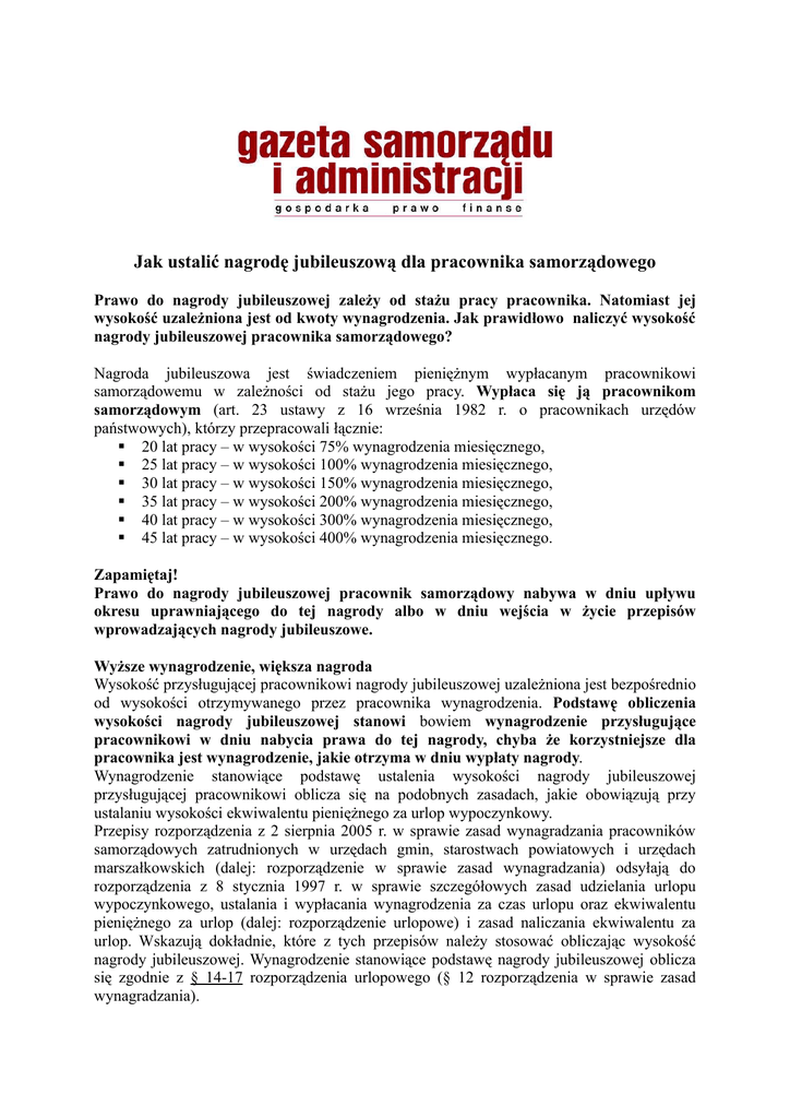 Jak ustalić nagrodę jubileuszową dla pracownika samorządowego Prawo do nagrody jubileuszowej zależy od stażu pracy pracownika. Natomiast jej wysokość uzależniona jest od kwoty wynagrodzenia. Jak prawidłowo naliczyć wysokość nagrody jubileuszowej pracownika samorządowego? Nagroda jubileuszowa jest świadczeniem pieniężnym wypłacanym pracownikowi samorządowemu w zależności od stażu jego pracy. Wypłaca się ją pracownikom samorządowym (art. 23 ustawy z 16 września 1982 r. o pracownikach urzędów państwowych), którzy przepracowali łącznie: 20 lat pracy – w wysokości 75% wynagrodzenia miesięcznego, 25 lat pracy – w wysokości 100% wynagrodzenia miesięcznego, 30 lat pracy – w wysokości 150% wynagrodzenia miesięcznego, 35 lat pracy – w wysokości 200% wynagrodzenia miesięcznego, 40 lat pracy – w wysokości 300% wynagrodzenia miesięcznego, 45 lat pracy – w wysokości 400% wynagrodzenia miesięcznego. Zapamiętaj! Prawo do nagrody jubileuszowej pracownik samorządowy nabywa w dniu upływu okresu uprawniającego do tej nagrody albo w dniu wejścia w życie przepisów wprowadzających nagrody jubileuszowe. Wyższe wynagrodzenie, większa nagroda Wysokość przysługującej pracownikowi nagrody jubileuszowej uzależniona jest bezpośrednio od wysokości otrzymywanego przez pracownika wynagrodzenia. Podstawę obliczenia wysokości nagrody jubileuszowej stanowi bowiem wynagrodzenie przysługujące pracownikowi w dniu nabycia prawa do tej nagrody, chyba że korzystniejsze dla pracownika jest wynagrodzenie, jakie otrzyma w dniu wypłaty nagrody. Wynagrodzenie stanowiące podstawę ustalenia wysokości nagrody jubileuszowej przysługującej pracownikowi oblicza się na podobnych zasadach, jakie obowiązują przy ustalaniu wysokości ekwiwalentu pieniężnego za urlop wypoczynkowy. Przepisy rozporządzenia z 2 sierpnia 2005 r. w sprawie zasad wynagradzania pracowników samorządowych zatrudnionych w urzędach gmin, starostwach powiatowych i urzędach marszałkowskich (dalej: rozporządzenie w sprawie zasad wynagradzania) odsyłają do rozporządzenia z 8 stycznia 1997 r. w sprawie szczegółowych zasad udzielania urlopu wypoczynkowego, ustalania i wypłacania wynagrodzenia za czas urlopu oraz ekwiwalentu pieniężnego za urlop (dalej: rozporządzenie urlopowe) i zasad naliczania ekwiwalentu za urlop. Wskazują dokładnie, które z tych przepisów należy stosować obliczając wysokość nagrody jubileuszowej. Wynagrodzenie stanowiące podstawę nagrody jubileuszowej oblicza się zgodnie z § 14-17 rozporządzenia urlopowego (§ 12 rozporządzenia w sprawie zasad wynagradzania). Przy naliczaniu wysokości nagród jubileuszowych wynagrodzenie stanowiące ich podstawę oblicza się uwzględniając takie składniki wynagrodzenia pracownika, jakie brane są pod uwagę przy naliczaniu wysokości ekwiwalentu za niewykorzystany urlop wypoczynkowy tego pracownika. Przy obliczaniu ekwiwalentu (czyli podstawy nagrody jubileuszowej) uwzględnia się składniki wynagrodzenia jak przy naliczaniu wynagrodzenia urlopowego (§14 rozporządzenia urlopowego). W celu ustalenia wysokości wynagrodzenia urlopowego pracownika (wysokości wynagrodzenia będącego podstawą nagrody jubileuszowej), uwzględnia się wynagrodzenie przysługujące pracownikowi wraz z innymi świadczeniami ze stosunku pracy. Wyjątek stanowią (§ 6 rozporządzenia urlopowego): jednorazowe lub nieperiodyczne wypłaty za spełnienie określonego zadania bądź za określone osiągnięcie, wynagrodzenie za czas gotowości do pracy oraz za czas niezawinionego przez pracownika przestoju, nagrody jubileuszowe, wynagrodzenie za czas urlopu wypoczynkowego, a także za czas innej usprawiedliwionej nieobecności w pracy, ekwiwalent pieniężny za urlop wypoczynkowy, dodatkowe wynagrodzenie radcy prawnego z tytułu zastępstwa sądowego, wynagrodzenie za czas niezdolności do pracy wskutek choroby lub odosobnienia w związku z chorobą zakaźną, nagrody z zakładowego funduszu nagród, dodatkowe wynagrodzenie roczne, odprawy emerytalne lub rentowe albo inne odprawy pieniężne, wynagrodzenia i odszkodowania przysługujące w razie rozwiązania stosunku pracy. Składniki wynagrodzenia uwzględniane w jubileuszówce Składniki wynagrodzenia określone w stawce miesięcznej w stałej wysokości uwzględnia się przy ustalaniu ekwiwalentu (wynagrodzenia będącego podstawą nagrody jubileuszowej) w wysokości należnej w miesiącu nabycia prawa do tego ekwiwalentu oraz nagrody (§ 15 rozporządzenia urlopowego). Uwzględnia się również dodatkowe składniki wynagrodzenia przysługujące za okresy nie dłuższe niż miesiąc, np. comiesięczne premie regulaminowe. Zlicza się średnią premii z 3 miesięcy poprzedzających miesiąc wypłaty odprawy. Jeśli wysokość takiej premii znacznie różni się w poszczególnych miesiącach, przy ustalaniu wysokości odprawy można uwzględniać premie w łącznej wysokości wypłaconej pracownikowi w okresie nieprzekraczającym 12 miesięcy kalendarzowych poprzedzających miesiąc nabycia prawa do odprawy (§ 16 rozporządzenia urlopowego). Składniki wynagrodzenia przysługujące pracownikowi za okresy dłuższe niż miesiąc, wypłacone w okresie 12 miesięcy bezpośrednio poprzedzających miesiąc nabycia prawa do ekwiwalentu (nagrody jubileuszowej), uwzględnia się przy średniej wysokości z tego okresu (§ 17 rozporządzenia urlopowego). Są to jedyne przepisy z rozporządzenia urlopowego stosowane przy obliczaniu ekwiwalentu za urlop, które należy wziąć pod uwagę przy obliczaniu wysokości wynagrodzenia będącego podstawą nagrody jubileuszowej. Nie ma żadnych podstaw do stosowania przy ustalaniu wysokości nagród jubileuszowych współczynnika ekwiwalentowego. Jak obliczyć wysokość nagrody Przy obliczaniu podstawy nagrody jubileuszowej nie korzysta się ze współczynnika ekwiwalentowego. Ustala się tylko wynagrodzenie czyli podstawę nagrody, uwzględ