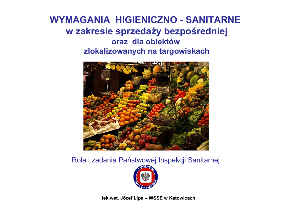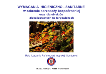 WYMAGANIA HIGIENICZNO - SANITARNE w zakresie sprzedaży bezpośredniej oraz dla obiektów zlokalizowanych na targowiskach Rola i zadania Państwowej Inspekcji Sanitarnej lek.wet. Józef Lipa – WSSE w Katowicach Targowisko/plac targowy/miejsce wyznaczone Producenci/zbieracze w ramach dostaw bezpośrednich Podmioty/zakłady/osoby fiz. w ramach działalności gospodarczej A A1 Stacjonarne B B1 Ruchome Wymagania w stosunku do targowiska stałego (placu) Odp. organizatora/ prowadzącego/ władz samorządowych itp. Rozporządzenie Ministra Rolnictwa i Rozwoju Wsi z dn.1.07.2011r. Zmieniające rozporządzenie w sprawie szczegółowych warunków i trybu przyznawania oraz wypłat pomocy finansowej(…) (Dz.U. Nr 142, poz. 833) (Załącznik) Tymczasowe Wymagania w stosunku do obiektów zlokalizowanych Odp. operatora żywności Wymagania sanitarne dla terenu przewidzianego pod lokalizację i warunki zagospodarowania targowiska • Lokalizacja powinna być zgodna z miejscowym planem zagospodarowania przestrzennego, • Plac targowiskowy powinien być utwardzony, odpowiednio wyprofilowany dla umożliwienia odpływu wód opadowych, a sposób odprowadzenia tych wód zależny od warunków miejscowych i zgodny z wymaganiami ustawy Prawo wodne, • Należy zapewnić utwardzone dojścia i dojazdy do targowiska, (ew. miejsca parkingowe), • Zapewnić przyłączenie do sieci wodociągowej, kanalizacyjnej,* elektroenergetycznej. • Wyznaczone , odpowiednio zlokalizowane i urządzone miejsce do gromadzenia odpadów i śmieci z uwzględnieniem ich segregacji,* • Obiekt zawierający pomieszczenie porządkowe na sprzęt i środki do utrzymania czystości na targowisku, umywalnie i ustępy dla sprzedawców i klientów, w tym wydzielone ustępy dla osób sprzedających artykuły spożywcze, ewentualne miejsce pobytu dla obsługi targowiska (obiekt ten powinien mieć doprowadzoną bieżącą wodę i być skanalizowany), • Wyznaczone odpowiednio zlokalizowane i urządzone miejsca dla przewidywanych zgodnie z regulaminem targowiska rodzajów handlu : A) artykułami spożywczymi w stałych, krytych pomieszczeniach, B) artykułami spożywczymi ze stoisk ruchomych lub tymczasowych C) artykułami przemysłowymi D) roślinnami (kwiaty, sadzonki, drzewka owocowe), E) żywymi zwierzętami. min. 50% Poszczególne obiekty na terenie targowiska powinny spełniać odpowiednie wymagania techniczne. * (*)Rozporządzenia Ministra Infrastruktury z dn. 12.04.2002r. w sprawie warunków technicznych jakim powinny odpowiadać budynki i ich usytuowanie. (Dz.U. Nr 75 poz.690) Ustawa z dn. 7.06.2001r. O zbiorowym zaopatrzeniu w wodę i odprowadzeniu ścieków (j.t. Dz.U. z 2006r. Nr 123 poz.858) Ustawa z dn. 13.09.1996r. O utrzymaniu czystości i porządku w gminach (j.t. Dz.U.z 2005r. Nr 236 poz 2008) Ustawa z dn. 27.04.2001r. O odpadach (j.t. Dz.U.z 2010r. Nr 185 poz 1243) WYMAGANIA OGÓLNE DLA OBIEKTÓW FORMALNO-PRAWNE USTAWA z dnia 25 sierpnia 2006 r. o bezpieczeństwie żywności i żywienia j.t.Dz.U.10.136.914 z późn. zm. Art. 63.1 Zakłady o których mowa w art. 61, mogą rozpocząć działalność po zatwierdzeniu lub warunkowym zatwierdzeniu, a w przypadkach określonych w ust. 2, po uzyskaniu wpisu do rejestru zakładów*. 1) podmiotów działających na rynku spożywczym prowadzących produkcję pierwotną i działalności w zakresie dostaw bezpośrednich 2) obiektów lub urządzeń ruchomych lub tymczasowych, uprzednio dopuszczonych do prowadzenia działalności gospodarczej w zakresie produkcji lub obrotu żywnością w innym państwie członkowskim Unii Europejskiej 3) przedsiębiorców prowadzących sprzedaż detaliczną innych niż środki spożywcze produktów oraz wprowadzających do obrotu środki spożywcze opakowane, trwałe mikrobiologicznie Art. 62. 1. Właściwy ze względu na siedzibę zakładu lub miejsce prowadzenia* przez zakład działalności państwowy powiatowy inspektor sanitarny 1) prowadzi rejestr zakładów podlegających urzędowej kontroli organów PIS (…) 2) wydaje decyzje w sprawie zatwierdzenia (…) 3) wydaje decyzje o wykreśleniu z rejestru zakładów 4) wydaje zaświadczenie o wpisie do rejestru zakładów Art. 64.1 Podmioty działające na rynku spożywczym lub na rynku materiałów i wyrobów przeznaczonych do kontaktu z żywnością składają wniosek o wpis do rejestru zakładów albo o zatwierdzenie zakładu i o wpis do rejestru zakładów, z terminie co najmniej 14 dni przed dniem rozpoczęcia planowanej działalności w formie pisemnej, wg określonych wzorów. Art. 103.1 Kto 4) Prowadzi działalność w zakresie produkcji lub obrotu żywnością bez złożenia wniosku o wpis (…) lub o zatwierdzenie zakładu i wpis do rejestru zakładów (…) podlega karze pieniężnej. Wysokość kary pieniężnej może być wymierzona do 5000 zł, nie mniej niż 1000 zł. WYMAGANIA SZCZEGÓŁOWE DOTYCZĄCE ZAKŁADÓW (POMIESZCZENIA / SPRZĘT / ZAPLECZE) A Załącznik II ROZDZIAŁ I WYMAGANIA DOTYCZĄCE POMIESZCZEŃ ŻYWNOŚCIOWYCH (INNYCH NIŻ WYMIENIONE W ROZDZIALE III) / obiekty stacjonarne / ROZPORZĄDZENIE (WE) NR 852/2004 PARLAMENTU EUROPEJSKIEGO I RADY B z dnia 29 kwietnia 2004 r. Załącznik II ROZDZIAŁ III w sprawie higieny środków spożywczych / obiekty ruchome i tymczasowe / (Dz.U.UE L z dnia 30 kwietnia 2004 r.) Wszystkie przypadki za wyjątkiem bezpośrednich dostaw, dokonywanych przez producenta, małych ilości surowców do konsumenta końcowego(….); A1 i B1 ROZPORZĄDZENIE MINISTRA ZDROWIA z dnia 6 czerwca 2007 r. w sprawie dostaw bezpośrednich środków spożywczych (Dz.U.07.112.774 z dnia 27 czerwca 2007 r.) POZOSTAŁE WYMAGANIA HIGIENICZNO-SANITARNE (PERSONEL / INNE) Załącznik II ROZDZIAŁ IV WYMAGANIA DOTYCZĄCE SPECYFICZNYCH TOWARÓW/ RODZAJÓW ŻYWNOŚCI WYMAGANIA DOTYCZĄCE TRANSPORTU ROZDZIAŁY V-XII WYMAGANIA DOTYCZĄCE m.in.: - Zaopatrzenia w wodę - Higieny personelu - Usuwania odpadów USTAWA z dnia 25 sierpnia 2006 r. o bezpieczeństwie żywności i ży