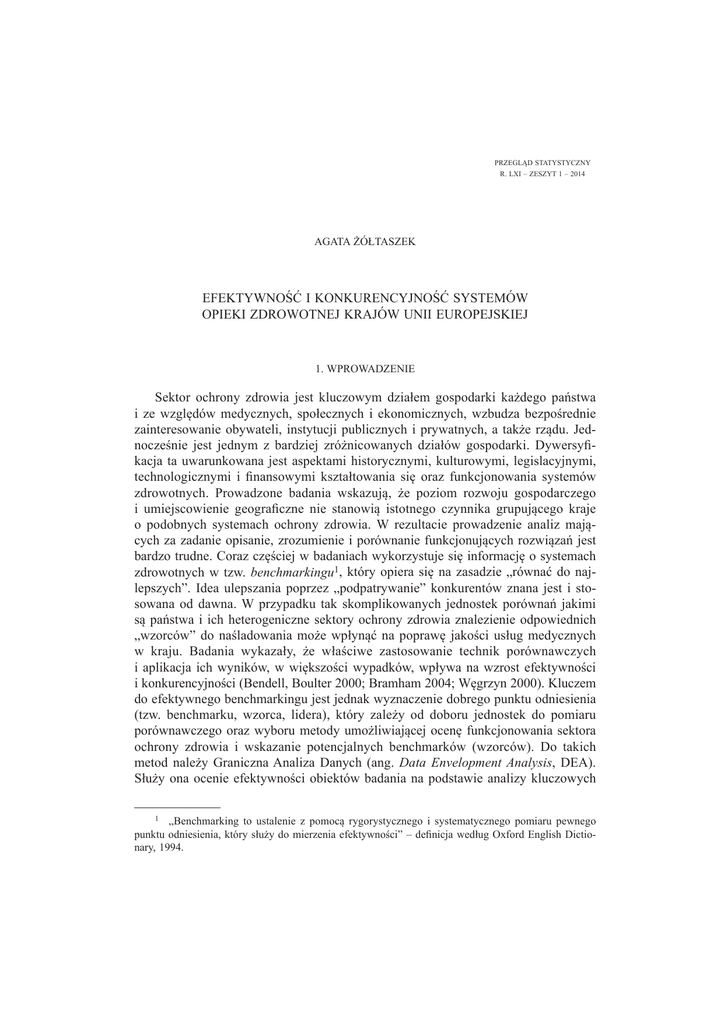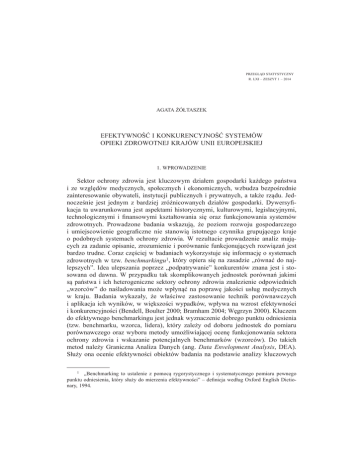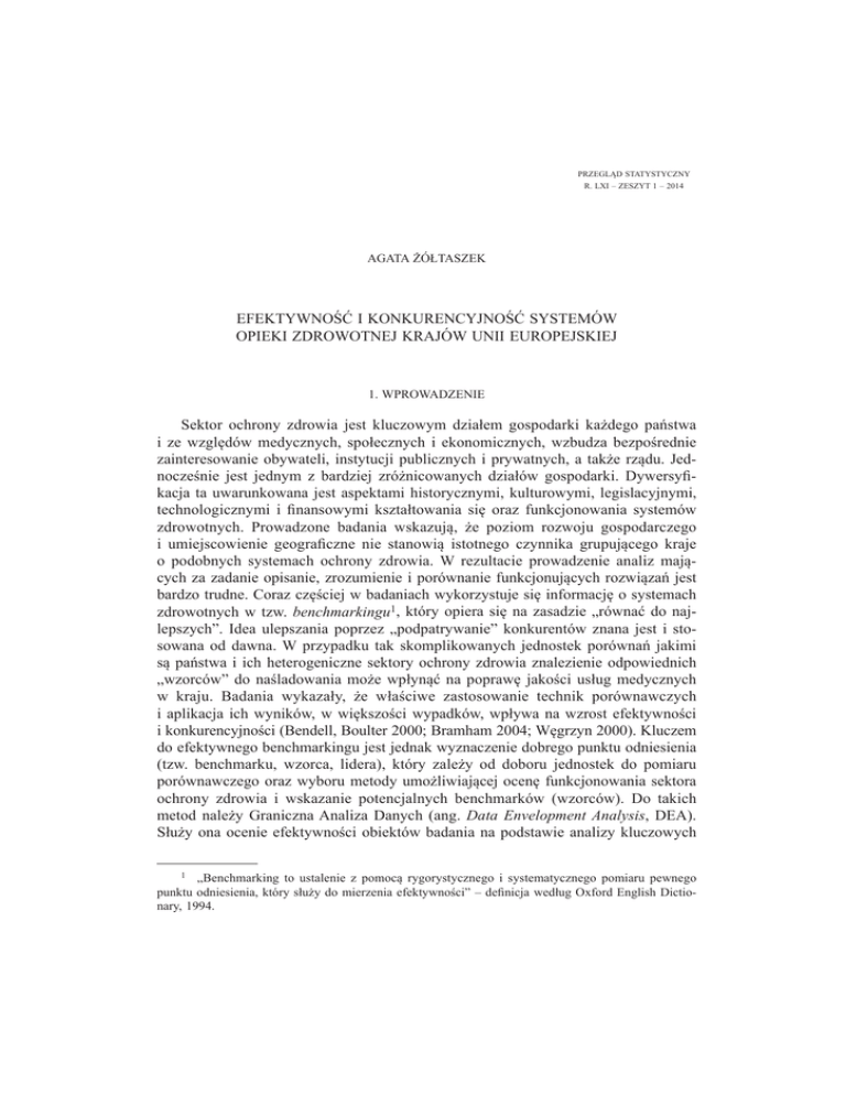 PRZEGLĄD STATYSTYCZNY R. LXI – ZESZYT 1 – 2014 AGATA ĩÓàTASZEK EFEKTYWNOĝû I KONKURENCYJNOĝû SYSTEMÓW OPIEKI ZDROWOTNEJ KRAJÓW UNII EUROPEJSKIEJ 1. WPROWADZENIE Sektor ochrony zdrowia jest kluczowym dziaáem gospodarki kaĪdego paĔstwa i ze wzglĊdów medycznych, spoáecznych i ekonomicznych, wzbudza bezpoĞrednie zainteresowanie obywateli, instytucji publicznych i prywatnych, a takĪe rządu. JednoczeĞnie jest jednym z bardziej zróĪnicowanych dziaáów gospodarki. Dywersy¿kacja ta uwarunkowana jest aspektami historycznymi, kulturowymi, legislacyjnymi, technologicznymi i ¿nansowymi ksztaátowania siĊ oraz funkcjonowania systemów zdrowotnych. Prowadzone badania wskazują, Īe poziom rozwoju gospodarczego i umiejscowienie geogra¿czne nie stanowią istotnego czynnika grupującego kraje o podobnych systemach ochrony zdrowia. W rezultacie prowadzenie analiz mających za zadanie opisanie, zrozumienie i porównanie funkcjonujących rozwiązaĔ jest bardzo trudne. Coraz czĊĞciej w badaniach wykorzystuje siĊ informacjĊ o systemach zdrowotnych w tzw. benchmarkingu1, który opiera siĊ na zasadzie „równaü do najlepszych”. Idea ulepszania poprzez „podpatrywanie” konkurentów znana jest i stosowana od dawna. W przypadku tak skomplikowanych jednostek porównaĔ jakimi są paĔstwa i ich heterogeniczne sektory ochrony zdrowia znalezienie odpowiednich „wzorców” do naĞladowania moĪe wpáynąü na poprawĊ jakoĞci usáug medycznych w kraju. Badania wykazaáy, Īe wáaĞciwe zastosowanie technik porównawczych i aplikacja ich wyników, w wiĊkszoĞci wypadków, wpáywa na wzrost efektywnoĞci i konkurencyjnoĞci (Bendell, Boulter 2000; Bramham 2004; WĊgrzyn 2000). Kluczem do efektywnego benchmarkingu jest jednak wyznaczenie dobrego punktu odniesienia (tzw. benchmarku, wzorca, lidera), który zaleĪy od doboru jednostek do pomiaru porównawczego oraz wyboru metody umoĪliwiającej ocenĊ funkcjonowania sektora ochrony zdrowia i wskazanie potencjalnych benchmarków (wzorców). Do takich metod naleĪy Graniczna Analiza Danych (ang. Data Envelopment Analysis, DEA). SáuĪy ona ocenie efektywnoĞci obiektów badania na podstawie analizy kluczowych 1 „Benchmarking to ustalenie z pomocą rygorystycznego i systematycznego pomiaru pewnego punktu odniesienia, który sáuĪy do mierzenia efektywnoĞci” – de¿nicja wedáug Oxford English Dictionary, 1994. 80 Agata ĩóátaszek nakáadów i efektów ich funkcjonowania. W zaleĪnoĞci od konstrukcji badania metodą DEA moĪna analizowaü efektywnoĞü: • alokacyjną, która oznacza wáaĞciwe rozdysponowanie posiadanych, ograniczonych zasobów pomiĊdzy jednostki tak, by przyznaü najwiĊksze ich iloĞci tym produktom i usáugom, które są najbardziej poĪądane przez klientów; • techniczną, która skupia siĊ na relacji wielkoĞci nakáadów i wyników poprzez optymalizacjĊ technologii produkcji moĪliwej do osiągniĊcia przez instytucjĊ w danych warunkach; • ekonomiczną, która dąĪy do maksymalizacji zysku lub minimalizacji kosztów, uwzglĊdniając ceny rynkowe nakáadów i efektów; poprzez minimalizacje nakáadów przy danym poziomie efektów lub maksymalizacjĊ efektów przy okreĞlonych nakáadach (ĩóátaszek, 2008). Metoda DEA to podejĞcie nieparametryczne nie wymagające kwanty¿kacji postaci zaleĪnoĞci pomiĊdzy zmiennymi nakáadów i wyników, w którym kaĪdy z obiektów poddawany jest oddzielnej analizie. Pozwala ona na badanie efektywnoĞci technicznej N obiektów, zwanych równieĪ DMU (ang. Decision Making Unit), pod wzglĊdem M nakáadów i S efektów. W rezultacie wyznaczane są (1) wspóáczynniki efektywnoĞci pozwalające sklasy¿kowaü wszystkie obiekty jako relatywnie (w odniesieniu do innych jednostek badania) efektywne lub nie, i (2) Ĩródáa nieefektywnoĞci. Ponadto metoda DEA nie stawia ograniczeĔ co do charakteru zmiennych, zatem nakáady i wyniki mogą byü wyraĪone na skali pomiarowej porządkowej, przedziaáowej lub ilorazowej oraz mieü charakter absolutny lub wzglĊdny, wyraĪony w dowolnych jednostkach. Celem artykuáu jest analiza efektywnoĞci technicznej oraz poĞrednio takĪe konkurencyjnoĞci systemów opieki zdrowotnej w krajach Unii Europejskiej. Do badania zastosowano optymalizacyjną metodĊ Granicznej Analizy Danych (DEA). W prowadzonym badaniu uwzglĊdnione zostaáy zmienne dwóch nakáadów (liczba lekarzy, wydatki publiczne na opiekĊ zdrowotną) oraz dwóch wyników (odsetek populacji, której popyt na badania specjalistyczne i usáugi medyczne zostaá zaspokojony, oczekiwana dalsza dáugoĞü trwania Īycia). Uzyskane rezultaty powinny okazaü siĊ skuteczne w ocenie efektywnoĞci i konkurencyjnoĞci zróĪnicowanych systemów opieki zdrowotnej w krajach Unii Europejskiej oraz wskazaü potencjalne moĪliwoĞci poprawy sytuacji w paĔstwach o nieefektywnym i niekonkurencyjnym sektorze ochrony zdrowia. 2. SYSTEMY OCHRONY ZDROWIA W PAēSTWACH UE W rozumieniu ĝwiatowej Organizacji Zdrowia (ang. World Health Organization, WHO) zdrowie to caákowity brak choroby i kalectwa oraz stan dobrostanu ¿zycznego, umysáowego i spoáecznego. Jest ono dobrem bezcennym dla kaĪdego czáowieka, jednak związane z nim Ğwiadczenia mają wartoĞü rynkową. System ochrony zdrowia to ogóá zorganizowanych dziaáaĔ zapewniających spoáeczeĔstwu opiekĊ zdrowotną ludnoĞci. ĝwiadczenia pro¿laktyczno-lecznicze i rehabilitacyjne realizowane są z wyko- EfektywnoĞü i konkurencyjnoĞü systemów opieki zdrowotnej krajów Unii Europejskiej 81 rzystaniem zasobów ¿nansowych, materialnych i norm prawnych (Nojszewska, 2011; Suchecka, 1998). Bardzo istotnym elementem istniejących systemów jest sposób ¿nasowania opieki zdrowotnej. Usáugi medyczne mogą byü pokrywane z dwóch podstawowych Ĩródeá: publicznych i prywatnych. Finansowanie publiczne pochodzi gáównie z podatków krajowych i lokalnych oraz z obowiązkowych ubezpieczeĔ zdrowotnych, czasami zarządza