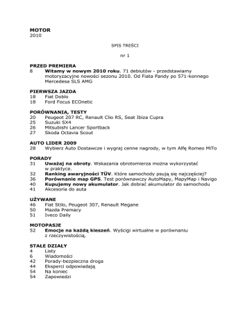 MOTOR 2010 SPIS TREŚCI nr 1 PRZED PREMIERA 8 Witamy w nowym 2010 roku. 71 debiutów - przedstawiamy motoryzacyjne nowości sezonu 2010. Od Fiata Pandy po 571-konnego Mercedesa SLS AMG PIERWSZA JAZDA 18 Fiat Doblo 18 Ford Focus ECOnetic PORÓWNANIA, TESTY 20 Peugeot 207 RC, Renault Clio RS, Seat Ibiza Cupra 25 Suzuki SX4 26 Mitsubishi Lancer Sportback 27 Skoda Octavia Scout AUTO LIDER 2009 28 Wybierz Auto Dostawcze i wygraj cenne nagrody, w tym Alfę Romeo MiTo PORADY 31 UwaŜaj na obroty. Wskazania obrotomierza moŜna wykorzystać w praktyce. 32 Ranking awaryjności TÜV. Które samochody psują się najczęściej? 36 Porównanie map GPS. Test porównawczy AutoMapy, MapyMap i Navigo 40 Kupujemy nowy akumulator. Jak dobrać akumulator do samochodu 41 Akcesoria do auta UśYWANE 46 Fiat Stilo, Peugeot 307, Renault Megane 50 Mazda Premacy 51 Iveco Daily MOTOPASJE 52 Emocje na kaŜdą kieszeń. Wyścigi wirtualne w porównaniu z rzeczywistością. STAŁE DZIAŁY 4 Listy 6 Wiadomości 42 Porady-bezpieczna droga 44 Eksperci odpowiadają 54 Na koniec 54 Zapowiedzi nr 2 PRZED PREMIERA 8 Opel Meriva 10 Trendy 2010. Motoryzacyjna moda, która będzie obowiązywać w tym roku PORÓWNANIA, TESTY 14 Skoda Octavia RS, VW Golf GTD 18 Peugeot 5008 22 Toyota Avensis AUTO LIDER 2009 26 Wybierz Innowacje Techniczną i wygraj cenne nagrody, w tym Alfę Romeo MiTo PORADY 29 Kierowanie ruchem. Kto jest uprawniony do ręcznego kierowania ruchem i jakie sygnały moŜe dawać kierowcom 30 Samochodem na narty. Sprawdzamy przepisy, wymagane dokumenty, ceny paliw i opłaty drogowe związane z wyjazdem za granicę 36 10 wątpliwych prawd w motoryzacji. Nie wszystkie zapewnienia producentów samochodów, części i wyposaŜenia aut są zgodne z prawdą 38 Szkoda całkowita. W przypadku mocno rozbitego samochodu ubezpieczycie! moŜe wypłacić odszkodowanie będące częścią wartości auta?1 UśYWANE 44 Nissan Micra 48 Zła i dobra wersja. Szukamy najmniej i najbardziej udanych wersji silnikowych w siedmiu modelach popularnych marek RAPORT 52 Z ziemi włoskiej do Polski. Przedstawiamy kulisy debiutu na naszym rynku włoskiej marki marzeń - Ferrari STAŁE DZIAŁY 4 Listy 6 Wiadomości 40 Porady-bezpieczna droga 42 Eksperci odpowiadają 54 Na koniec 54 Zapowiedzi nr 3 PRZED PREMIERA 8 Ford Focus 10 Nowości salonu samochodowego w Detroit NOWOŚCI 14 Fiat Sedici, Porsche Boxster Spyder, Toyota Land Cruiser, Volkswagen Golf R RAPORT 16 Zasypani pierwszym standardem. Czy warto płacić miliony za nieskuteczne odśnieŜanie? PORÓWNANIA, TESTY 18 Audi Q7, Land Rover Discovery 22 Citroen Berlingo 1.6 HDi XTR 24 Nissan Qashqai 2.0 i-Way 25 Plus-minus. Co się udało producentom samochodów, a co - nie do końca AUTO LIDER 2009 26 Wybierz Oponę Letnią i Oponę Zimową. Wygraj cenne nagrody, w tym Alfę Romeo MiTo PORADY 29 Obowiązki sprzedającego samochód. Sprzedający musi dopełnić kilku formalności. 30 Wielki test bagaŜników. Sprawdziliśmy, jaka jest rzeczywista pojemność bagaŜników. 36 Mieszanie płynów. Czy płyny eksploatacyjne moŜna mieszać? 38 Wysoka cena zaniedbania. Zwlekanie z naprawami moŜe być kosztowne TECHNIKA 40 Jak działa tempomat. RóŜne rodzaje urządzeń utrzymujących zadaną prędkość UśYWANE 46 VW Golf IV -poradnik kupującego 52 Ile kosztuje roczne utrzymanie auta? Prosta zasada: im nowocześniejszy samochód, tym droŜej STAŁE DZIAŁY 4 Listy 6 Wiadomości 42 Porady-bezpieczna droga 44 Eksperci odpowiadają 54 Na koniec 54 Zapowiedzi nr 4 PRZED PREMIERA 8 Nowości Renault RAPORT 12 Gdy nam Pandy zabraknie... Fiat chce przenieść produkcję Pandy z Polski do Włoch. Jak odbiłoby się to na sytuacji polskiego przemysłu motoryzacyjnego? PORÓWNANIA, TESTY 16 Skoda Superb Combi, VW Passat Variant 20 BMW X1 22 Peugeot 407 Coupe RYNEK 24 Najlepszy wybór. Wybieramy najlepsze naszym zdaniem samochody z trzech segmentów. Które auta miejskie, terenowe i klasy wyŜszej warto kupić? AUTO LIDER 2009 26 Wybierz Reklamę Prasową i wygraj cenne nagrody, w tym Alfę Romeo MiTo PORADY 29 śeby nie ukradli. Tanie, mechaniczne zabezpieczenia antykradzieŜowe 30 Zimowe sposoby. Technika jazdy samochodem zimą 32 Payback: punkty za zakupy. Zasady programu lojalnościowego, do którego naleŜy BP 34 Umyć samochód na sucho? Ekologiczne myjnie, które nie korzystają z wody 36 Pomiar parametrów silnika. Do czego słuŜy hamownia i na jakich zasadach działa 38 Nie kupuj w ciemno. Jak stwierdzić, czy kupowany samochód nie był rozbity UśYWANE 46 Honda Accord 50 Rynek uŜywanych. Porównujemy sytuację rynkową w odniesieniu do najpopularniejszych modeli Opla i Forda. 52 Mitsubishi Space Star STAŁE DZIAŁY 4 Listy 6 Wiadomości 40 Porady-bezpieczna droga 44 Eksperci odpowiadają 54 Na koniec 54 Zapowiedzi nr 5 PRZED PREMIERĄ 10 Nowe auta Mini. Prezentujemy Countrymana - pierwszego miejskiego SUV-a Mini i plany tej prestiŜowej marki na najbliŜszą przyszłość RAPORT 12 Ulubione auta Polaków. Przedstawiamy najpopularniejsze samochody kupowane w Polsce w 2009 roku PORÓWNANIA, TESTY 16 Pięciobój. Auta miejskie. Wybieramy najlepsze auto w popularnym segmencie miejskich maluchów. Porównanie wersji z oszczędnymi dieslami 24 Audi R8 5.2 FSI V10 26 Honda Accord Type-S 2.2 i-DTEC PORADY 29 Mandaty za granicą. Na jakie przepisy warto zwracać uwagę podczas wyjazdu za granicę i jakie kary groŜą za ich nieprzestrzeganie 30 Polski rynek paliw. Na jakich stacjach paliwa nie spełniają norm jakościowych, skąd się biorą ceny benzyny, oleju napędowego i LPG 34 Nie daj się zimie! Uruchomienie silnika samochodu na mrozie moŜe stanowić problem. Podpowiadamy, jak radzić sobie z autem 36 Rocznikowy zawrót głowy. Dealerzy wciąŜ próbują pozbyć się aut z rocznika 2009, stosując róŜne promocje. Czy warto z nich korzystać? 38 Dlaczego ściąga? Ściąganie samochodu podczas jazdy świadczy o usterce podzespołów podwozia lub o problemach z nadwoziem 40 Z nową technologią w
