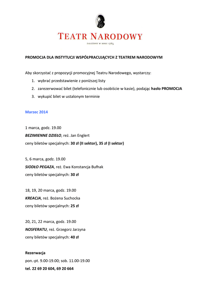 PROMOCJA DLA INSTYTUCJI WSPÓŁPRACUJĄCYCH Z TEATREM NARODOWYM Aby skorzystać z propozycji promocyjnej Teatru Narodowego, wystarczy: 1. wybrać przedstawienie z poniższej listy 2. zarezerwować bilet (telefonicznie lub osobiście w kasie), podając hasło PROMOCJA 3. wykupić bilet w ustalonym terminie Marzec 2014 1 marca, godz. 19.00 BEZIMIENNE DZIEŁO, reż. Jan Englert ceny biletów specjalnych: 30 zł (II sektor), 35 zł (I sektor) 5, 6 marca, godz. 19.00 SIODŁO PEGAZA, reż. Ewa Konstancja Bułhak ceny biletów specjalnych: 30 zł 18, 19, 20 marca, godz. 19.00 KREACJA, reż. Bożena Suchocka ceny biletów specjalnych: 25 zł 20, 21, 22 marca, godz. 19.00 NOSFERATU, reż. Grzegorz Jarzyna ceny biletów specjalnych: 40 zł Rezerwacja pon.-pt. 9.00-19.00; sob. 11.00-19.00 tel. 22 69 20 604, 69 20 664