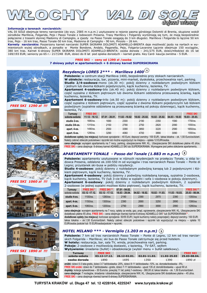 Informacje o terenach narciarskich: VAL DI SOLE obejmuje tereny narciarskie (do wys. 2585 m n.p.m.) usytuowane w rejonie pasma górskiego Dolomiti di Brenta, skupione wokół ośrodków Marilleva, Folgarida, Pejo i Passo Tonale z lodowcem Presena. Trasy Marillevy i Folgaridy wyróżniają się tym, że mają bezpośrednie połączenie z trasami słynnej Madonny di Campiglio, a zjazdy na Passo Tonale osiągają do 3 km długości. Marilleva i Folgarida to łącznie 50 km tras, Pejo - 16 km tras, Passo Tonale-50 km tras, Madonna di Campiglio - 90 km, Pinzolo – 26 km. Karnety narciarskie: Poszerzony karnet narciarski SUPER SKIRAMA DOLOMITI ADAMELLO-BRENTA daje możliwość jazdy na nartach w wymienionych wyżej ośrodkach, a ponadto w Monte Bondone, Andalo, Paganella, Pejo, Folgaria-Lavarone Łącznie obejmuje 150 wyciągów, 380 km tras. Karnet 6-dniowy SUPER SKIRAMA DOLOMITI ADAMELLO-BRENTA: osoba dorosła - 241/275 EUR, dzieci/młodzież do 16 lat 169/193 EUR; seniorzy po 65 r.- 217/248 EUR, dzieci do 8 lat pod opieka dorosłych – karnet gratis. Key Card- kaucja zwrotna - 5 EUR. FREE SKI - ceny od 1290 zł /osoba 7 dniowy pobyt w apartamentach + 6 dniowy karnet SUPERSKIRAMA Rezydencja LORES 2*** - Marilleva 1400 1 FREE SKI 1290 zł !!! 1 1 Położenie: w centrum stacji Marilleva 1400, bezpośrednio przy stokach narciarskich. W obiekcie: restauracja, bar, pizzeria, mini-market, dyskoteka, przechowalnia nart, parking. Studio 2/4-osobowe-mono (ok.30 m): pokój dzienny z rozkładanym podwójnym łóżkiem i jednym lub dwoma łóżkami pojedynczymi, kącik kuchenny, łazienka, TV. Apartament 4-osobowy-bilo (ok.40 m): pokój dzienny z rozkładanym podwójnym łóżkiem, część sypialna z łóżkiem piętrowym lub dwoma łóżkami oddzielona przesuwaną ścianką, kącik kuchenny, łazienka, TV. Apartament 6-osobowy-trilo (ok.50 m): pokój dzienny z rozkładanym podwójnym łóżkiem, część sypialna z łóżkiem piętrowym, część sypialna z dwoma łóżkami pojedynczymi lub łóżkiem podwójnym (sypialnie oddzielone są przesuwaną ścianką od pokoju dziennego), kącik kuchenny, łazienka, TV. Turnusy FREE SKI FREE SKI sobota-sobota 11.12 - 18.12. 07.01 - 28.01. 11.02 –18.02 18.02 - 25.02. 18.02 - 25.02. 04.03 - 18.03 18.03 - 25.03. 1680/os. 1750/os. studio 2-os. 1690 2300 2190 2350 1590 1315/os. 1550/os. studio 3/4-os. 2150 2790 2750 2820 2090 1490/os. apart. 4-os. 2550 3390 3850 3220 2590 1650/os. 1290/os. 1550/os. apart. 6-os. 3290 4060 4700 3890 3090 dodatkowe opłaty (na miejscu): końcowe sprzątanie – 40 Euro; depozyt zwrotny- 100 EUR.; taksa lokalna – ok. 1,50 Euro/os/dzień. Należy zabrać obleczki pościelowe i ręczniki lub można wypożyczyć na miejscu – opłata 12 EUR/osoba. cena obejmuje: wynajem apartamentu na 7 nocy, parking, ubezpieczenie NW, KL.. Ubezpieczenie SKI dodatkowo płatne 45 zł/os. FREE SKI – cena obejmuje 6-dniowy karnet ADAMELLO SKI lub SUPERSKIRAMA. Wymagane jest pełne obłożenie apartamentu. APARTAMENTY TONALE - Passo del Tonale (1.883 m n.p.m) 2 FREE SKI 1060 zł !!! 2 Położenie: apartamenty usytuowane w różnych rezydencjach na przełęczy Tonale, u stóp lodowca Presena, oddalone ok.100-550 m od wyciągów i tras narciarskich Passo Tonale – Ponte di Legno; przystanek ski-busa w pobliżu rezydencji. Studio 4-osobowe: pokój dzienny z rozkładanym podwójną kanapą lub 2 pojedynczymi i łóżkiem piętrowym, kącik kuchenny, łazienka, TV. Apartament 4-osobowy: pokój dzienny z podwójną rozkładaną kanapą, sypialnia 2-osobowa, kącik kuchenny, łazienka, TV (lub 3-cie łóżko w sypialni i sofa 1-osobowa w pokoju dziennym). Apartament 6-osobowy: pokój dzienny z rozkładanym podwójnym łóżkiem, 2 sypialnie 2-osobowe (w jednej sypialni możliwe łóżko piętrowe), kącik kuchenny, łazienka, TV. Turnusy FREE SKI * FREE SKI ** 07.01 - 04.02. FREE SKI ** sobota-sobota 03.12 -17.12. 03.12 - 17.12. 18.03 - 29.04. 04.02 - 18.02. 18.02 - 11.03. 11.03 - 18.03. 25.03 - 08.04. studio 4-os. 1100/os. 1260/os 2190 2390 2970 2390 1350/os apart. 4-os. 1150/os. 1300/os 2390 2690 3250 2690 1390/os apart. 6-os. 1060/os. 1200/os 2790 2990 3690 2990 1290/os cena obejmuje: wynajem apartamentu na 7 nocy, opłaty za wodę, gaz, prąd, ogrzewanie, ubezpieczenie NW, KL. Ubezpieczenie SKI dodatkowo płatne 45 zł/os. FREE SKI – cena obejmuje również karnet 6-dniowy ADAMELLO SKI* lub SUPERSKIRAMA** . dodatkowe opłaty (na miejscu): końcowe sprzątanie- 50/55 EUR ( kącik kuchenny należy posprzątać); depozyt zwrotny- 100 EUR; taksa lokalna – ok.1,50 Euro/os/dzień. Należy zabrać obleczki pościelowe i ręczniki lub wypożyczyć na miejscu – opłata 10 EUR/osoba./pościel lub 15 EUR/osoba/pościel + ręczniki; HOTEL MILANO *** - Vermiglio (1.203 m n.p.m) 3 FREE SKI 1890 zł !!! 3 2 3 Położenie: 7 km od tras narciarskich Passo Tonale – Ponte di Legno, 12 km od tras narciarskich Folgarida – Marilleva; ski bus do Passo Tonale zatrzymuje się przed hotelem. W hotelu: restauracja, bar, sala TV, winda, przechowalnia nart, parking. Pokoje: 2-osobowe z możliwością dostawki, z łazienką, TV-SAT, sejfem Wyżywienie: śniadania (bufet) i obiadokolacje (wybór menu + bufet sałatkowy). Turnusy sobota-sobota FREE SKI 03.12-17.12. 26.12-02.01. 02.01-11.02. 11.02-25.03 FREE SKI 25.03-08.04. osoba dorosła 1890 1695 1350 1390 1890 zł zniżki: dzieci 0-3 lata-gratis, dzieci 3-7 lat/dostawka -20%, dzieci 8-11 lat/dostawka -10%, os. dorosła/dostawka - 8%; FREE SKI zniżki: dzieci do 7 lat/dostawka –gratis, dzieci 7-11 lat/dostawka - upust 135 zł; dorośli/dostawka – upust 90 zł. dopłaty: kolacja sylwestrowa – 30 Euro/os. powyżej 11 lat; pokój 1-osobowy - 380,00 zł; taksa lokalna – ok. 1,50 Euro/os/dzień. cena obejmuje: 7 noclegów, śniadania i obiadokolacje, ubezpieczenie NW, KL. Ubezpieczenie SKI dodatkowo płatne – 45 zł/os. FREE SKI – cena obejmuje również karnet 6-dniowy SUPERSKIRAMA. TURYSTA KRAKÓW ul. Długa 47 
