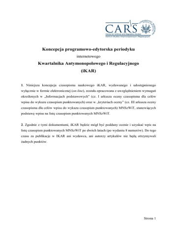 Koncepcja programowo-edytorska periodyku internetowego Kwartalnika Antymonopolowego i Regulacyjnego (iKAR) 1. Niniejsza koncepcja czasopisma naukowego iKAR, wydawanego i udostępnionego wyłącznie w formie elektronicznej (on-line), została opracowana z uwzględnieniem wymagań określonych w „Informacjach podstawowych” (cz. I arkusza oceny czasopisma dla celów wpisu do wykazu czasopism punktowanych) oraz w „kryteriach oceny” (cz. III arkusza oceny czasopisma dla celów wpisu do wykazu czasopism punktowanych) MNSzWiT, stanowiących podstawę wpisu na listę czasopism punktowanych MNSzWiT. 2. Zgodnie z tymi dokumentami, iKAR będzie mógł być poddany ocenie i uzyskać wpis na listę czasopism punktowanych MNSzWiT po dwóch latach (po wydaniu 8 numerów). Do tego czasu za publikacje w IKAR ani wydawca, ani autorzy artykułów nie będą otrzymywali żadnych punktów. Strona 1 Wersja skrócona (executive summary) 1. iKAR. W 2012 r. CARS rozpocznie wydawanie elektronicznego czasopisma internetowy Kwartalnik Antymonopolowy i Regulacyjny (IKAR). Będzie on posiadał własną szatę graficzną (layout) i funkcjonował na specjalnej stronie internetowej, która zostanie dla niego stworzona (www.ikar.wz.uw.edu.pl). iKAR będzie więc wydany wyłącznie on-line; nie będzie miał wersji papierowej. Deklaracja taka zostanie umieszczona na ww. stronie oraz w każdym numerze. 2. Zakres dyscyplinowy i tematyczny. iKAR jest otwarty na publikacje prawnicze i ekonomiczne oraz leżące na pograniczu tych dyscyplin i nauk o zarządzaniu czy nawet nauk technicznych. Dwa podstawowe mega-obszary publikacji stanowią: (1) ochrona konkurencji (w tym praktyki ograniczające konkurencję i kontrola koncentracji) oraz (2) regulacje sektorowe. Ten drugi obszar będzie początkowo ograniczony tylko do sektorów infrastrukturalnych; z czasem będzie mógł obejmować także wszelkie inne sektory szczególne (jak „usługi audiowizualne” czy „usługi finansowe”) lub dziedziny pokrewne (np. pomoc państwa, ochronę konsumentów, relacje między ochroną konkurencji a PWI itp.). Autorzy będą mogli pisać artykuły naukowe (oraz inne teksty) nie tylko na tematy polskie, ale także mające wymiar unijny (inaczej niż w YARS, gdzie dominuje perspektywa krajowa) lub globalny. 3. Charakter. IKAR będzie standardowym czasopismem naukowym, spełniającym wysokie kryteria naukowe. Kolegium Redakcyjne zapewni, aby w każdym numerze znajdowała się taka ilość publikacji naukowych, jaka jest wymagana dla uznania go za „czasopismo naukowe”. Przynajmniej artykuły naukowe, które będą stanowić najważniejszy element czasopisma, będą podlegały procedurze recenzowania typu double-blind peer review (doubleblind review process), zgodnie z którą artykuły naukowe są poddawane ocenie przez dwóch niezależnych recenzentów spoza Kolegium Redakcyjnego i WZ UW, przy czym autorzy i recenzenci nie znają swojej tożsamości. Wszelkie inne publikacje w iKAR (glosy, przeglądy, recenzje, sprawozdania itp.) będą poddane recenzji wewnętrznej redaktora tematycznego. Każdy artykuł naukowy (ew. także inne teksty) będzie posiadał tytuł i abstrakt w języku angielskim. Zasady kwalifikowania lub odrzucania publikacji oraz formularz recenzencki, zawierający m.in. zestaw kryteriów oceny jakościowej (zbliżony do tego, który stosujemy w YARS), zostaną udostępnione na stronie internetowej www.ikar.wz.uw.edu.pl. Artykuły będą publikowane na licencji Creative Commons. 4. Autorzy i czytelnicy. Z punktu widzenia czytelników, iKAR będzie czasopismem naukowo-profesjonalnym, przeznaczonym nie tylko dla pracowników naukowych i studentów, ale także dla wszystkich członków środowiska prawników i ekonomistów zajmujących się problematyką ochrony konkurencji (antymonopolową) i regulacji sektorowych. Z tego względu będą w nim mogli publikować nie tylko pracownicy naukowi, ale także sędziowie, urzędnicy, adwokaci i radcowie prawni oraz konsultanci gospodarczy i menedżerscy. Ponieważ iKAR będzie publikowany po polsku i przeznaczony dla czytelników polskich, rzadko pojawia się w nim autorzy z „afiliacją zagraniczną”. Jednakże, z uwagi na jego internetową formę, będzie on dostępny także zagranicą. 5. Rada Naukowa. iKAR będzie czasopismem środowiskowym (ogólnokrajowym). Dlatego też Radę Naukową (ca 20-30 osób) czasopisma tworzyć będą kierownicy uczelnianych katedr publicznego prawa gospodarczego, prawa europejskiego, mikroekonomii lub międzynarodowych stosunków gospodarczych oraz kierownicy zakładów prawa konkurencji i Strona 2 ew. innych jednostek organizacyjnych działających na wydziałach prawa i administracji, ekonomii i zarządzania, które mają specjalizację sektorową. 6. Lista Recenzentów. Zostanie stworzona stała „Lista Recenzentów” (ca 50 osób), składająca się ze specjalistów z zakresu ochrony konkurencji i regulacji sektorowych. Będzie ona publikowana na www.ikar.wz.uw.edu.pl. Pierwsza Lista Recenzentów zostanie opublikowana na koniec 2012 r. (po wydaniu pierwszych czterech zeszytów IKAR) i będzie składała się z osób, które recenzowały artykuły do numerów 1-4/2012. 7. Kolegium Redakcyjne. Kolegium Redakcyjne (przynajmniej 10 osób) stanowić będą osoby zaproszone do współpracy przez wydawcę. W skład Kolegium Redakcyjnego wchodzić będą – obok redaktora naczelnego i jego zastępców (Prezydium Kolegium Redakcyjnego) – redaktorzy tematyczni (prowadzący określony dział tematyczny i odpowiedzialni za przebieg procesu recenzyjnego) i redaktor statystyczny (kontrolujący poprawność stosowanych przez autorów metod statystycznych). Redaktor językowy będzie angażowany kontraktowo do każdego numeru IKAR. 8. Zapora ghostwriting. W Kolegium Redakcyjnym będą wprowadzone stosowne procedury przeciwdziałania tzw. ghostwriting i ghost authorship, mające zapewnić najwyższy stopień rzetelności naukowej czasopisma. Proce