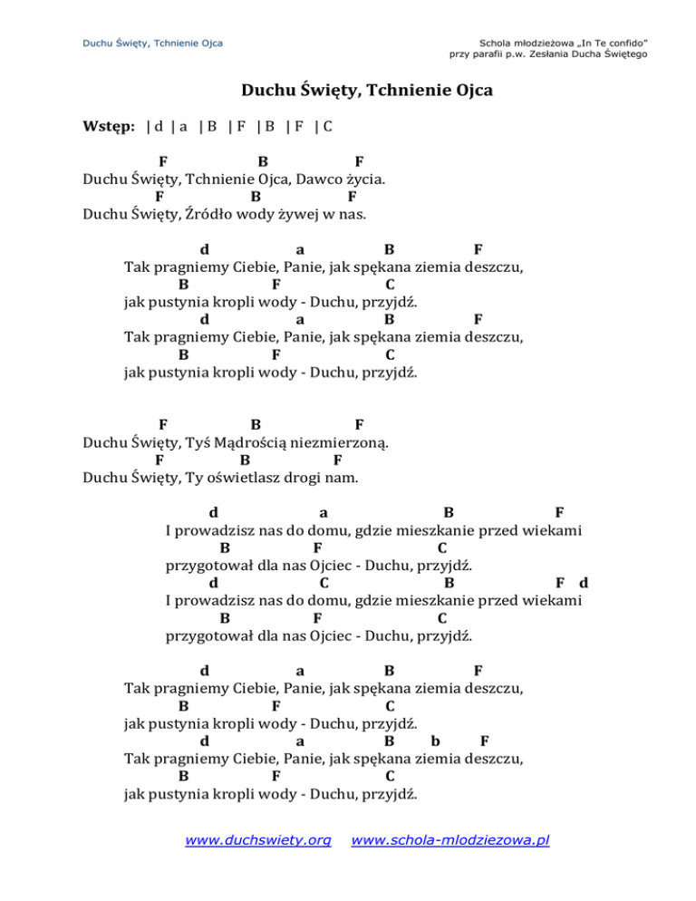Duchu Święty, Tchnienie Ojca Schola młodzieżowa „In Te confido” przy parafii p.w. Zesłania Ducha Świętego Duchu Święty, Tchnienie Ojca Wstęp: | d | a | B | F | B | F | C F B F Duchu Święty, Tchnienie Ojca, Dawco życia. F B F Duchu Święty, Źródło wody żywej w nas. d a B F Tak pragniemy Ciebie, Panie, jak spękana ziemia deszczu, B F C jak pustynia kropli wody - Duchu, przyjdź. d a B F Tak pragniemy Ciebie, Panie, jak spękana ziemia deszczu, B F C jak pustynia kropli wody - Duchu, przyjdź. F B F Duchu Święty, Tyś Mądrością niezmierzoną. F B F Duchu Święty, Ty oświetlasz drogi nam. d a B F I prowadzisz nas do domu, gdzie mieszkanie przed wiekami B F C przygotował dla nas Ojciec - Duchu, przyjdź. d C B F d I prowadzisz nas do domu, gdzie mieszkanie przed wiekami B F C przygotował dla nas Ojciec - Duchu, przyjdź. d a B F Tak pragniemy Ciebie, Panie, jak spękana ziemia deszczu, B F C jak pustynia kropli wody - Duchu, przyjdź. d a B b F Tak pragniemy Ciebie, Panie, jak spękana ziemia deszczu, B F C jak pustynia kropli wody - Duchu, przyjdź. www.duchswiety.org www.schola-mlodziezowa.pl