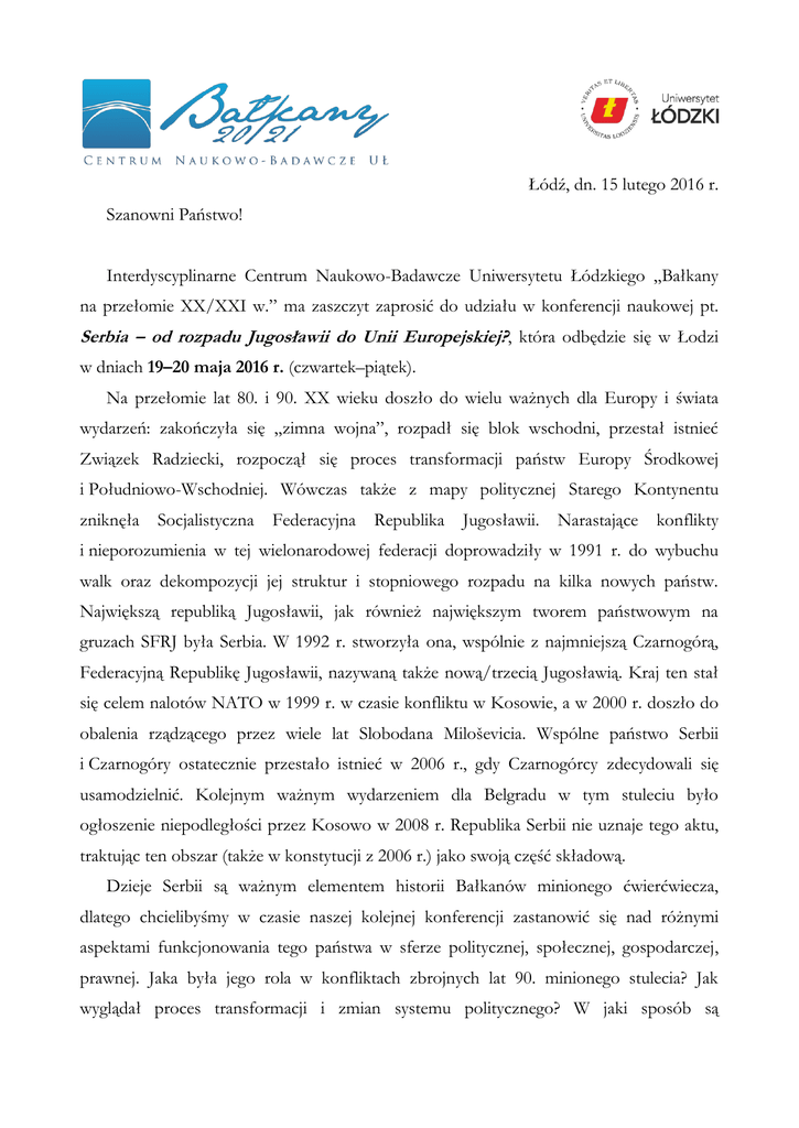 Łódź, dn. 15 lutego 2016 r. Szanowni Państwo! Interdyscyplinarne Centrum Naukowo-Badawcze Uniwersytetu Łódzkiego „Bałkany na przełomie XX/XXI w.” ma zaszczyt zaprosić do udziału w konferencji naukowej pt. Serbia – od rozpadu Jugosławii do Unii Europejskiej?, która odbędzie się w Łodzi w dniach 19–20 maja 2016 r. (czwartek–piątek). Na przełomie lat 80. i 90. XX wieku doszło do wielu ważnych dla Europy i świata wydarzeń: zakończyła się „zimna wojna”, rozpadł się blok wschodni, przestał istnieć Związek Radziecki, rozpoczął się proces transformacji państw Europy Środkowej i Południowo-Wschodniej. Wówczas także z mapy politycznej Starego Kontynentu zniknęła Socjalistyczna Federacyjna Republika Jugosławii. Narastające konflikty i nieporozumienia w tej wielonarodowej federacji doprowadziły w 1991 r. do wybuchu walk oraz dekompozycji jej struktur i stopniowego rozpadu na kilka nowych państw. Największą republiką Jugosławii, jak również największym tworem państwowym na gruzach SFRJ była Serbia. W 1992 r. stworzyła ona, wspólnie z najmniejszą Czarnogórą, Federacyjną Republikę Jugosławii, nazywaną także nową/trzecią Jugosławią. Kraj ten stał się celem nalotów NATO w 1999 r. w czasie konfliktu w Kosowie, a w 2000 r. doszło do obalenia rządzącego przez wiele lat Slobodana Miloševicia. Wspólne państwo Serbii i Czarnogóry ostatecznie przestało istnieć w 2006 r., gdy Czarnogórcy zdecydowali się usamodzielnić. Kolejnym ważnym wydarzeniem dla Belgradu w tym stuleciu było ogłoszenie niepodległości przez Kosowo w 2008 r. Republika Serbii nie uznaje tego aktu, traktując ten obszar (także w konstytucji z 2006 r.) jako swoją część składową. Dzieje Serbii są ważnym elementem historii Bałkanów minionego ćwierćwiecza, dlatego chcielibyśmy w czasie naszej kolejnej konferencji zastanowić się nad różnymi aspektami funkcjonowania tego państwa w sferze politycznej, społecznej, gospodarczej, prawnej. Jaka była jego rola w konfliktach zbrojnych lat 90. minionego stulecia? Jak wyglądał proces transformacji i zmian systemu politycznego? W jaki sposób są 2 rozwiązywane problemy narodowościowe, religijne, praw człowieka? Jakie są relacje Belgradu z sąsiadami i innymi państwami/organizacjami międzynarodowymi? Jakie są perspektywy Serbii w procesie akcesyjnym do Unii Europejskiej? Czy udało się rozwiązać problem rozliczeń z bolesną przeszłością lat 90. XX wieku? Jakie są zagrożenia i wyzwania dla bezpieczeństwa i stabilizacji państwa w regionie? Czy „bałkańska beczka prochu” może kolejny raz eksplodować w tym państwie/regionie? Czy obecny kryzys imigracyjny zagraża także Serbii? Powyżej przedstawione problemy są tylko propozycjami, a potencjalni autorzy referatów mogą zaproponować inne zagadnienia badawcze, związane z głównym tematem konferencji. Organizatorzy mają nadzieję, iż ta interdyscyplinarna konferencja zgromadzi przedstawicieli różnych dziedzin nauki, i gwarantują, że ich przemyślenia i konkluzje zostaną opublikowane. Osoby pragnące uczestniczyć w konferencji proszone są o przesłanie karty zgłoszeniowej w terminie do 30 kwietnia 2016 r. na adres organizatorów: Centrum Naukowo-Badawcze Uniwersytetu Łódzkiego „Bałkany na przełomie XX/XXI w.”, ul. Franciszkańska 1/5, 91-431 Łódź, lub pocztą elektroniczną ([email protected]). Opłata konferencyjna wynosi 300 zł i nie obejmuje kosztów noclegów. Uniwersytet Łódzki wynegocjował specjalne ceny dla uczestników konferencji w Hotelu Polonia Palast (ul. Narutowicza 38, 90-135 Łódź, http://hotelpolonia.obitur.pl): 100 zł za jeden nocleg za pokój jednoosobowy oraz 150 zł za pokój dwuosobowy. Osoby zainteresowane noclegiem proszone są o bezpośredni kontakt z hotelem. Opłatę za udział w konferencji prosimy przelać na konto UŁ: PKO S.A., O/II w Łodzi, 14 1240 3028 1111 0010 0434 7782 (z dopiskiem: „Konferencja Serbia”). Serdecznie zapraszamy do udziału w konferencji! Z wyrazami szacunku, dr hab. Konrad Składowski, prof. UŁ Kierownik Centrum Naukowo-Badawczego UŁ „Bałkany na przełomie XX/XXI w.” Centrum Naukowo-Badawcze UŁ „Bałkany na przełomie XX/XXI w.”, ul. Franciszkańska 1/5, 91-431 Łódź tel. (+48) 42 6655020, email: [email protected], https://www.centrumbalkany.uni.lodz.pl, https://www.facebook.com/centrumbalkany/