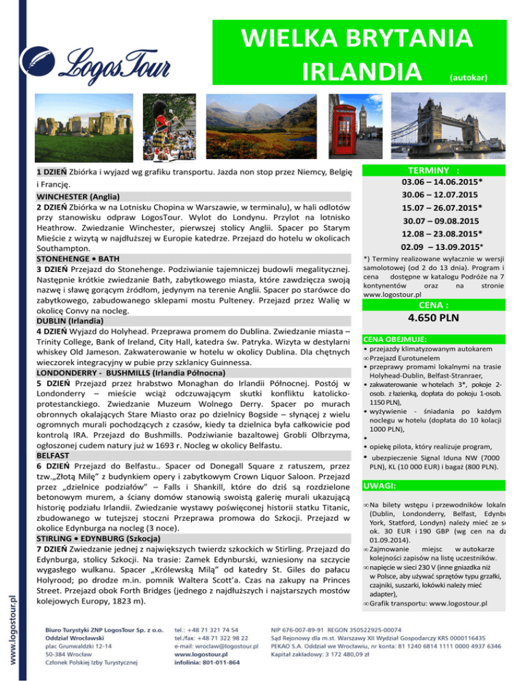WIELKA BRYTANIA IRLANDIA (autokar) 1 DZIEŃ Zbiórka i wyjazd wg grafiku transportu. Jazda non stop przez Niemcy, Belgię i Francję. WINCHESTER (Anglia) 2 DZIEŃ Zbiórka w na Lotnisku Chopina w Warszawie, w terminalu), w hali odlotów przy stanowisku odpraw LogosTour. Wylot do Londynu. Przylot na lotnisko Heathrow. Zwiedzanie Winchester, pierwszej stolicy Anglii. Spacer po Starym Mieście z wizytą w najdłuższej w Europie katedrze. Przejazd do hotelu w okolicach Southampton. STONEHENGE • BATH 3 DZIEŃ Przejazd do Stonehenge. Podziwianie tajemniczej budowli megalitycznej. Następnie krótkie zwiedzanie Bath, zabytkowego miasta, które zawdzięcza swoją nazwę i sławę gorącym źródłom, jedynym na terenie Anglii. Spacer po starówce do zabytkowego, zabudowanego sklepami mostu Pulteney. Przejazd przez Walię w okolicę Convy na nocleg. DUBLIN (Irlandia) 4 DZIEŃ Wyjazd do Holyhead. Przeprawa promem do Dublina. Zwiedzanie miasta – Trinity College, Bank of Ireland, City Hall, katedra św. Patryka. Wizyta w destylarni whiskey Old Jameson. Zakwaterowanie w hotelu w okolicy Dublina. Dla chętnych wieczorek integracyjny w pubie przy szklanicy Guinnessa. LONDONDERRY - BUSHMILLS (Irlandia Północna) 5 DZIEŃ Przejazd przez hrabstwo Monaghan do Irlandii Północnej. Postój w Londonderry – mieście wciąż odczuwającym skutki konfliktu katolickoprotestanckiego. Zwiedzanie Muzeum Wolnego Derry. Spacer po murach obronnych okalających Stare Miasto oraz po dzielnicy Bogside – słynącej z wielu ogromnych murali pochodzących z czasów, kiedy ta dzielnica była całkowicie pod kontrolą IRA. Przejazd do Bushmills. Podziwianie bazaltowej Grobli Olbrzyma, ogłoszonej cudem natury już w 1693 r. Nocleg w okolicy Belfastu. BELFAST 6 DZIEŃ Przejazd do Belfastu.. Spacer od Donegall Square z ratuszem, przez tzw.„Złotą Milę” z budynkiem opery i zabytkowym Crown Liquor Saloon. Przejazd przez „dzielnice podziałów” – Falls i Shankill, które do dziś są rozdzielone betonowym murem, a ściany domów stanowią swoistą galerię murali ukazującą historię podziału Irlandii. Zwiedzanie wystawy poświęconej historii statku Titanic, zbudowanego w tutejszej stoczni Przeprawa promowa do Szkocji. Przejazd w okolice Edynburga na nocleg (3 noce). STIRLING • EDYNBURG (Szkocja) 7 DZIEŃ Zwiedzanie jednej z największych twierdz szkockich w Stirling. Przejazd do Edynburga, stolicy Szkocji. Na trasie: Zamek Edynburski, wzniesiony na szczycie wygasłego wulkanu. Spacer „Królewską Milą” od katedry St. Giles do pałacu Holyrood; po drodze m.in. pomnik Waltera Scott’a. Czas na zakupy na Princes Street. Przejazd obok Forth Bridges (jednego z najdłuższych i najstarszych mostów kolejowych Europy, 1823 m). TERMINY : 03.06 – 14.06.2015* 30.06 – 12.07.2015 15.07 – 26.07.2015* 30.07 – 09.08.2015 12.08 – 23.08.2015* 02.09 – 13.09.2015* *) Terminy realizowane wyłacznie w wersji samolotowej (od 2 do 13 dnia). Program i cena dostępne w katalogu Podróże na 7 kontynentów oraz na stronie www.logostour.pl CENA : 4.650 PLN CENA OBEJMUJE: • przejazdy klimatyzowanym autokarem • Przejazd Eurotunelem • przeprawy promami lokalnymi na trasie Holyhead-Dublin, Belfast-Stranraer, • zakwaterowanie w hotelach 3*, pokoje 2osob. z łazienką, dopłata do pokoju 1-osob. 1150 PLN), • wyżywienie - śniadania po każdym noclegu w hotelu (dopłata do 10 kolacji 1000 PLN), • • opiekę pilota, który realizuje program, • ubezpieczenie Signal Iduna NW (7000 PLN), KL (10 000 EUR) i bagaż (800 PLN). UWAGI: • Na bilety wstępu i przewodników lokalnych (Dublin, Londonderry, Belfast, Edynburg, York, Statford, Londyn) należy mieć ze sobą ok. 30 EUR i 190 GBP (wg cen na dzień 01.09.2014). • Zajmowanie miejsc w autokarze wg kolejności zapisów na listę uczestników. • napięcie w sieci 230 V (inne gniazdka niż w Polsce, aby używać sprzętów typu grzałki, czajniki, suszarki, lokówki należy mieć adapter), • Grafik transportu: www.logostour.pl LOCH NESS • FORT WILLIAM 8 DZIEŃ Wyjazd w kierunku legendarnego jeziora Loch Ness. Objazd jeziora od strony Inverness. Zwiedzanie zamku Urquhart nad Loch Ness, gdzie najczęściej miał ukazywać się słynny potwór. Wyjazd w kierunku Edynburga. Po drodze przejazd przez słynny Kanał Kaledoński, drogę wodną łączącą Invernes z Fort William. Krótki postój w Fort William, miasteczku położonym nad fiordem Loch Linnhe, u podnóża Glen Nevis, najwyższego szczytu Wielkiej Brytanii (1344 m n.p.m.) . Przejazd przez piękną dolinę Glencoe, po drodze liczne jeziora, rzeki i wrzosowiska. MUR HADRIANA • DURHAM 9 DZIEŃ Zwiedzanie pogranicza szkocko-angielskiego XII-wieczne opactwo Jedburgh Abbey oraz Melrose Abbey, w którym złożone jest serce słynnego króla Szkocji Roberta Bruce. Przejazd do fortu Housesteads stanowiącego fragment Muru Hadriana, pochodzącego z II w. Postój w jednym z najpiękniejszych miasteczek północnej Anglii – Durham. Zwiedzanie gotyckiej katedry, spacer po Starówce. Nocleg w Newcastle. YORK 10 DZIEŃ Przejazd do Yorku – jednego z najpiękniejszych miast Wysp Brytyjskich. Zwiedzanie największej w Anglii gotyckiej katedry Minster oraz zrekonstruowanej wioski Wikingów z X w. - Jorvik Viking Center. Spacer po malowniczym centrum Yorku. Na szczególna uwagę zasługuje najsłynniejsza ulica miasta The Shambles, okrzyknięta w 2010 roku najbardziej malowniczą ulicą w Wielkiej Brytanii. Przejazd na nocleg w okolice Birmingham. STRATFORD-UPON-AVON OXFORD • LONDYN 11 DZIEŃ Wizyta w Stratford-upon-Avon – mieście Williama Szekspira. Zwiedzanie jego domu rodzinnego. Wizyta w Holy Trinity Church, gdzie znajduje się nagrobek pisarza. Przejazd do Oxfordu. Zwiedzanie Christ Church College, najstarszego kolegium oksfordzkiego uniwersytetu, gdzie obok katedry można podziwiać ogromną jadalnię, która posłużyła za plener zdjęciowy do filmów o Harrym Potterze. Spacer po zabytkowym centr