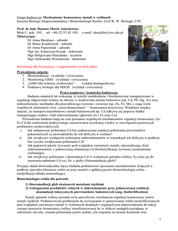 Grupa badawcza: Mechanizmy homeostazy metali w roślinach Instytut Biologii Eksperymentalnej i Biotechnologii Roślin, ZAiCR, W. Biologii, UW; Prof. dr hab. Danuta Maria Antosiewicz Blok C, pok. 105; tel: +48-22-55 42 105; e-mail: [email protected] Skład grupy: Dr Anna Barabasz - adiunkt Dr Maria Kendziorek - adiunkt Dr Anna Papierniak - adiunkt Mgr inż. Katarzyna Kozak - doktorant Mgr Małgorzata Palusińska - asystent Mgr Aleksandra Weremczuk - doktorant Informacje dla licencjuszy i magistrantów na dole pliku Prowadzone zajęcia: 1. Bioremediacja (wykłady i ćwiczenia) 2. Monitoring GMO (wykłady i ćwiczenia) 3. „GMO dla ochrony środowiska” – wykład monograficzny 4. Podstawy biologii dla MSOŚ (wykład i ćwiczenia) Praca naukowa / tematyka badawcza: Badania ostatnich lat wskazują, iż ścieżki molekularne i biochemiczne zaangażowane w regulację odpowiedzi rośliny na obecne w środowisku metale balastowe (np. Cd, Pb, Hg, As) oraz mikroelementy niezbędne dla prawidłowego wzrostu i rozwoju (np. Zn, Fe, Mn ), mają wiele wspólnych elementów (tzw „cross-homeostasis” – homeostaza krzyżowa). Wiadomo między innymi, że transport transbłonowy metali balastowych np. Cd odbywa się poprzez białka transportujące makro- i/lub mikroelementy (głównie Zn i Fe oraz Ca). Prowadzone badania mają na celu poznanie wspólnych mechanizmów regulacji homeostazy ZnFe-Cd dla znalezienia praktycznego zastosowania uzyskanej wiedzy w rozwiązaniu poniższych problemów środowiskowych: i. Jak zahamować pobieranie Cd bez jednoczesnej redukcji pobierania pierwiastków pokarmowych co prowadziłoby do ich deficytu w roślinie? ii. Jak zwiększyć wydajność pobierania mikroelementów w warunkach ich deficytu w podłożu bez ryzyka zwiększania pobierania Cd? iii. Jak poprawić jakość żywności pod względem zawartości metali, optymalizując ilość mikroelementów z jednoczesną eliminacją Cd (biofortyfikacja żywności pochodzenia roślinnego). iv. Jak zwiększyć pobieranie i akumulację Cd w wybranym gatunku rośliny, by użyć jej do usuwania nadmiaru Cd czy Zn z gleby (fitoremediacja gleb)? Przyjęty układ doświadczalny łączy badania podstawowe (poznanie mechanizmów leżących u podłoża zjawiska tolerancji roślin na jony metali) z aplikacyjnymi (biotechnologia roślin modyfikacja składu mineralnego). Biotechnologia roślin dla potrzeb: 1) fitoremediacji gleb skażonych metalami ciężkimi 2) wzbogacania produktów rolnych w mikroelementy przy jednoczesnej redukcji akumulacji toksycznych pierwiastków balastowych (ang. biofortification) Każdy gatunek rośliny posiada swój specyficzny mechanizm regulacji homeostazy jonów metali ciężkich. Podstawowym problemem do rozwiązania w generowaniu roślin modyfikowanych pod względem zawartości metali w wybranych tkankach i organach jest doprowadzenie do takiej zmiany procesów homeostazy rośliny transformowanej by w efekcie nastąpiła pożądana, w zależności od celu, zmiana pobierania jonów metali, ich wiązania na terenie komórek oraz 1 dystrybucji w tkankach (co w wielu przypadkach jest ściśle powiązane także z modyfikowaniem poziomu tolerancji na metale). Zatem fenotyp modyfikowanej genetycznie rośliny zależy nie tylko od funkcji genu użytego do transformacji, ale także od tego, w jaki sposób u danego gatunku system homeostazy metali odpowiada na zmiany w statusie jonowym w danym kompartmencie komórki, wywołane ekspresją wprowadzonego genu. Oznacza to, iż ekspresja tego samego genu w różnych gatunkach wcale nie musi prowadzić do takiego samego fenotypu. Chociaż znajomość procesów prowadzących do wytworzenia określonego fenotypu transformanta wydaje się być niezbędna dla planowania modyfikacji składu mineralnego rośliny, prawie nic na ten temat nie wiadomo. Poznanie ich ma zatem znaczenie nie tylko praktyczne (dla celów biotechnologii roślin). Pokazuje także jak mechanizmy homeostazy metali funkcjonują w roślinie, zatem prowadzi do poznania podstawowych zjawisk leżących u podłoża tolerancji roślin na jony metali, w tym procesów regulujących pobieranie, transport, akumulację, detoksykację i dystrybucję w tkankach i organach. Zakres prowadzonych badań: (i) poznanie mechanizmów regulujących utrzymanie homeostazy jonów metali w komórce, poprzez analizę wpływu ekspresji genów użytych do transformacji: (a) na profil ekspresji genów endogennych rośliny użytej do transformacji; (b) na przebieg procesów metabolicznych rośliny transformowanej - ocena udziału tych procesów w generowaniu fenotypu transformanta / obserwowanych zmian: w pobieraniu, transporcie, dystrybucji jonów metali na poziomie komórek, tkanek i organów, w wydajności detoksykacji, w poziomie tolerancji na metale Zależności te są bardzo słabo poznane. W związku z tym, iż ekspresja heterologiczna jest jedną z ważnych metod stosowanych w biotechnologii w generowaniu roślin transgenicznych dla celów użytkowych, prowadzone badania dostarczą wiedzy niezbędnej dla jej rozwoju. (ii) ocena przydatności badanych genów do transformacji dla celów biotechnologicznych (modyfikacja poziomu tolerancji na metale, akumulacji, w tym pobierania oraz dystrybucji w tkankach / organach). Przyjęty układ doświadczalny łączy więc badania podstawowe (poznanie mechanizmów leżących u podłoża zjawiska tolerancji roślin na jony metali) z aplikacyjnymi (biotechnologia roślin modyfikacja składu mineralnego). Materiałem do badań są rośliny typu dzikiego tytoniu (Nicotiana tabacum v. Xanthii) i pomidora (Lycopersicon esculentum v. Money-maker i Beta) oraz transformanty z ekspresją genów, których białka odpowiedzialne są (i) za transport transbłonowy jonów metali, (ii) za procesy ich detoksykacji w komórce. Kodowane białka to: 1) Przenośniki metali • przenośnik typu ABC - AtMRP7 z Arabidopsis thaliana Topologia przenośnika MRP: Biemans-Oldehinkel i wsp. FEBS Lett. 2006, v. 580: