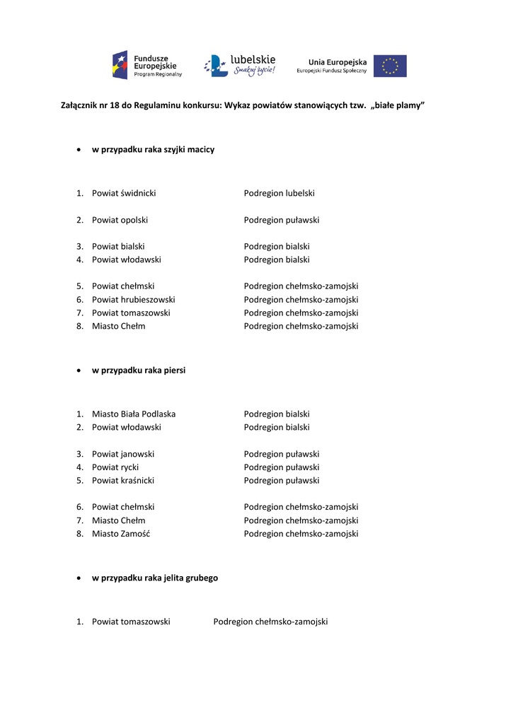 Załącznik nr 18 do Regulaminu konkursu: Wykaz powiatów stanowiących tzw. „białe plamy” w przypadku raka szyjki macicy 1. Powiat świdnicki Podregion lubelski 2. Powiat opolski Podregion puławski 3. Powiat bialski 4. Powiat włodawski Podregion bialski Podregion bialski 5. 6. 7. 8. Powiat chełmski Powiat hrubieszowski Powiat tomaszowski Miasto Chełm Podregion chełmsko-zamojski Podregion chełmsko-zamojski Podregion chełmsko-zamojski Podregion chełmsko-zamojski w przypadku raka piersi 1. Miasto Biała Podlaska 2. Powiat włodawski Podregion bialski Podregion bialski 3. Powiat janowski 4. Powiat rycki 5. Powiat kraśnicki Podregion puławski Podregion puławski Podregion puławski 6. Powiat chełmski 7. Miasto Chełm 8. Miasto Zamość Podregion chełmsko-zamojski Podregion chełmsko-zamojski Podregion chełmsko-zamojski w przypadku raka jelita grubego 1. Powiat tomaszowski Podregion chełmsko-zamojski
