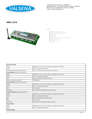 V.Bartkeviciaus company "VALSENA" Savanoriu ave. 271 - 412 Kaunas LT 50131, Lithuania Phone: 370 37 310603 Fax: 370 37 310648 E-mail: [email protected] MPC-374 Podstawowe cechy: Wolnie wybierają się interfejsy: do 10 wolnie wybranych rodzajów interfejsów. Możliwe rodzaje interfejsów: RS485, RS232, Opto (Kamstrup), Mbus, pętla prądowa, GSM/GPRS i LAN. Dwa uniwersalne interfejsy (za pomocą zworku można zmieniać rodzaj interfejsu) Wejścia dyskretne: do 10 urządzeń Wyjścia dyskretne: do 8 urządzeń Wejścia anologowe: do 8 urządzeń Podtrzymywane protokoły: Modbus RTU, Modbus TCP/IP, IP, ICMP, UDP, TCP, DHCP, PPP, ARP, SNTP, IEC60870-5-104:200, przezroczysty. Routing: GSM - Ethernet możliwość Routingu Szczególne cechy: jasne przekazywanie danych niestandartowego protokołu Zasilanie: 9-36 VDC (10VA) Wydaje napięcie: 3,7; 5; 6; 8 lub 10 VDC (20mA) Pierwszy interfejs RS485 odległość do 1,2 km, maks. 32 nadawcy, szybkość do 19.2 Kbits/s RS232 do 15 m, szybkość do 19,2Kbit/s Dwuprzewodowa aktywna pętla prądowa 25-27V, 14-20 mA, do 6 km, szybkość do 19,2 Kbit/s Drugi interfejs (galwanicznie izolowany) RS485 odległość do 1,2 km, maks. 32 nadawcy, szybkość do 19.2 Kbits/s RS232 do 15 m, szybkość do 19,2Kbit/s Opto (Kamstrup) interfejs przekazania danych Zewnętrzne zasilanie urządzeń 3,7/5/6/8/10 V Trzeci interfejs (galwanicznie izolowany) RS485 odległość do 1,2 km, maks. 32 nadawcy, szybkość do 19.2 Kbits/s RS232 do 15 m, szybkość do 19,2Kbit/s MBus do 8 urządzeń Uniwersalny wymiany przez użytkownika za pomocą skoczku Czwarty interfejs (galwanicznie izolowany) RS485 odległość do 1,2 km, maks. 32 nadawcy, szybkość do 19.2 Kbits/s RS232 do 15 m, szybkość do 19,2Kbit/s Opto (Kamstrup) interfejs przekazania danych MBus do 8 urządzeń Uniwersalny wymiany przez użytkownika za pomocą skoczku Piąty interfejs RS485 odległość do 1,2 km, maks. 32 nadawcy, szybkość do 19.2 Kbits/s RS232 do 15 m, szybkość do 19,2Kbit/s Szósty interfejs 1/5 RS485 odległość do 1,2 km, maks. 32 nadawcy, szybkość do 19.2 Kbits/s RS232 do 15 m, szybkość do 19,2Kbit/s Siódmy interfejs RS232 do 15 m, szybkość do 19,2Kbit/s Ósmy interfejs RS232 do 15 m, szybkość do 19,2Kbit/s GSM/GPRS 3 częstotliwoście 900/1800/1900 Mhy Dziewiąty interfejs Ethernet skręcona para, 10/100 Mbps, odledłość do 100 m Dziesiąty interfejs USB (device) typ B, wersja 2,0 Analogiczne i Dyskretne Dyskretne IN 8 suchy kontakt Dyskretne OUT 8 otwarty kontakt, >50VDC i >500mA Analogiczne IN 8 0/4 - 20mA, 0 - 5mA Protokoły Modbus RTU Modbus TCP/IP IP ICMP UDP TCP DHCP PPP ARP SNTP IEC60870-5-104:2000 DynDNS FTP server FTP client DNS client Parametry ogólne Zasilanie 9-36 VDC Galwaniczne rozdzielenie zasilania >1000V NaudojamaMoc używanas galingumas <10VA Zewnętrzne zasilanie urządzeńinių maitinimas 3,7/5/6/8/10 VDC (20mA) Wspierane standarty Elektromagnetyczna zgodność LST LST LST LST LST LST LST LST EN EN EN EN EN EN EN EN 61000-4-5:2002+A1:2003 55022:2000+A1+AC:2002+A2:2003 55024:2000+A1:2003+A2:2003 61000-4-2+A1+A2:2002 61000-4-3+A1:2004 61000-4-4:2005 61000-4-5:2002+A1:2003 61000-4-6:2002+A1:2003 Bezpieczeństwo LST EN 61010-1:2002 Specyfikacja Procesor ARM7 Pamięć dla przechowywania danych 1-8 MB, energetycznie niezależne przechowywanie danych 5 miesięcy LED wskazanie Zasilanie + Stan dyskretnych kanałów + Odczytanie/pisanie spójnych interfejsów + Tryb pracy modemu GSM/GPRS + Stan Ethernet + Konfiguracja i aktualizacja oprogramowania Zdalny GSM/GPRS, Ethernet (RJ45) Lokalny USB, RS232, RS485 Charakterystyka fizyczna Wymiary 277x128x50 mm Waga 540 g Rodzaj mocowania na torze DIN32 2/5 Klasa bezpieczeństwa IP20 Warunki klimatu Temperatura robocza -25..+60 °C Temperatura magazynowania -40..+60 °C Wilgotność 5-95%, bez kondensatu Inne cechy Zainstalowany zegar czasu rzeczywistego + Automatyczne poszukiwanie urządzeń Mbus + Gwarancja producenta 24 miesiące + MAKS liczba interfejsów (filtracja) Wspierane liczba interfejsów 10 RS485 + odległość do 1,2 km, maks. 32 nadawcy, szybkość do 19.2 Kbits/s RS232 + do 15 m, szybkość do 19,2Kbit/s Opto + (Kamstrup) interfejs przekazania danych MBus + do 8 urządzeń Pętla prądowa + Aktywna lub pasywna, 2 lub 4 przewodowa Ethernet + vyta pora, 10/100 Mbps, atstumas iki 100m USB (device) + typ B, wersja 2,0 USB (host) - typ A, wersja 2,0 HART - Zewnętrzne zasilanie urządzeń + 3,7/5/6/8/10 V Uniwersalny + wymiany przez użytkownika za pomocą skoczku GSM/GPRS + 3 częstotliwoście 900/1800/1900 Mhy PRZEGLĄD MPC-374 przeznaczony do odczytywania, gromadzenia i funkcja w realnym czasie przekazywania zdalnie danych. Dla przekazywania danych na dużych odległościach MPC-374 korzysta z modemu GPRS/GSM i/lub sieć Ethernet. Sterownik podtrzymuje większość korzystanych interfejsów (RS232, RS485, Mbus, Opto, Pętla prądowa i Wejście dyskretne) i protokołów (TCP/IP, Modbus RTU, Modbus TCP/IP,...), to pozwala podłączyć liczniki o różnych rodzajach ir różnych producentów w tym samym czasie. Aby zwiększyć funkcjonalność korzystane są dwa Uniwersalne interfejsy (za pomocą zworku można zmieniać rodzaj interfejsu). Nasz specjalny „Przezroczysty" tryb wymiany danych, umożliwia zdalne sterowanie dowolego podłączonego urządzenia, nawet jeżeli urządzenie korzysta z specyficznego (niestandartowego) protokołu (Możliwe są dwa tryby Przezroczystej wymiany danych – między UART'ami, zapytanie – odpowiedź i w pełni przezroczysta). MPC-374 podtrzymuje szeroki zakres protokołów (i spis może być dopełniony na zamówienie). Wymiana danych przez GPRS/GSM, Ethernet i/lub przez dowolny spójny port wykonuje się standartowymi protokołami Modbus, TCP/IP, Modbus RTU, IEC60870-5-104:2000. PODSTAWOWE CECHY Odczytanie danych z liczników nośników energii; „Przezroczyste" odczytanie danych z zdalnego komputeru (specjalnym protokołem producenta); Szeroki wybór interfejsów - GPRS/GSM, R
