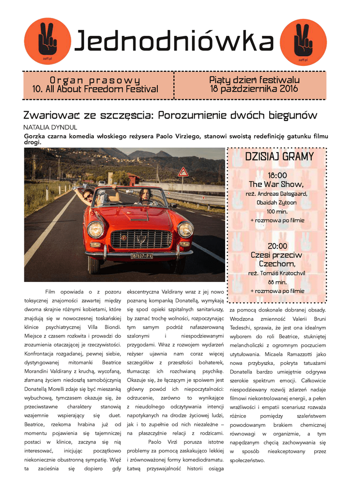 Jednodniówka O rga n p ra s o w y 10. All About Freedom Festival Piaty dzien festiwalu 18 pazdziernika 2016 Zwariowac ze szczescia: Porozumienie dwóch biegunów NATALIA DYNDUL Gorzka czarna komedia włoskiego reżysera Paolo Virzìego, stanowi swoistą redefinicję gatunku filmu drogi. DZISIAJ GRAMY 18: 00 The War Show, rez. Andreas Dalsgaard, Obaidah Zytoon 100 min. + rozmowa po filmie 20:00 Czesi przeciw Czechom , rez. Tomás Kratochvíl 88 min. Film opowiada o z pozoru toksycznej znajomości zawartej między dwoma skrajnie różnymi kobietami, które znajdują się w nowoczesnej toskańskiej klinice psychiatrycznej Villa Biondi. Miejsce z czasem rozkwita i prowadzi do zrozumienia otaczającej je rzeczywistości. Konfrontacja rozgadanej, pewnej siebie, dystyngowanej mitomanki Beatrice Morandini Valdirany z kruchą, wycofaną, złamaną życiem niedoszłą samobójczynią Donatellą Morelli zdaje się być mieszanką wybuchową, tymczasem okazuje się, że przeciwstawne charaktery stanowią wzajemnie wspierający się duet. Beatrice, rzekoma hrabina już od momentu pojawienia się tajemniczej postaci w klinice, zaczyna się nią interesować, inicjując początkowo niekoniecznie obustronną sympatię. Więź ta zacieśnia się dopiero gdy ekscentryczna Valdirany wraz z jej nowo poznaną kompanką Donatellą, wymykają się spod opieki szpitalnych sanitariuszy, by zaznać trochę wolności, rozpoczynając tym samym podróż nafaszerowaną szalonymi i niespodziewanymi przygodami. Wraz z rozwojem wydarzeń reżyser ujawnia nam coraz więcej szczegółów z przeszłości bohaterek, tłumacząc ich rozchwianą psychikę. Okazuje się, że łączącym je spoiwem jest główny powód ich niepoczytalności: odrzucenie, zarówno to wynikające z nieudolnego odczytywania intencji napotykanych na drodze życiowej ludzi, jak i to zupełnie od nich niezależne – na płaszczyźnie relacji z rodzicami. Paolo Virzì porusza istotne problemy za pomocą zaskakująco lekkiej i zrównoważonej formy komediodramatu. Łatwą przyswajalność historii osiąga + rozmowa po filmie za pomocą doskonale dobranej obsady. Wrodzona zmienność Valerii Bruni Tedeschi, sprawia, że jest ona idealnym wyborem do roli Beatrice, stukniętej melancholiczki z ogromnym poczuciem utytułowania. Micaela Ramazzotti jako nowa przybyszka, pokryta tatuażami Donatella bardzo umiejętnie odgrywa szerokie spektrum emocji. Całkowicie niespodziewany rozwój zdarzeń nadaje filmowi niekontrolowanej energii, a pełen wrażliwości i empatii scenariusz rozważa różnice pomiędzy szaleństwem powodowanym brakiem chemicznej równowagi w organizmie, a tym napędzanym chęcią zachowywania się w sposób nieakceptowany przez społeczeństwo. Hipnotyzujacy Waclaw Zimpel: relacja z koncertu PATRYK KUDREWICZ Podczas przerwy między pokazami Creative Control a Zwariować ze szczęścia publika All About Freedom Festival miała okazję usłyszeć kameralny koncert Wacława Zimpla – wybitnego polskiego klarnecisty i improwizatora. Tradycyjnie występ odbył się wśród świateł ogrodu powolności. The Polish composer and clarinetist Waclaw Zimpel is a musical chameleon. Tymi słowami dziennikarz „New York Times”, Stephan Heymen, opisał polskiego muzyka . Zimpel przez polskich krytyków muzycznych nazywany jest artystą poszukującym. Świadczą o tym jego liczne, różnorodne i międzynarodowe fot. Grzegorz Mehring komponowały się z minimalistyczną świetlną dekoracją ogrodu powolności. Muzyczna improwizacja perfekcyjnie oddaje ideę festiwalu – wolność tak bardzo ważną w każdej dziedzinie życia. Koncert Wacława Zimpla to w muzycznym repertuarze festiwalu przedostania pozycja. Goście już w najbliższy czwartek będą mieli okazję posłuchać Piotra Kurka. fot. Grzegorz Mehring projekty, sięgające m.in. do muzycznych tradycji Indii, Japonii czy Maroka. Od lat współtworzy zespół Hera, a także jest członkiem grup Ircha, Saagara, Undivided czy Wacław Zimpel To Tu Orkiestra. Prowadzi też karierę solową, którą rozpoczął w 201 6 albumem Line. Koncert Wacława Zimpla podczas All About Freedom najlepiej określić słowem hipnotyzujący. Muzyk wprowadził publiczność w trwający ponad trzydzieści minut trans. Dźwięk klarnetu, pianina czy khaen (instrument pochodzący z Azji) idealnie fot. Grzegorz Mehring STRONA 2 Creative Control: Czlowiek vs. rzeczywistosc, technologia vs. czlowiek KAROLINA WARYŚ Czujesz, że nie masz co zrobić z czasem, a twoje życie zmierza donikąd? Nie martw się, z pomocą przychodzi ci nowa technologia! Gdy Davidowi (Benjamin Dickinson) przestaje wystarczać piękna i kochająca dziewczyna (Nora Zehetner), pewna pozycja w pracy oraz inne drobiazgi składające się na całkiem przyjemne życie, sięga on po innowacyjny gadżet. Dzięki niemu żegna się z życiowym niezaspokojeniem. Odnajduje zupełnie nowe wrażenia i utwierdza się w fakcie, że zaczyna się zakochiwać w dziewczynie przyjaciela, Sophie (Alexia Rasmussen). Ale ta nowa zabawka tylko przybliża nam podłoże tej fascynacji. Jest czysto fizyczna. Nie ma tutaj miejsca na głębię i budowanie relacji. Bo niby w jaki sposób zacieśniać więzi z hologramem? Dotychczasowy związek Davida coraz bardziej go męczy, ucieka on więc w krainę sekretnych schadzek z wirtualną wersją Sophie. Chwilami zapomina jednak, że nie ma do czynienia z prawdziwą osobą, a wszystko co przeżywa, jest wytworem współpracy wynalazku i jego wyobraźni. Bohater ostatecznie traci rozróżnienie pomiędzy rzeczywistością a symulacją, co staje się dla niego bardzo zgubne. Mamy do czynienia z obrazem czarno-białym. Gdzieniegdzie jednak pojawia się kolor. Twórca koloruje takie drobiazgi jak niebieskie kropeczki przy ukazywaniu działania wynalazku, ale także całej wirtualnej postaci Sophie. Prawie każde ujęcie jest wizualną perełką. Obezwładniająca symetria kompozycji czy kontrasty wzbudzają zachwyt. Mimo, że obraz 