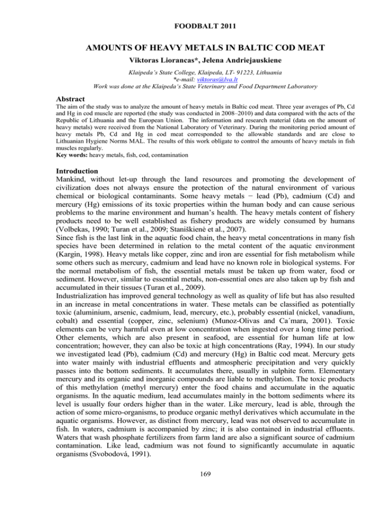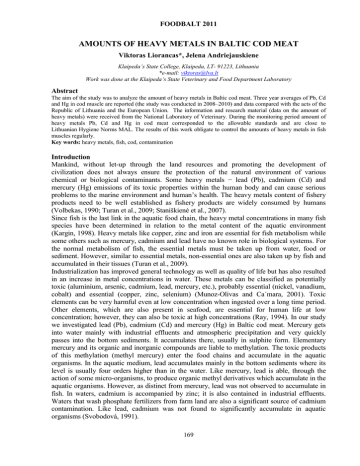 FOODBALT 2011 AMOUNTS OF HEAVY METALS IN BALTIC COD MEAT Viktoras Liorancas*, Jelena Andriejauskiene Klaipeda’s State College, Klaipeda, LT- 91223, Lithuania *e-mail: [email protected] Work was done at the Klaipeda‘s State Veterinary and Food Department Laboratory Abstract The aim of the study was to analyze the amount of heavy metals in Baltic cod meat. Three year averages of Pb, Cd and Hg in cod muscle are reported (the study was conducted in 2008–2010) and data compared with the acts of the Republic of Lithuania and the European Union. The information and research material (data on the amount of heavy metals) were received from the National Laboratory of Veterinary. During the monitoring period amount of heavy metals Pb, Cd and Hg in cod meat corresponded to the allowable standards and are close to Lithuanian Hygiene Norms MAL. The results of this work obligate to control the amounts of heavy metals in fish muscles regularly. Key words: heavy metals, fish, cod, contamination Introduction Mankind, without let-up through the land resources and promoting the development of civilization does not always ensure the protection of the natural environment of various chemical or biological contaminants. Some heavy metals − lead (Pb), cadmium (Cd) and mercury (Hg) emissions of its toxic properties within the human body and can cause serious problems to the marine environment and human’s health. The heavy metals content of fishery products need to be well established as fishery products are widely consumed by humans (Volbekas, 1990; Turan et al., 2009; Staniškienė et al., 2007). Since fish is the last link in the aquatic food chain, the heavy metal concentrations in many fish species have been determined in relation to the metal content of the aquatic environment (Kargin, 1998). Heavy metals like copper, zinc and iron are essential for fish metabolism while some others such as mercury, cadmium and lead have no known role in biological systems. For the normal metabolism of fish, the essential metals must be taken up from water, food or sediment. However, similar to essential metals, non-essential ones are also taken up by fish and accumulated in their tissues (Turan et al., 2009). Industrialization has improved general technology as well as quality of life but has also resulted in an increase in metal concentrations in water. These metals can be classified as potentially toxic (aluminium, arsenic, cadmium, lead, mercury, etc.), probably essential (nickel, vanadium, cobalt) and essential (copper, zinc, selenium) (Munoz-Olivas and Ca´mara, 2001). Toxic elements can be very harmful even at low concentration when ingested over a long time period. Other elements, which are also present in seafood, are essential for human life at low concentration; however, they can also be toxic at high concentrations (Ray, 1994). In our study we investigated lead (Pb), cadmium (Cd) and mercury (Hg) in Baltic cod meat. Mercury gets into water mainly with industrial effluents and atmospheric precipitation and very quickly passes into the bottom sediments. It accumulates there, usually in sulphite form. Elementary mercury and its organic and inorganic compounds are liable to methylation. The toxic products of this methylation (methyl mercury) enter the food chains and accumulate in the aquatic organisms. In the aquatic medium, lead accumulates mainly in the bottom sediments where its level is usually four orders higher than in the water. Like mercury, lead is able, through the action of some micro-organisms, to produce organic methyl derivatives which accumulate in the aquatic organisms. However, as distinct from mercury, lead was not observed to accumulate in fish. In waters, cadmium is accompanied by zinc; it is also contained in industrial effluents. Waters that wash phosphate fertilizers from farm land are also a significant source of cadmium contamination. Like lead, cadmium was not found to significantly accumulate in aquatic organisms (Svobodová, 1991). 169 FOODBALT 2011 Among Baltic fish, the following species have been studied for heavy metal levels: cod (Gadus morhua), herring (Clupea harengus), sprat (Sprattus sprattus), flounder (Platichthys flesus), sea trout (Salmo trutta) and perch (Perca fluviatilis) (Brzezinska et al., 1984; Kannan and Falandysz, 1997; Szefer and Falandysz, 1985; Vuorinen et al., 1998; Vuorinen et al., 1994). There are reports on heavy metals in cod from Baltic waters (Polak-Juszczak, 2009); however no data are available for cod heavy metal content reported from the coastal waters of the western Baltic sea of the Lithuania. The aim of the paper was to study the distribution of Pb, Cd and Hg in muscle and liver of edible fish, i.e. cod (Gadus morhua), economic zone of the Baltic Sea. Materials and Methods Data of heavy metals concentrations in Baltic cod was taken from the Lithuanian State Food and Veterinary Service of the National Veterinary Laboratory annual reports (2008–2010). Fish samples were collected from fishing cutters operating in the Lithuanian coastal zone of the Baltic. Cruises were undertaken in the winter-spring (February–March), summer (August), and fall (October–November) seasons. Fish at the fishing vessels were sealed in plastic bags, frozen on board the vessels, and then transferred to the freezer at the laboratory (-18 °C). Heavy metal content in tissues was assessed by atomic absorption spectrometry. Cold vapour atomic fluorescence spectroscopy was used for Hg assessment and graphite furnace atomic absorption – for Cd and Pb. Statistical analyses of results are performed using SPSS statistical software. Results and Discussion Restricted levels of heavy metals in the fish are determined not only by the World Health Organization guidelines, but also by the actual situation of the country, so in different countries it is different. For example, the Lithuanian Hygiene Norm 54: 2001 indicates maximum concentration of lead in fish flesh from 0.2 to